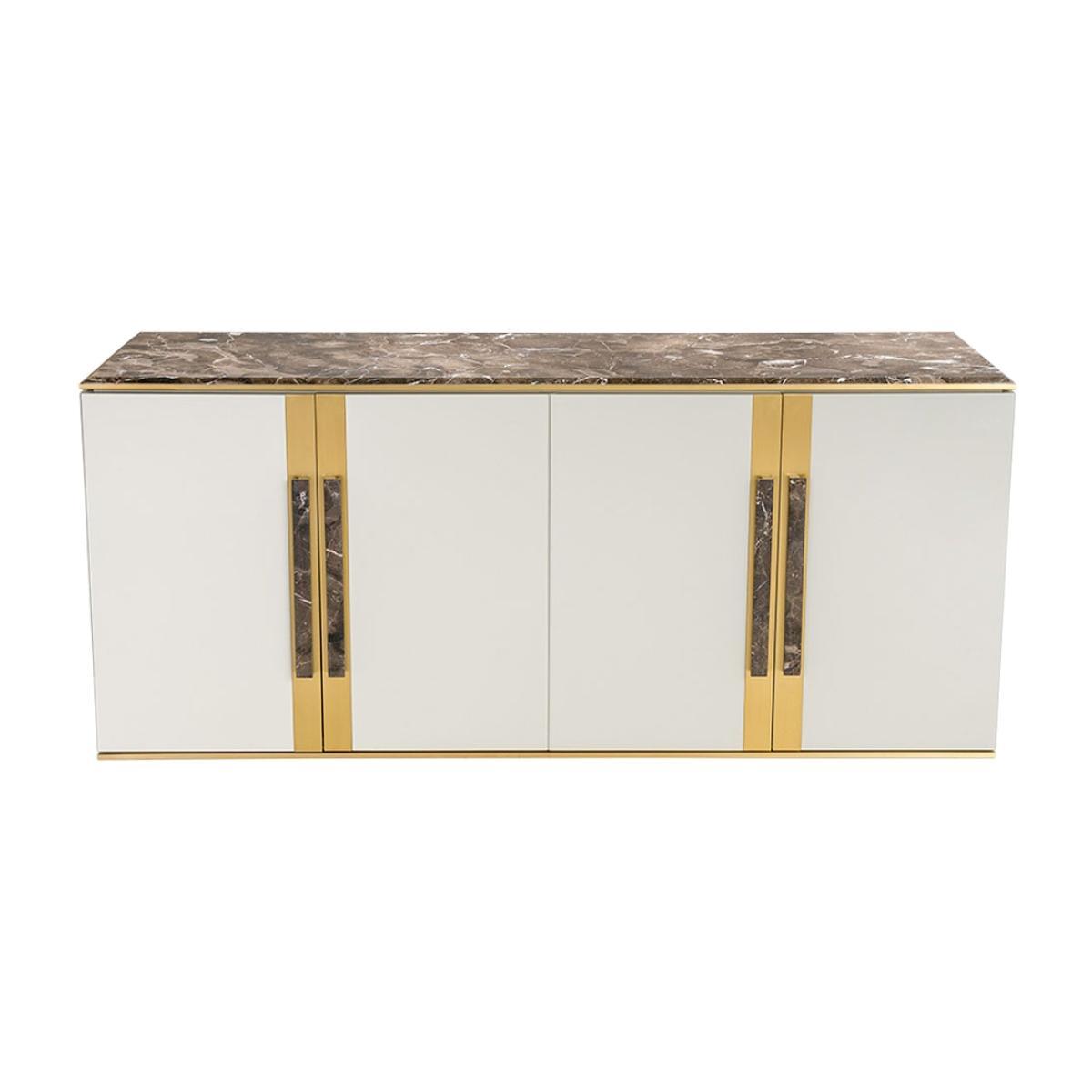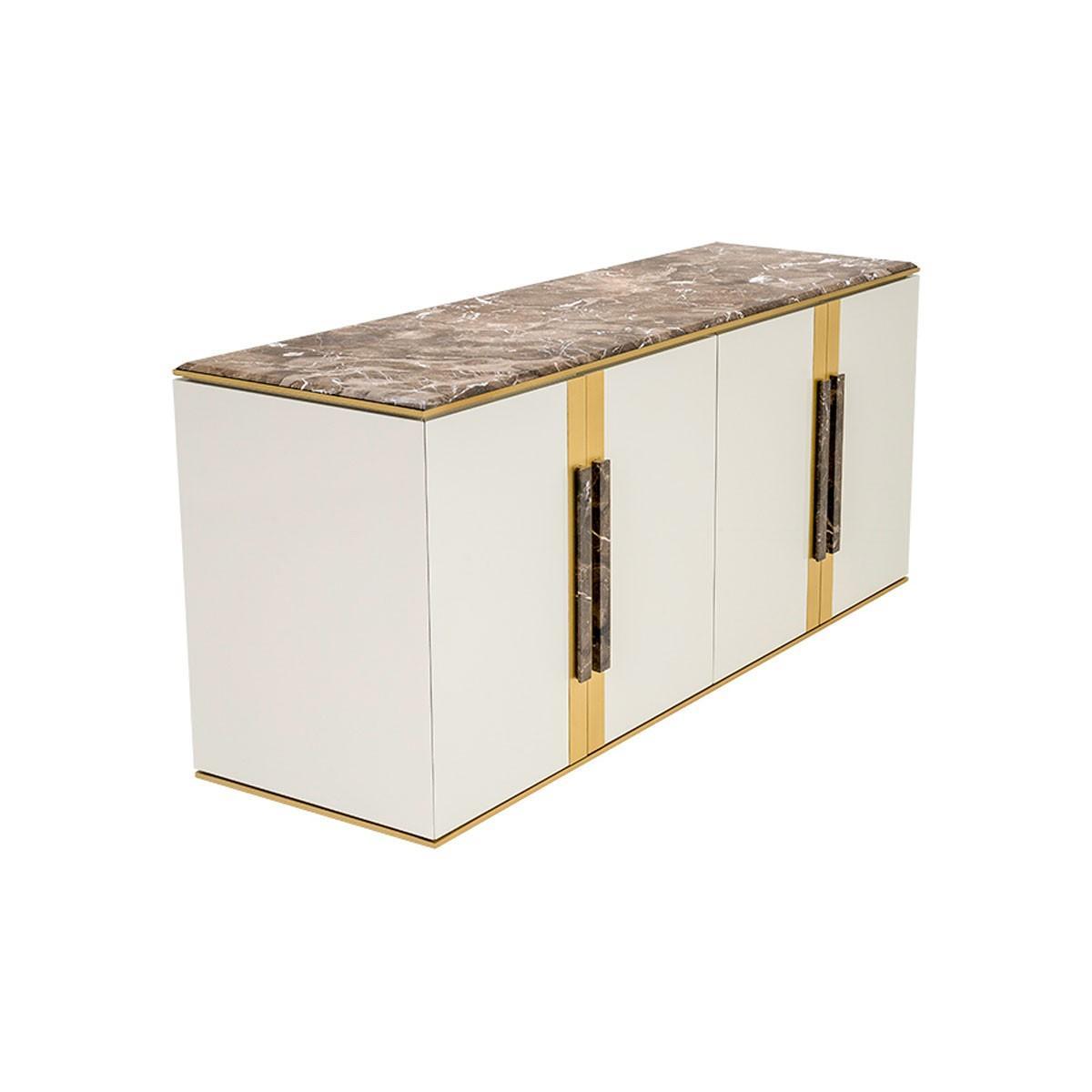 The Lago sideboard with high gloss lacquered doors and brushed brass metal detailing. The sideboard's top is here shown in Marron Imperador marble. The internal cupboard and drawers are lined in suede.
