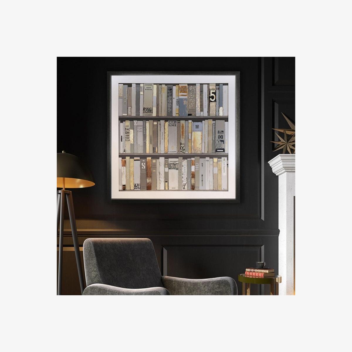 By Sabrina Roscino, a framed wall art piece that portrays a tightly packed bookshelf. Featuring a glazed finish with hand-embellished copper foil highlights and a dark metallic frame. Immerse yourself in the charm of by Sabrina Roscino, a beautifully detailed wall art piece that captures the timeless allure of a well-loved bookshelf. Tightly packed with books, the neutral palette of this artwork brings a sense of warmth and character to any space. A glazed finish enhances the depth of the design, while copper foil highlights add a touch of elegance and shimmer. Framed in a sleek metallic frame, is both a celebration of literary nostalgia and a stylish decorative element. Perfect for living rooms, studies or libraries, this piece adds texture, sophistication and a love of books to your home. by Sabrina Roscino, a framed wall art piece that portrays a tightly packed bookshelf. Featuring a glazed finish with hand-embellished copper foil highlights and a dark metallic frame. Immerse yourself in the charm of by Sabrina Roscino, a beautifully detailed wall art piece that captures the timeless allure of a well-loved bookshelf. Tightly packed with books, the neutral palette of this artwork brings a sense of warmth and character to any space. A glazed finish enhances the depth of the design, while copper foil highlights add a touch of elegance and shimmer. Framed in a sleek metallic frame, is both a celebration of literary nostalgia and a stylish decorative element. Perfect for living rooms, studies or libraries, this piece adds texture, sophistication and a love of books to your home.