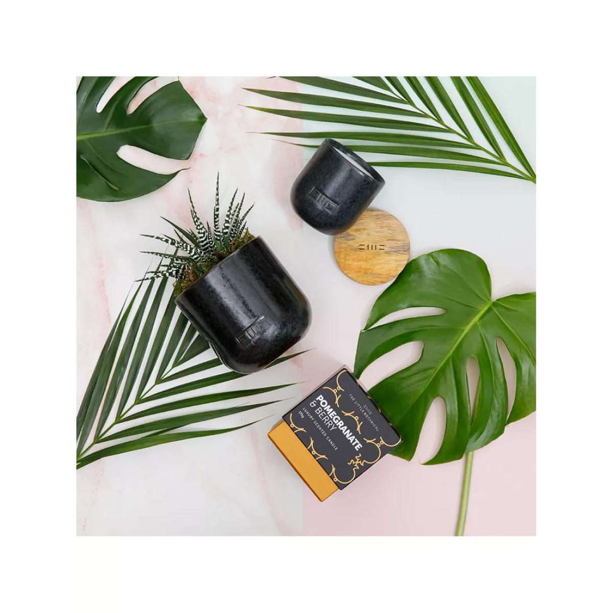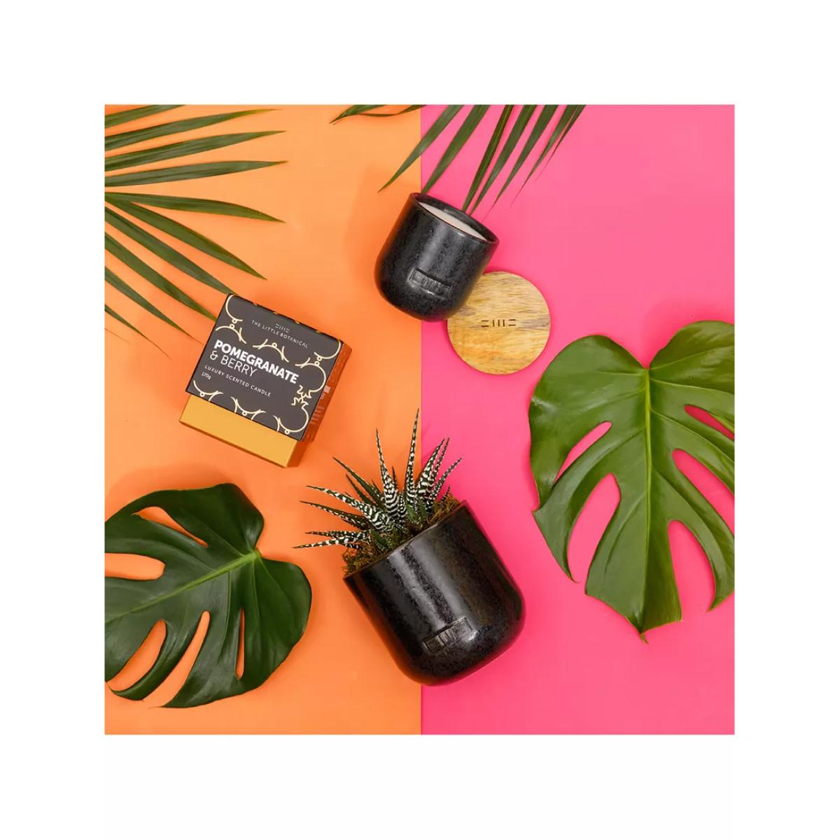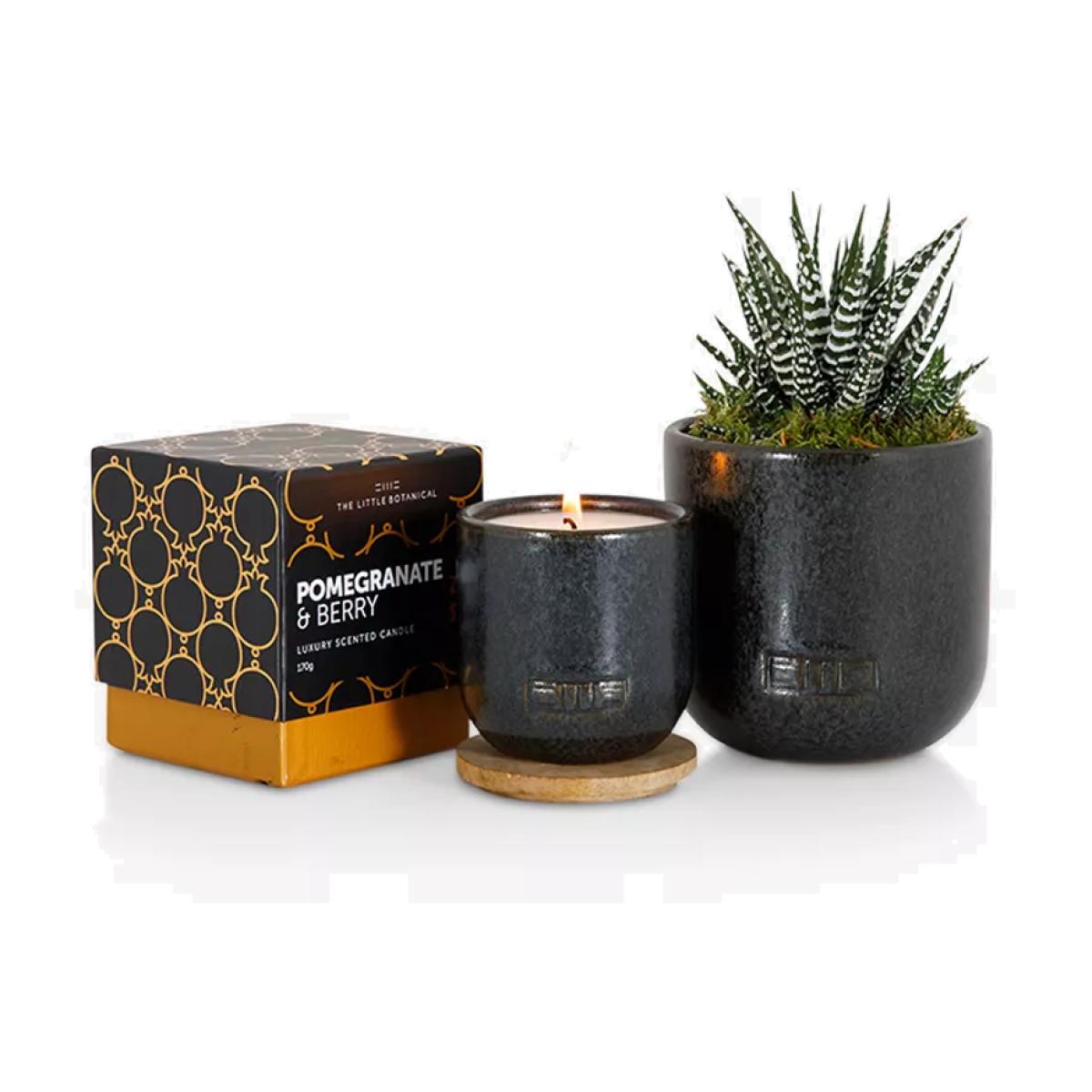Stimulate your body and mind with the warming and sensual glow of this Back to Black Candle Gift Set. The candle has an invigorating aromatic blend of pomegranate, musk, cedarwood, lemon and raspberry which will permeate throughout the room. It's paired with a super easygoing Haworthia succulent that's potted in a matching glazed ceramic pot. With a firm rough texture this hardy little guy is a wonderful addition to any indoor jungle! The Little Botanical candles are made with a blend of vegetable and mineral wax with a single wick and are poured into gorgeous glazed ceramic pots. Each candle comes with a protective mango wood lid you can use under the candle to protect surfaces and is presented in a beautifully designed box. They're designed and poured in the UK in hand-finished bespoke ceramics made in Portugal and come in beautiful packaging that's fully recyclable.