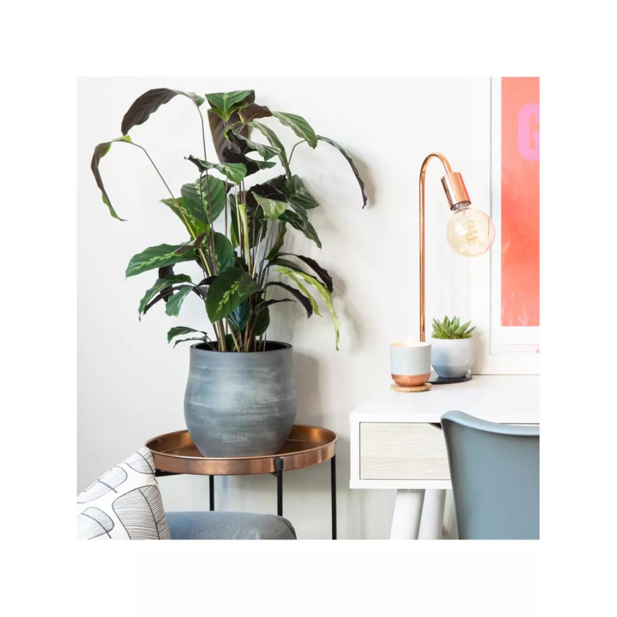 This Calathea is all about the leaves, also known as the prayer plant, their leaves are beautifully patterned, much like a painting we think! These stunning leaves close up at night, hence its nickname of prayer plant. This plant spends much of its life under the dense jungles of South America. The underside of the leaves is as interesting to look at as the top, so think about placing it somewhere where you can get a glimpse of both. It doesn’t want to be in full sunlight so indirect light will suit it fine. If you have pets, then the Calathea is a great plant to add to your collection as it’s pet-friendly too. As this is a natural plant from a mix, the variety of Calathea will vary from the photos shown. We think all of their patterns are beautiful! H60 x W36 x D35 cm Please note: This plant and pot will come in separate boxes, you simply drop the plant in its growing pot, into the ceramic and it is ready for its forever home! The ceramic is sized to allow the growth of the plant. Please note: the pattern, colour and texture of the ceramic pots will vary as they are all hand made, making each and every one unique. Don’t think of these as flaws, we think they are just as lovely as each other. This beautiful big Calathea should be watered once every 7-10 days and we’d suggest you keep checking the soil especially during Summer to ensure it hasn’t dried out. A medium-lit spot with indirect light is perfect for these beauties – just be careful in the Summer months as they don’t love direct sun, as it can scorch their leaves. Treat him to a little mist every week or so to keep those leaves looking lush and don’t forget to dust them too! Trim off any discoloured leaves as they grow to ensure they look perfect and encourage new growth too! Don’t forget to keep them out of draughts and away from radiators. They’ll thrive in medium light and high humidity so are perfect for a bathroom or kitchen. This stunning big Calathea houseplant is the perfect addition to bring the outside in and is sure to add unique style to your home office or living space. Caring for your plant Always follow the attached care instructions. Whilst this will give your plants the best chance of thriving, environmental factors will also play a big impact on your plant's life span such as exposure to sun and humidity. Please note: As plants are a live product, the dimensions and images provided are estimates only as each plant is unique. Refund policy We can't offer refunds or exchanges on perishable goods such as flowers and food, unless faulty or not as described. Find out more. This does not affect your statutory rights.