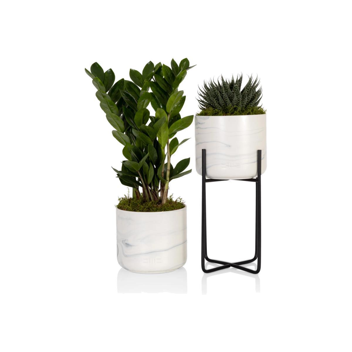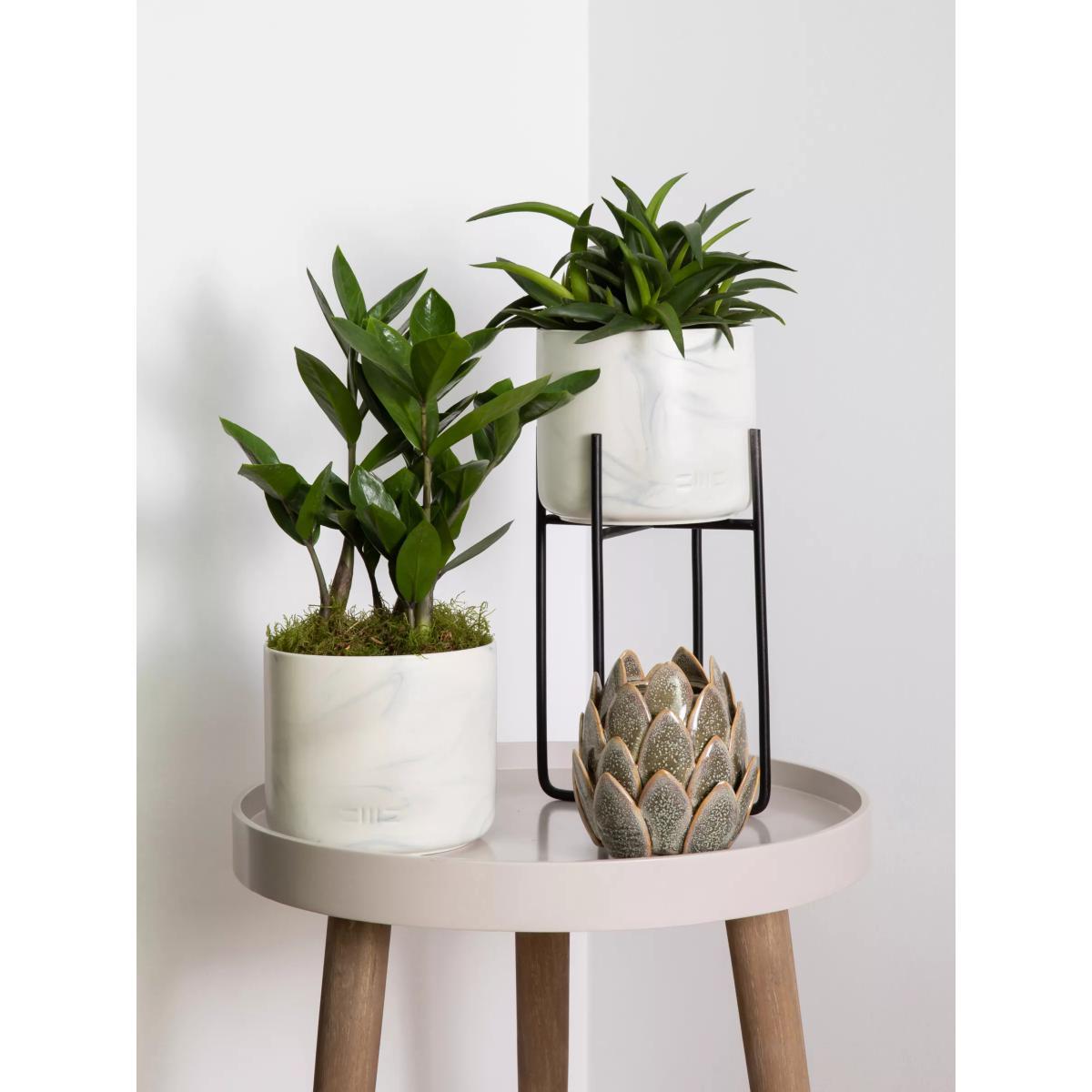 This easy to look after plant gang in marble planters includes a Large Haworthia Succulent planter stand and a Zamioculcas Houseplant. These stylish marble planters and black metal stand are the latest products from The Little Botanical's new collection. The plants themselves are chosen to be perfect for both beginners and experienced plant parents alike, they only need watering once every few weeks and only once the soil is dry. Place in a spot in your home that gets some light to get the most out of your new plants. Perfect as a pair, the plant stand and matching planter will bring a contemporary update to your home. Zamioculcas Estimated plant height: 30-40cm Internal pot diameter: 13.5cm Pot height: 13cm Large Haworthia Succulent Estimated plant height with stand:37cm Internal pot diameter: 13.5cm Pot height without stand: 13cm Pot height with stand: 32cm Worth knowing: The plants and plant stand may arrive in separate boxes. Just pop the planter on the stand and it's ready for its forever home. Care Instructions The Haworthia Succulent only needs watering once every 3-4 weeks. Please ensure the plant is watered into the soil, not over the top of the leaves. The Zamioculcas houseplant is one of the easiest plants to look after should only be watered sparingly. Water every 14-21 days and only once the top of the soil is dry. Overwatering can cause the leaves to turn yellow. Unlike other houseplants, the Zamioculcas Houseplant can handle either good light or a shadier corner. How to add a personal message to your plant Place your order Immediately email your gift message to johnlewis@thelittlebotanical.com including your order number in the email subject Caring for your plant Always follow the attached care instructions. Whilst this will give your plants the best chance of thriving, environmental factors will also play a big impact on your plant's life span such as exposure to sun and humidity. Please note As plants are a live product, the dimensions and images provided are estimates only as each plant is unique. Refund policy We can't offer refunds or exchanges on perishable goods such as flowers and food, unless faulty or not as described. Find out more. This does not affect your statutory rights. FIND KEEP GIVE - Gifts designed & curated by us Everything we are goes into everything we do, and this is showcased in our uniquely designed gifting collection. Made of a vast range of indulgent gifting products, the FIND KEEP GIVE collection is ideal whether you are looking for the perfect presents for friends and family or the ideal from me, to me item.