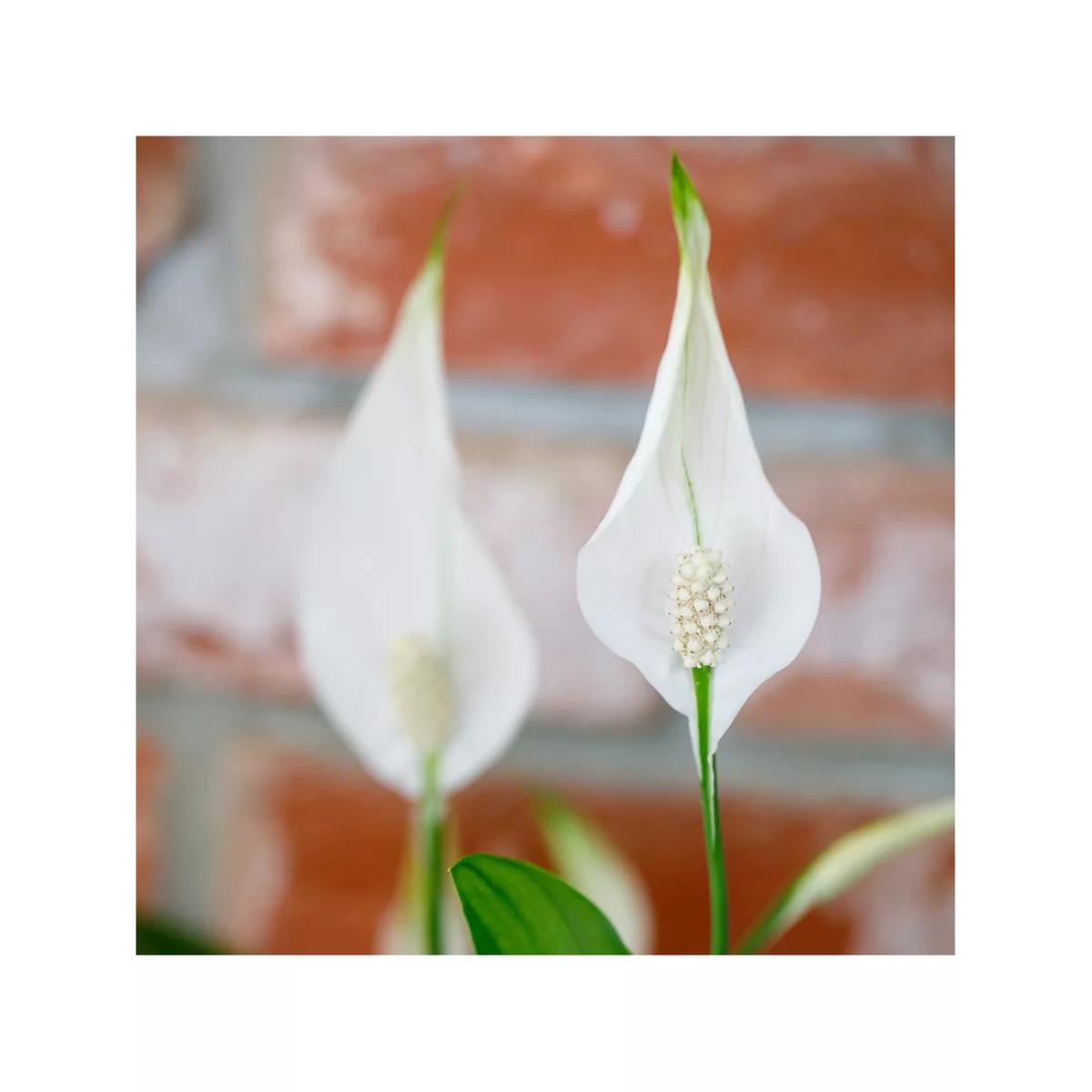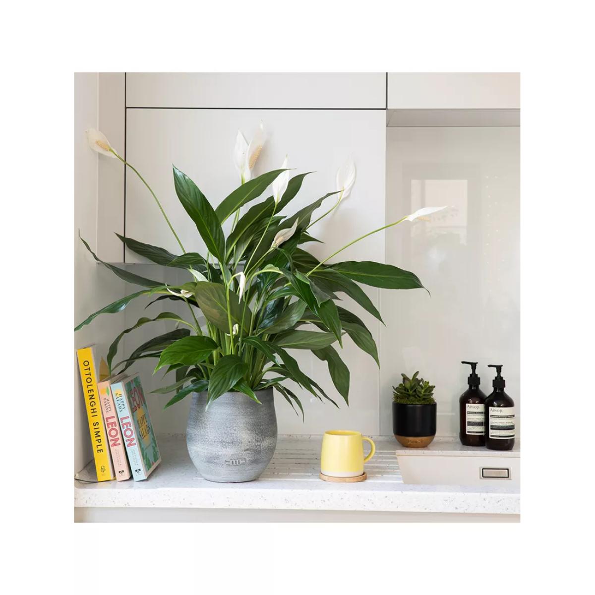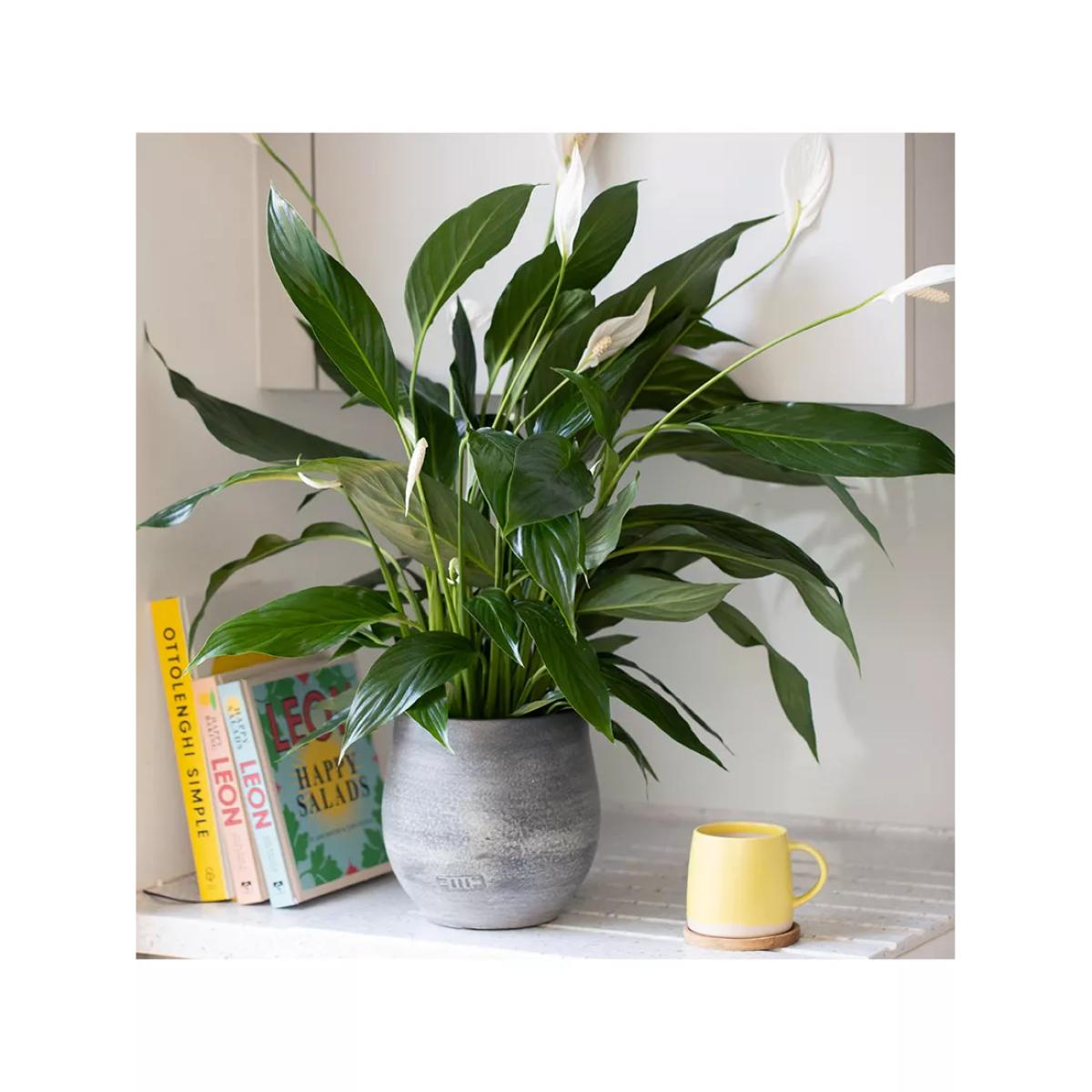 Peace lilies are afraid of being overwatered. Check the soil at least once a week to see if they need a drink. If you see the leaves starting to droop, a big drink of water will revive your Spathiphyllum. Keep out of draughts and away from radiators. Peace Lilies can be placed in most light areas in your home, more flowers will appear if kept in a brighter spot. Avoid direct sunlight in the Summer months as this will scorch the leaves. These beauties do not need frequent fertilizing. Feed one to two times a year to keep the plant happy. The striking Big Peace Lily is one much-loved houseplant, it’s super easy to read and is sure to be that statement piece in your home. Measuring approximately 50-60 cm total height, this houseplant is perfect to brighten up your kitchen worktop or bathroom corner. This plant likes to tell you if it’s unhappy, if the soil is too dry, the stems will droop, this is their way of asking for more water. Give it a good drink, ensuring you give it enough to flow through the pot so the roots get a good soaking and it will be fresh and lively again within the hour. Just be careful not to over water this leafy beauty, by letting it stand in water too long, as this can cause the leaves to discolour. Did you know that the Peace Lily aka Spathiphyllum is known as a bringer of peace; the white blooms represent the white flag which is recognised as a truce signal. Add a Peace Lily to your living space to brighten a corner and purify the air, bringing some peace and tranquillity to your home. Please note: This plant and pot will come in separate boxes, you simply drop the plant in its growing pot, into the ceramic and it is ready for its forever home! The ceramic is sized to allow the growth of the plant. Caring for your plant Always follow the attached care instructions. Whilst this will give your plants the best chance of thriving, environmental factors will also play a big impact on your plant's life span such as exposure to sun and humidity. Please note: As plants are a live product, the dimensions and images provided are estimates only as each plant is unique. Refund policy We can't offer refunds or exchanges on perishable goods such as flowers and food, unless faulty or not as described. Find out more. This does not affect your statutory rights.