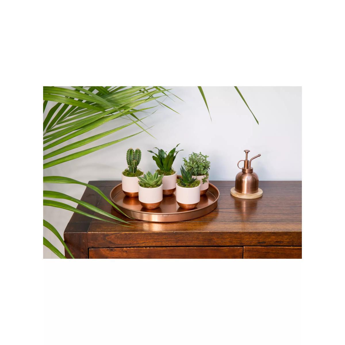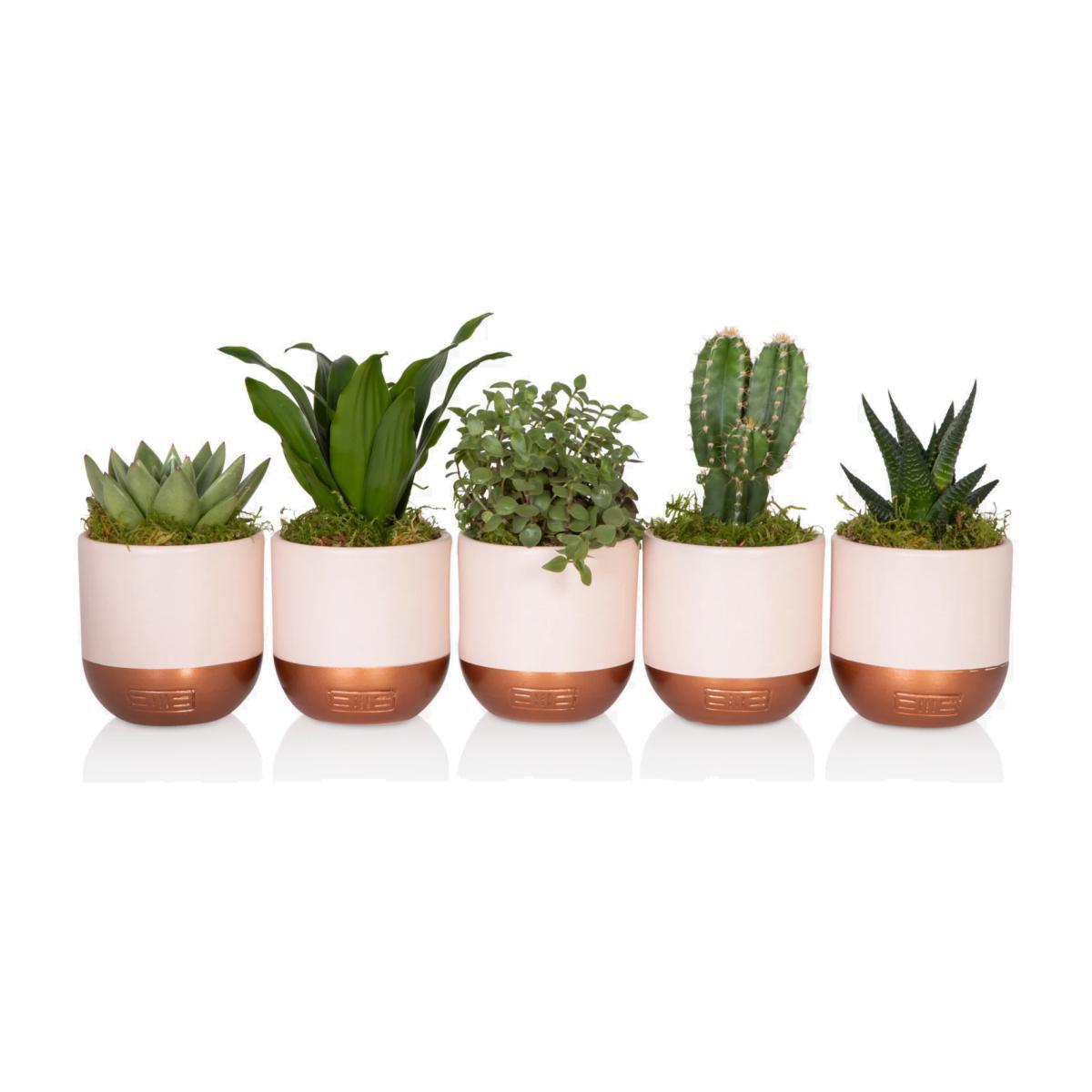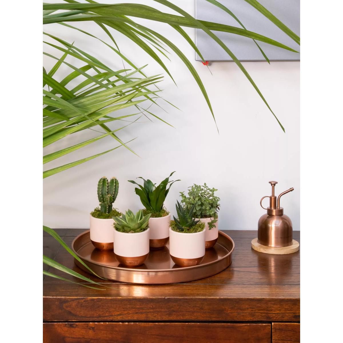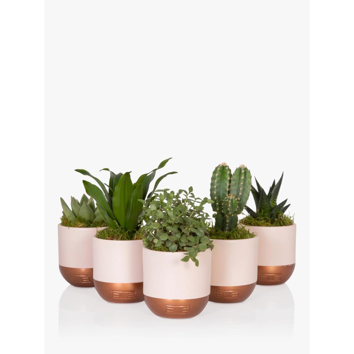 The Little Botanical Pink Shelfie Bundle is the cutest selection of succulents and cacti in their bespoke soft pink and copper ceramics. This gorgeous gang of plants will bring a little bit of love to your table or shelf and are the perfect gift. The bundle of greenery in pink pots will jazz up your living space and brighten up that corner or shelf. Whether you purchase this bundle as a gift or for yourself, these plants are the perfect size to style a shelf or coffee table. This plant gang includes: 1 x Mini Echeveria Miranda 1 x Mini Callisia Turtle/ Peperomia Rotundifolia 1 x Mini Dracaena Head 1 x Mini Haworthia 1 x Mini Cactus Measuring approximately 10-16cm total height, including the pot and 8cm wide, they are the perfect size for a shelf. These plants are known to be easy to care for but are all unique in their own way. Ideal for plant newbies or experienced plant parents, add this fun little gang of plants to your living space or send to a friend to inspire them too go green. All of these beauties are planted in pink and copper ceramics ready for their forever home. Caring for your plant Always follow the attached care instructions. Whilst this will give your plants the best chance of thriving, environmental factors will also play a big impact on your plant's life span such as exposure to sun and humidity. Please note: As plants are a live product, the dimensions and images provided are estimates only as each plant is unique. How to add a personal message to your plant Place your order Immediately email your gift message to johnlewis@thelittlebotanical.com including your order number in the email subject Refund policy We can't offer refunds or exchanges on perishable goods such as flowers and food, unless faulty or not as described. Find out more. This does not affect your statutory rights. FIND KEEP GIVE - Gifts designed & curated by us Everything we are goes into everything we do, and this is showcased in our uniquely designed gifting collection. Made of a vast range of indulgent gifting products, the FIND KEEP GIVE collection is ideal whether you are looking for the perfect presents for friends and family or the ideal from me, to me item.