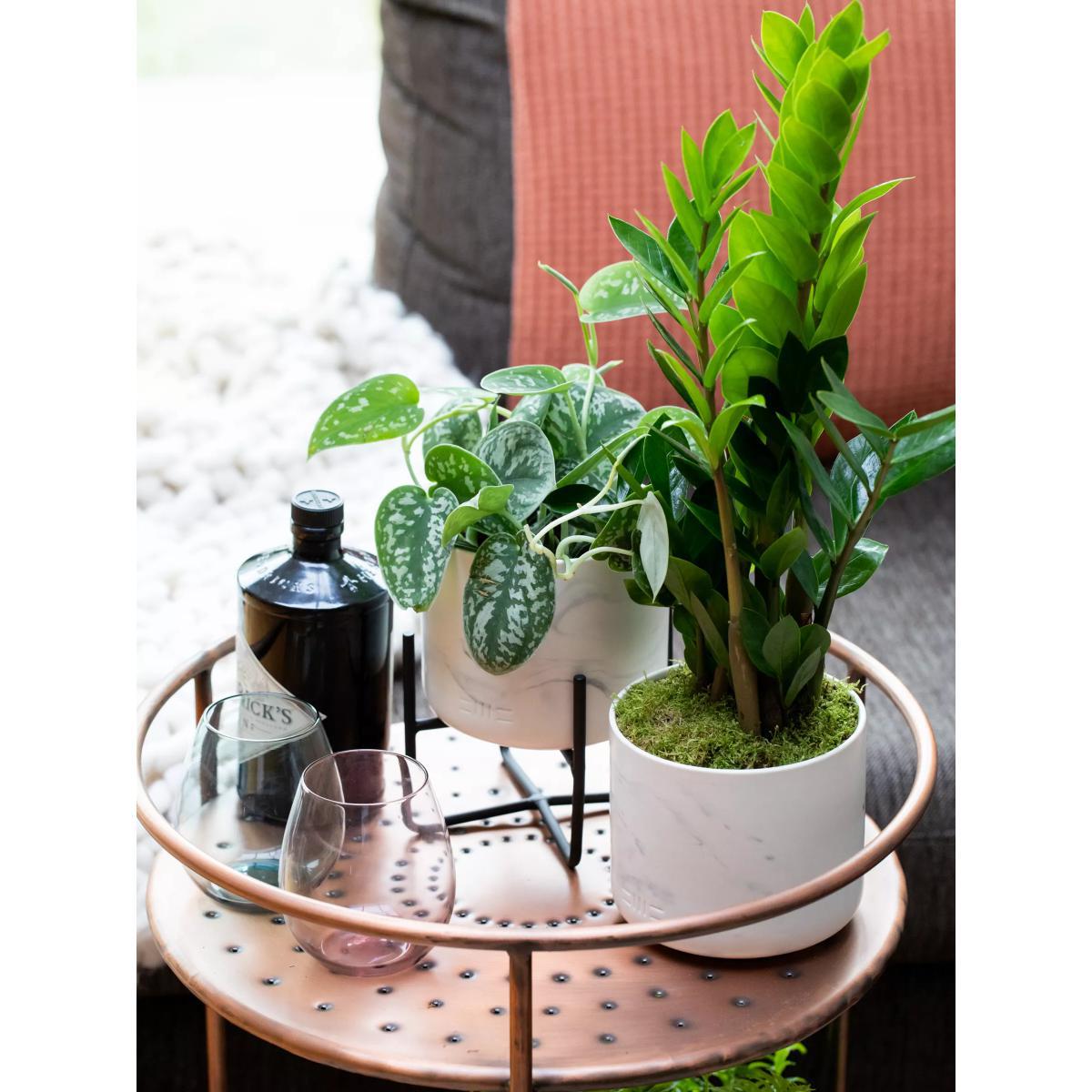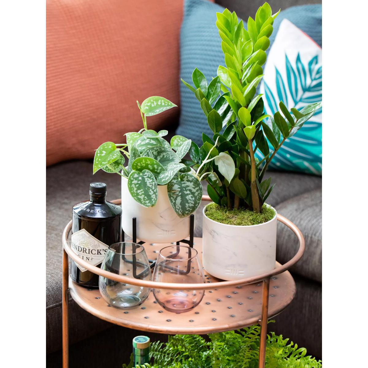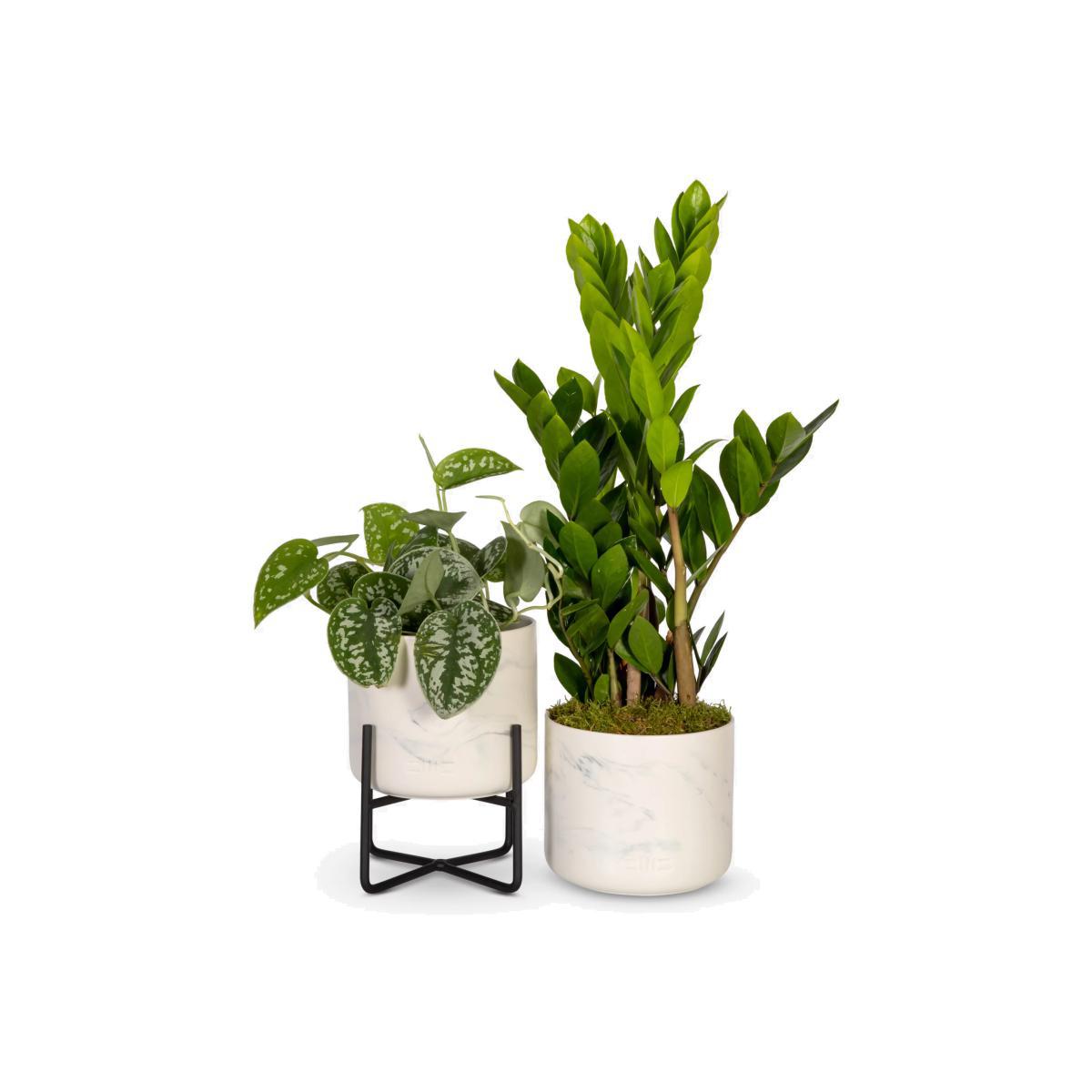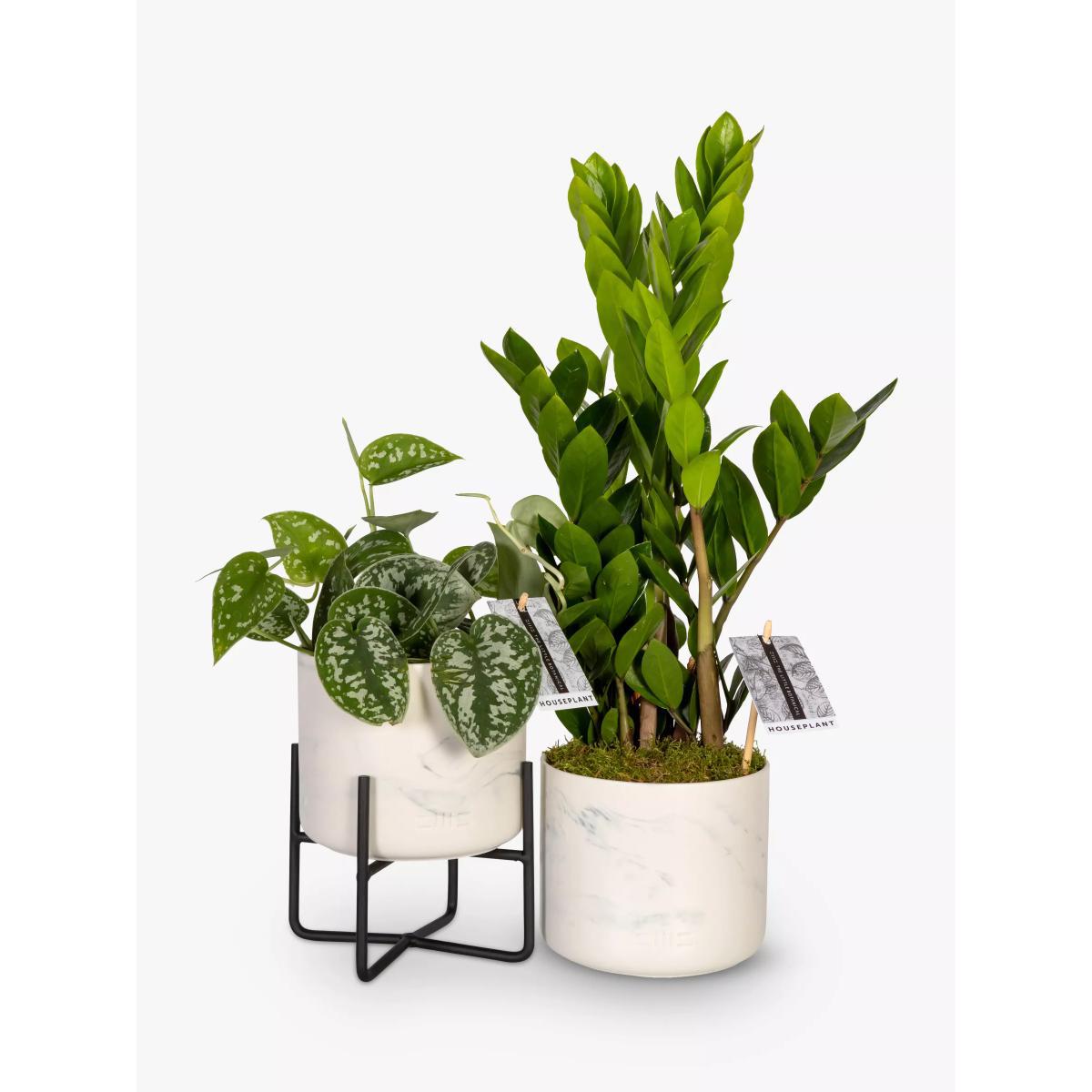 This plant pair includes a stunning Satin Pothos and a Zamioculcas. These plants are known to be super easy to care for and the gorgeous greenery just complements the Marble planters beautifully. The fast-growing trailing Satin Pothos AKA Scindapsus Pictus on the black metal stand gives him a little height adding character to your space as having plants at different heights is a perfect way to add texture and vibrancy to your home. The Satin Pothos with its silvery speckled green leaves is the ultimate must-have plant and like all Scindapsus is super low maintenance so perfect for newbie plant parents, paired with the trusty easy to care for Zamioculcas, this duo won't disappoint. Average Sizes: Zamioculcus Marble Planter:30-40cm (total height) Satin Pothos Marble Planter: 30-35cm (total height with stand). Stand height: 7.5cm The Satin Pothos likes to be in a medium-lit spot and should be watered once every 10 days and only once the soil feels slightly dry to touch. Used to a rain-forest environment, it can handle a shadier spot in your home. It's partner, the Zamioculcas is an arid loving plant and doesn't like to be overwatered. Water no more than once every 3 weeks. Caring for your plant Always follow the attached care instructions. Whilst this will give your plants the best chance of thriving, environmental factors will also play a big impact on your plant's life span such as exposure to sun and humidity. Please note: As plants are a live product, the dimensions and images provided are estimates only as each plant is unique. FIND KEEP GIVE - Gifts designed & curated by us Everything we are goes into everything we do, and this is showcased in our uniquely designed gifting collection. Made of a vast range of indulgent gifting products, the FIND KEEP GIVE collection is ideal whether you are looking for the perfect presents for friends and family or the ideal from me, to me item. Refund policy We can't offer refunds or exchanges on perishable goods such as flowers and food, unless faulty or not as described. Find out more. This does not affect your statutory rights.