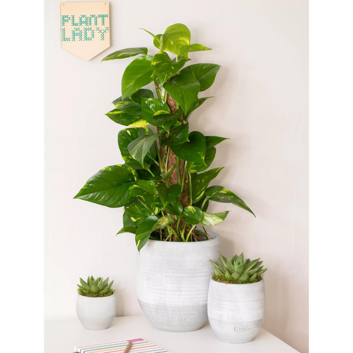 Scindapsus Aurea, more commonly known as Devil's Ivy. This stunning variegated leafy green house plant climbs up a central moss pole. These fast growing vines produce beautifully green and yellow speckled foliage which look striking with our stylish large grey ceramic. If you want to give it even more presence in your home, why not add some extra height by placing it on a small corner table. Scindapsus like regular weekly watering and although will survive a shady location, they really thrive and will give you good growth in a well-lit spot in your home! The Scindapsus plant and ceramic pot will be delivered in separate boxes. Just drop the plant into the ceramic and your indoor green statement is ready to go! Estimated plant height: 35-45cm Internal pot diameter: 15cm Pot height: 22cm How to add a personal message to your plant Place your order Immediately email your gift message to johnlewis@thelittlebotanical.com How to add a personal message to your plant Place your order Immediately email your gift message to johnlewis@thelittlebotanical.com including your order number in the email subject Caring for your plant Always follow the attached care instructions. Whilst this will give your plants the best chance of thriving, environmental factors will also play a big impact on your plant's life span such as exposure to sun and humidity. Please note As plants are a live product, the dimensions and images provided are estimates only as each plant is unique. Refund policy We can't offer refunds or exchanges on perishable goods such as flowers and food, unless faulty or not as described. Find out more. This does not affect your statutory rights. FIND KEEP GIVE - Gifts designed & curated by us Everything we are goes into everything we do, and this is showcased in our uniquely designed gifting collection. Made of a vast range of indulgent gifting products, the FIND KEEP GIVE collection is ideal whether you are looking for the perfect presents for friends and family or the ideal from me, to me item.