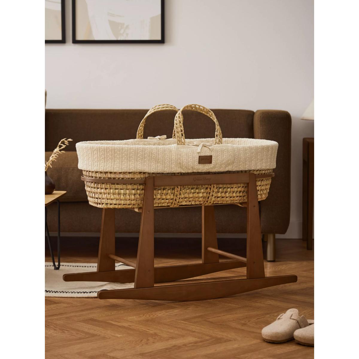 This Moses Basket Rocking Stand, in natural beech solid wood, is the perfect addition to any nursery. While your baby is settled in their Moses basket, you can rock them gently to sleep. It features wooden retaining bars that keep the Moses basket safe and secure. Rocks back and forth for a comforting night's sleep Natural beechwood Fits Little Green Sheep's Organic Cotton Knitted and Natural Quilted Moses Baskets (sold separately) Self-assembly required Meets BS EN 1466:2023 Please note: The stand is designed for use with a palm or wicker Moses basket of min/max 710-810mm in length and 320-350mm in width. The maximum recommended weight of the child is 9kg (20lbs). This product is suitable only for a child who cannot sit up unaided, roll over and cannot push himself up on its hands and knees. Only use on a firm, horizontal level and dry surface. Do not let other children play unattended near the carrycot / Moses basket and stand.