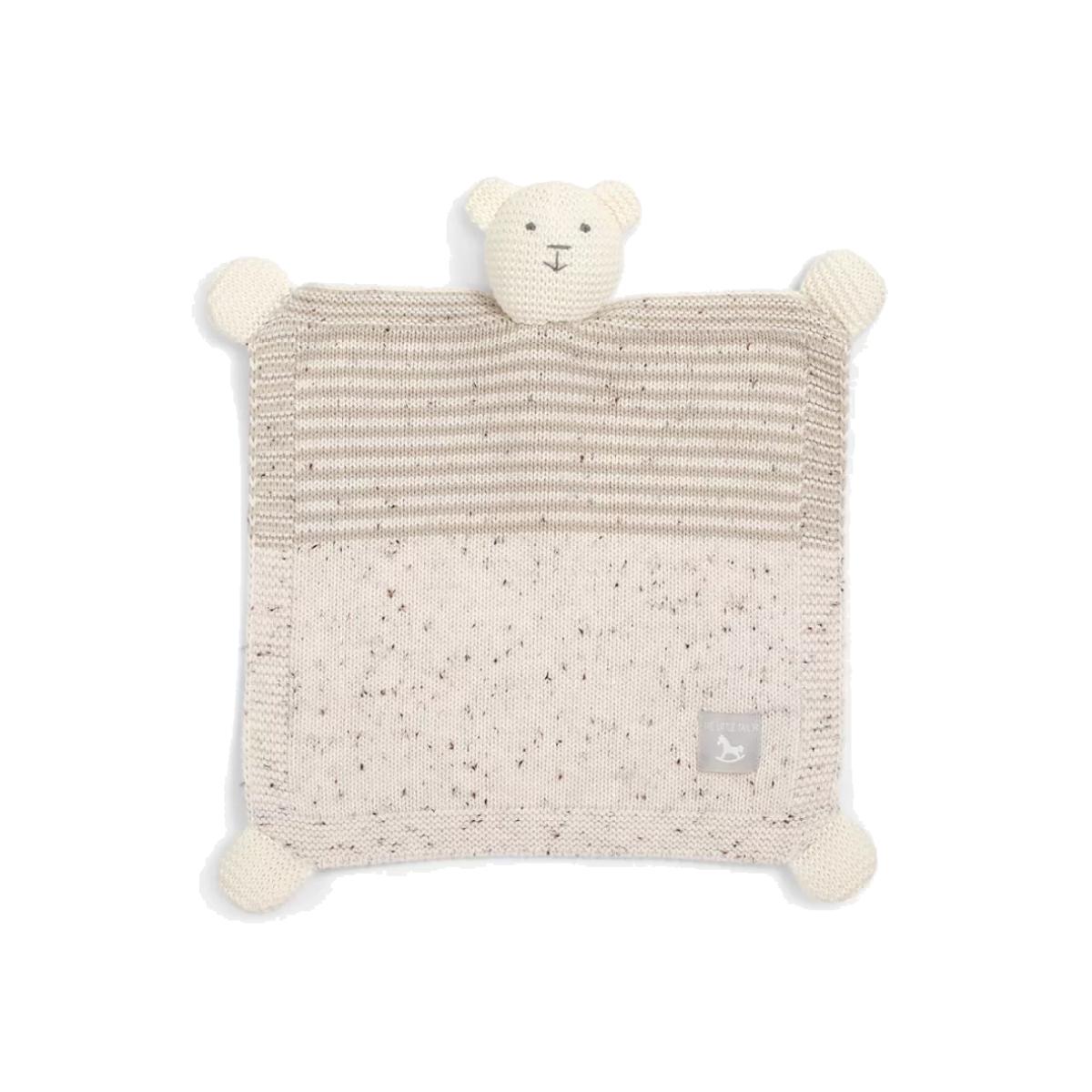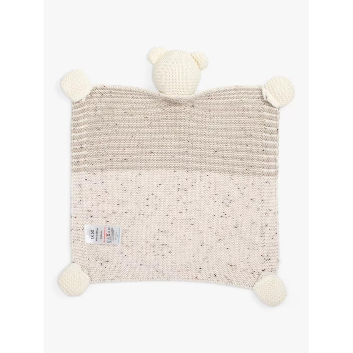 A super-soft knitted comforter with teddy bear detailing. The bear's face is hand-stitched making each one unique and little teddy paws, in each corner, are perfect for little hands to grip and play with.