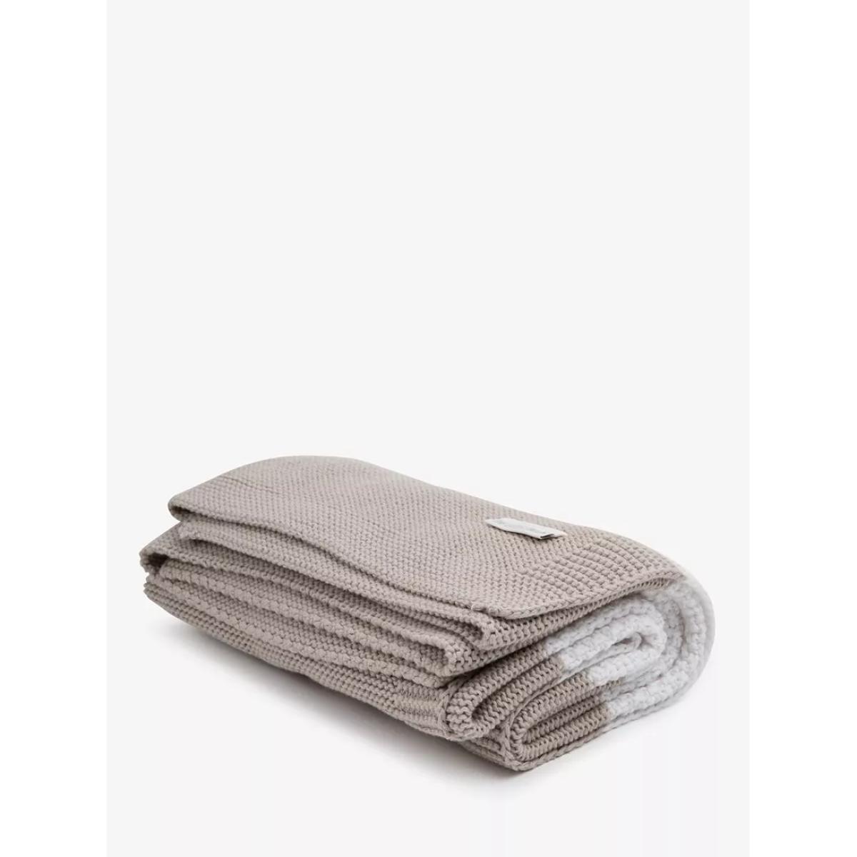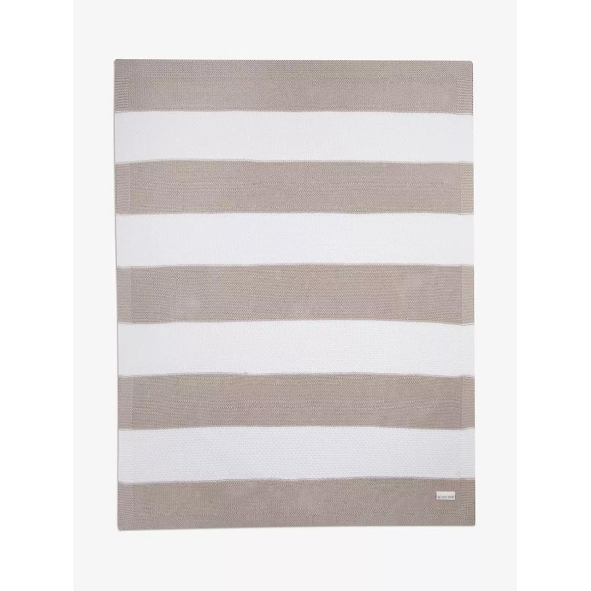 A large supersoft knitted baby blanket made with 100% cotton. Designed with a contrast stripe, an ideal extra layer of warmth. Wrapped in a ribbon, it makes a great gift.