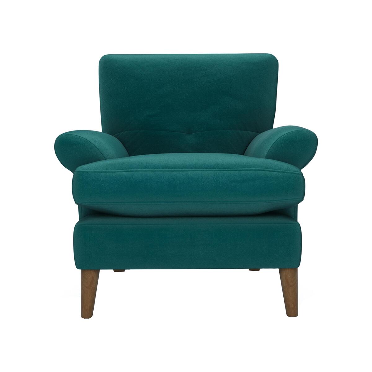 I love this teal Joshua armchair for its clean lines and gently curved arms, which give a modern nod to a mid-century scheme. The deep teal fabric works equally well in neutral schemes as it does against richer jewel tones, making it a versatile focal point rather than a competing colour splash. For styling, tuck it next to a slim oak side table with a ceramic lamp and layer a geometric cushion or wool throw for extra comfort. It sits beautifully on a natural-fibre rug and pairs neatly with warm timber furniture and brass accents to complete a balanced, lived-in look.