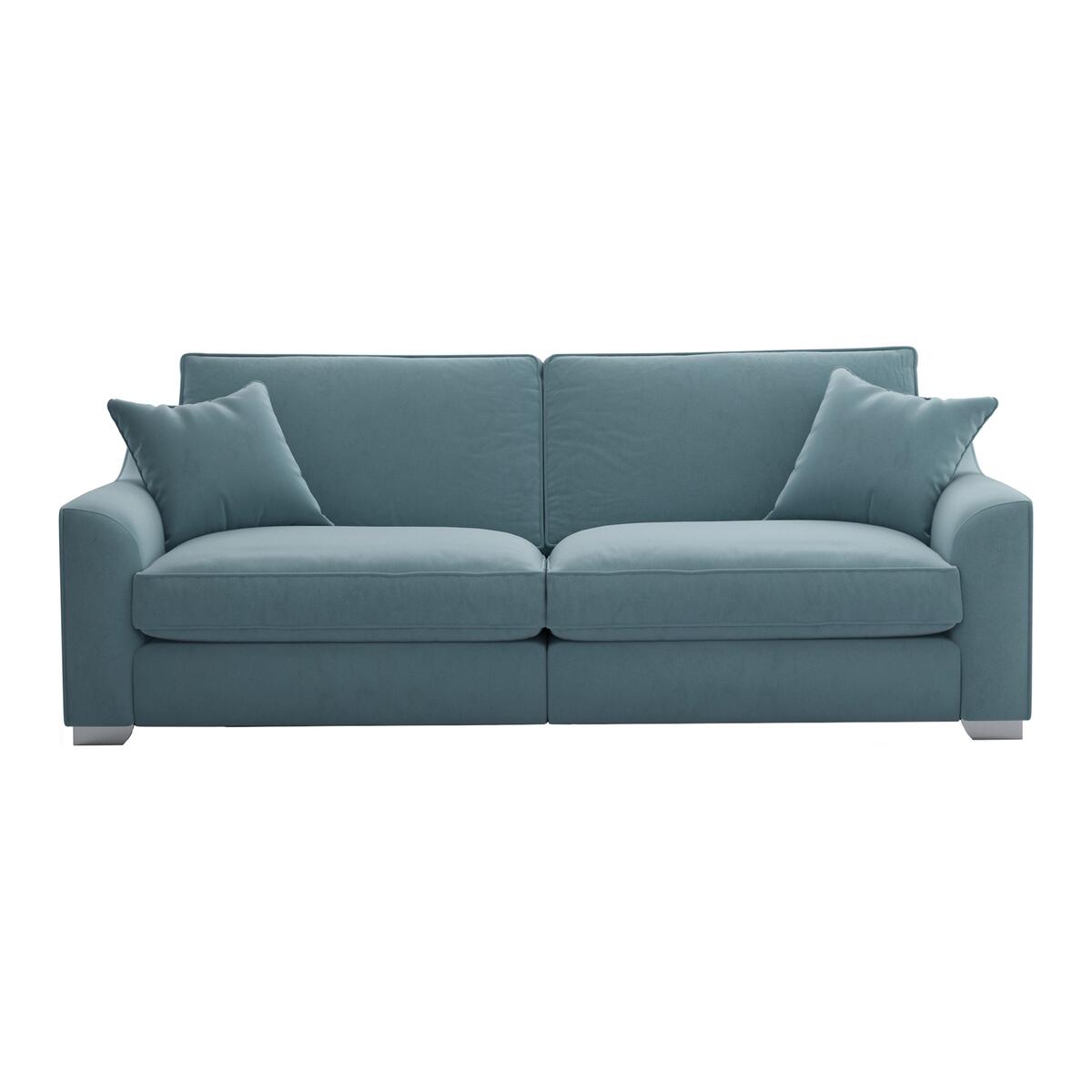 Inviting, deep- seated modular design Luxuriously soft fabric upholstery Handcrafted in Britain Modern, sophisticated and deeply luxurious, The Lounge Co. Isobel Four Seater Fabric Sofa is your one- way ticket to complete relaxation, every day. From the deep, fibre- filled seat cushions and supportive sprung seats to the plush, soft- feel fabric upholstery and foam and fibre- filled back cushions, youll find indulgent comfort in every fold. With two feather- filled scatter cushions too, your comfort is in good hands. And if you love contemporary style, youll fall in love with this sofas plush, modern style. With stylish chrome feet, crisp, tailored piping and clean lines to admire and indulge in, it promises to take centre stage in your living room. Handcrafted in Britain, youll find the works of skilled hands in every stitch and seam. If youd like to create a different look for your sofa, we have plenty of options. Only available at Furniture Village, this handcrafted four seater fabric sofa is part of the plush and contemporary Isobel range from The Lounge Co. Top tip: Some fabrics can show wear on areas of more use or in direct sunlight. To keep your fabric upholstery looking fresh, plump, turn and rotate seat and back cushions regularly if possible.