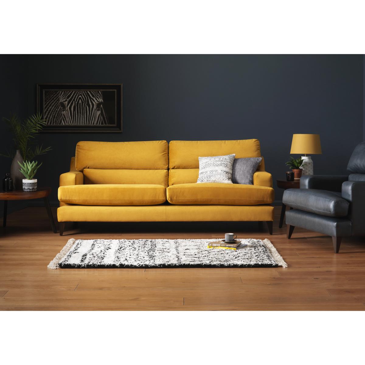 Modern and oozing with contemporary style,The Lounge Co. Romilly range is perfect for the style-conscious and comfort-seekers alike. Lend your space sophisticated style with its clean-lined silhouette and plush upholstery. Foam-filled seats and fibre-filled back cushions with lumbar support create a truly comfortable sit. Boxy arms and tapered legs complement its high back design, creating the perfect contemporary sofa. Available in a choice of stylish fabrics, leathers and colours and with a selection of leg options and a fibre interior. Exclusively handcrafted in Britain for Furniture Village. Effortlessly cool and contemporary, our Romilly four-seater sofa brings incredible comfort and fabulous contemporary style to any living room. Only at Furniture Village. Why you'll love it Cool, contemporary and so very comfortable. Modern silhouette suits all kinds of living spaces. Ultra-soft fabric upholstery in a wide choice of fashionable colours. High-back comfort with deep and well-cushioned seats. Back cushion design provides extra lumbar support. With stylish box arms and tapered walnut-finish wood legs. This sofa is also available with 100% leather upholstery. Handcrafted in Britain exclusively for Furniture Village. This 4-seater fabric sofa is part of The Lounge Co. Romilly range. What you need to know Medium comfort level. Seat suspension: serpentine springs. Seat cushioning: foam. Back support: elastic webbing. Back cushioning: fibre. To maintain cushion fullness, be sure to plump daily. Some fabrics can show wear on areas of more use or in direct sunlight. Flattening and shading of heavy wear areas on pile fabrics is unavoidable. Clean regularly using a soft brush or vacuum with the curtain attachment. Deal with any spills promptly. Professional cleaning advised for oil- and grease-based stains. Please read our upholstery care guide for more advice.