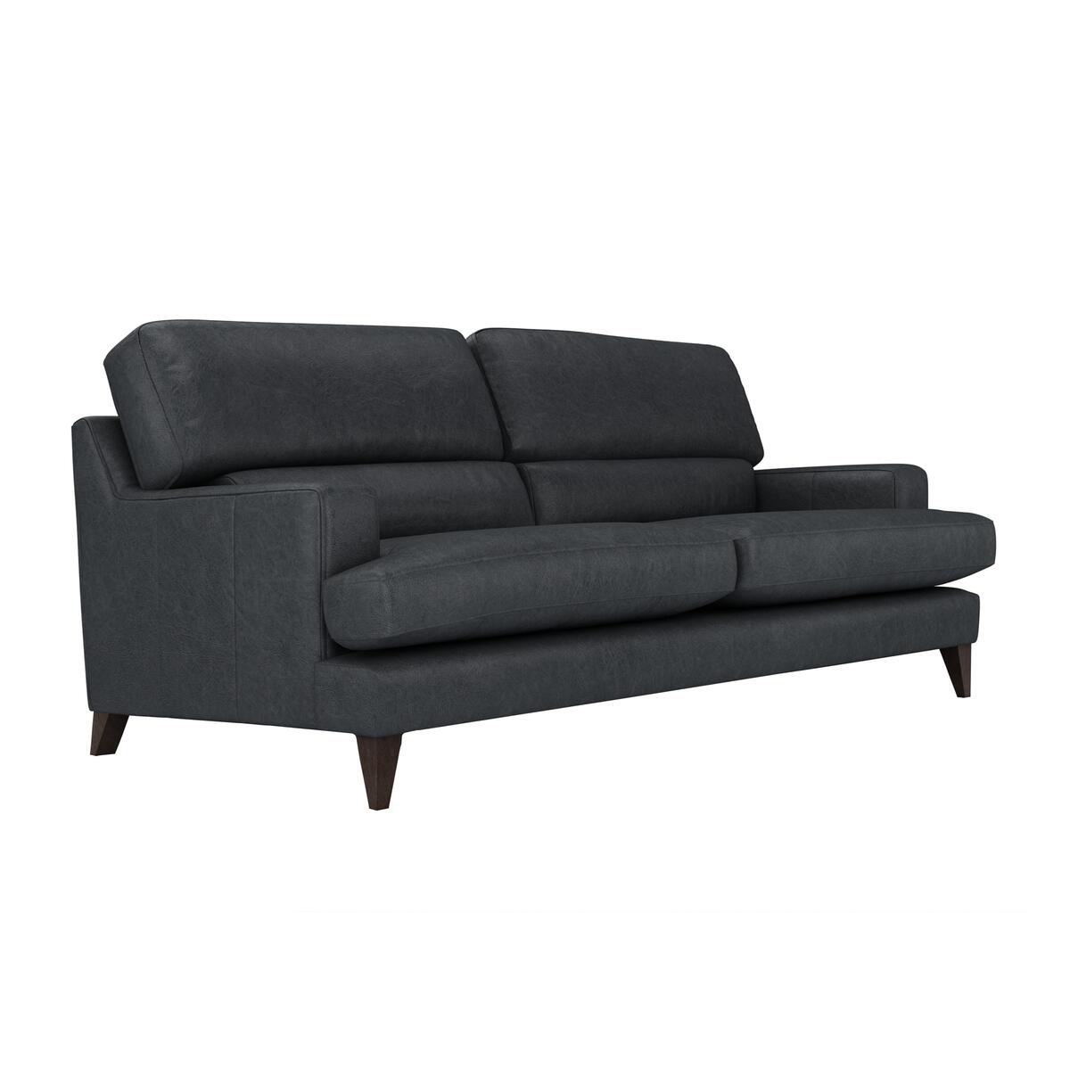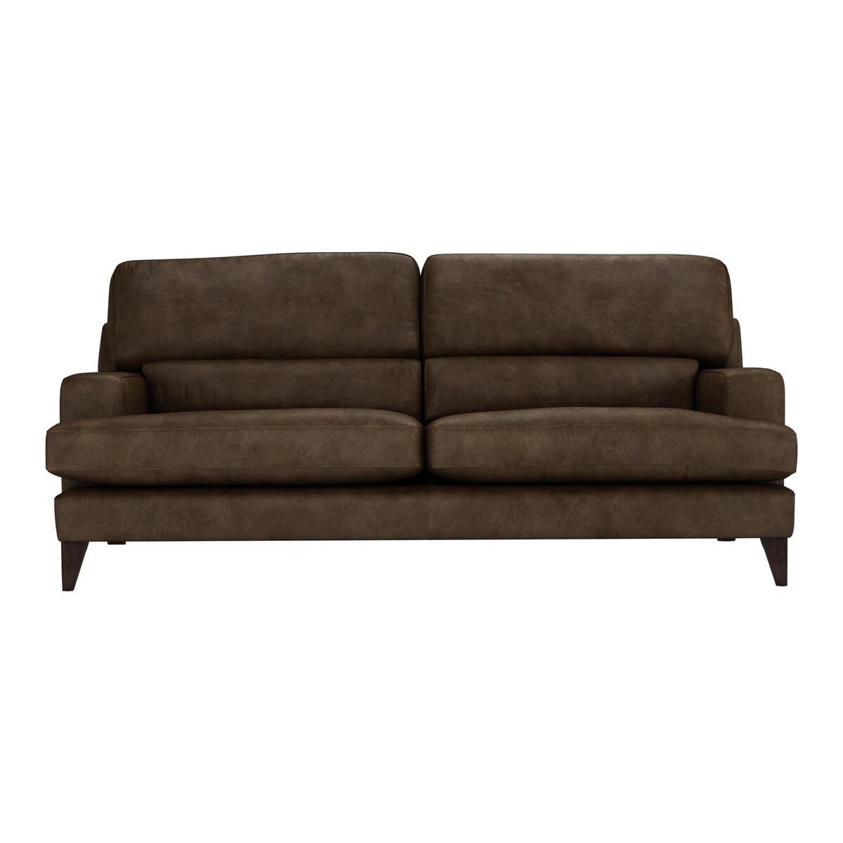Modern and oozing with contemporary style, The Lounge Co. Romilly range is perfect for the style-conscious and comfort-seekers alike. Lend your space sophisticated style with its clean-lined silhouette and plush upholstery. Foam-filled seats and fibre-filled back cushions with lumbar support create a truly comfortable sit. Boxy arms and tapered legs complement its high back design, creating the perfect contemporary sofa. Available in a choice of stylish fabrics, leathers and colours and with a selection of leg options and a fibre interior. Exclusively handcrafted in Britain for Furniture Village. Modern design with lumbar cushion. Soft, semi-aniline leather upholstery. Handcrafted in Britain. The Lounge Co. Romilly Four Seater Leather Sofa ticks a lot of boxes. If you love modern style and sinking into perfect comfort every day, this sofa was made for you. Indulge on the fibre-filled back cushions and foam-filled seat cushions and feel supported by the lumbar cushion and high back design. The roomy sprung seats complete this sofa’s indulgently comfortable feel. Its soft leather upholstery and sleek, clean lines create a modern silhouette that looks stunning in a range of spaces. The contemporary box arms and tapered walnut legs lend a plenty of style points to your space too. Handcrafted in Britain by expert craftsmen, you can rely on this sofa’s quality finish for your comfort for years to come. Exclusive to Furniture Village, this stylish, beautifully handcrafted four seater leather sofa is part of the modern Romilly range from The Lounge Co. Did you know?. Natural leather has unique marks and characteristics with variance in colour and texture, and softens with use.