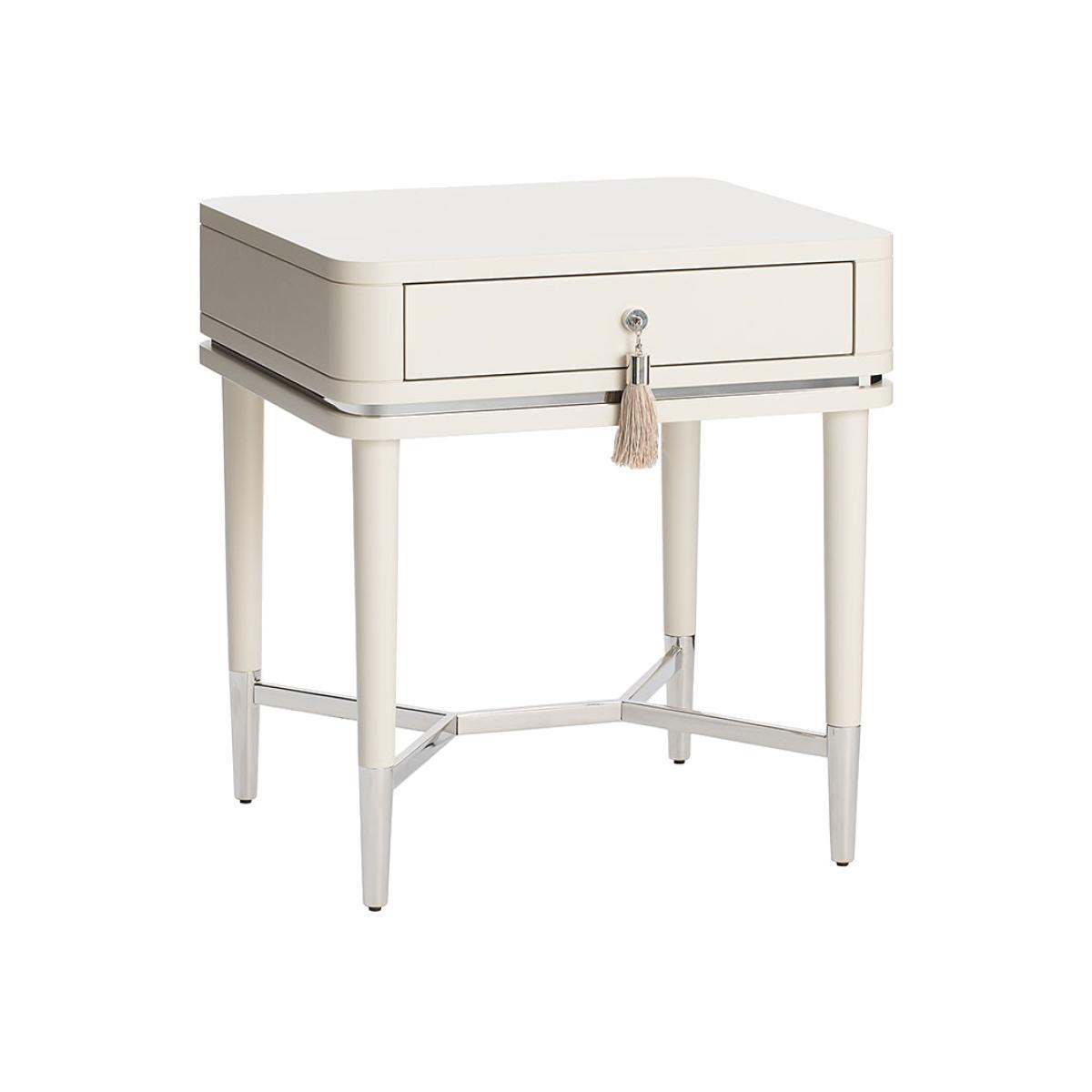 The Luzia bedside table comes in a variety of finishes. Here shown in a matt lacquer with polished stainless steel stiletto feet, handle and inlay detail. The draw is lined in suede and finished with a handle tassel.