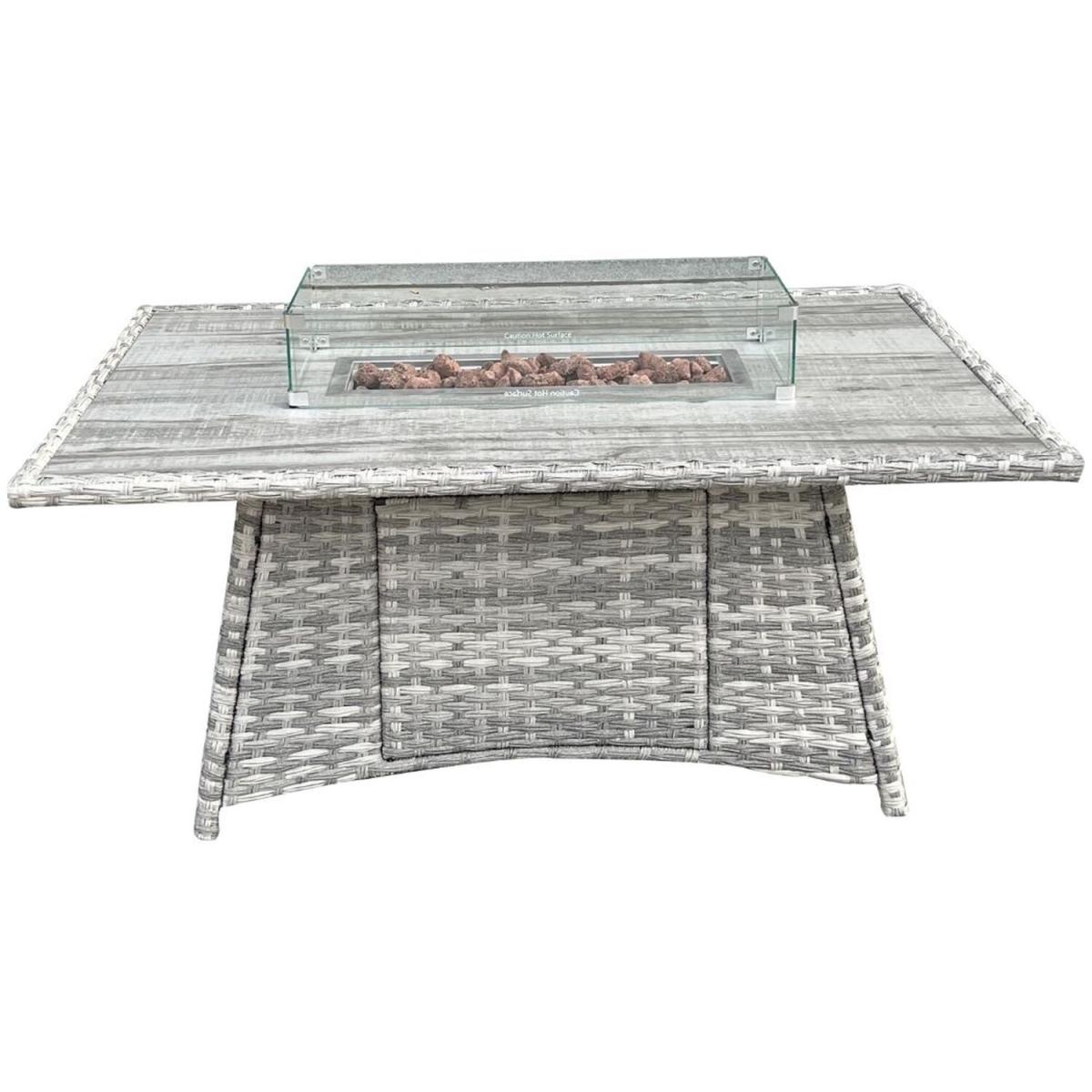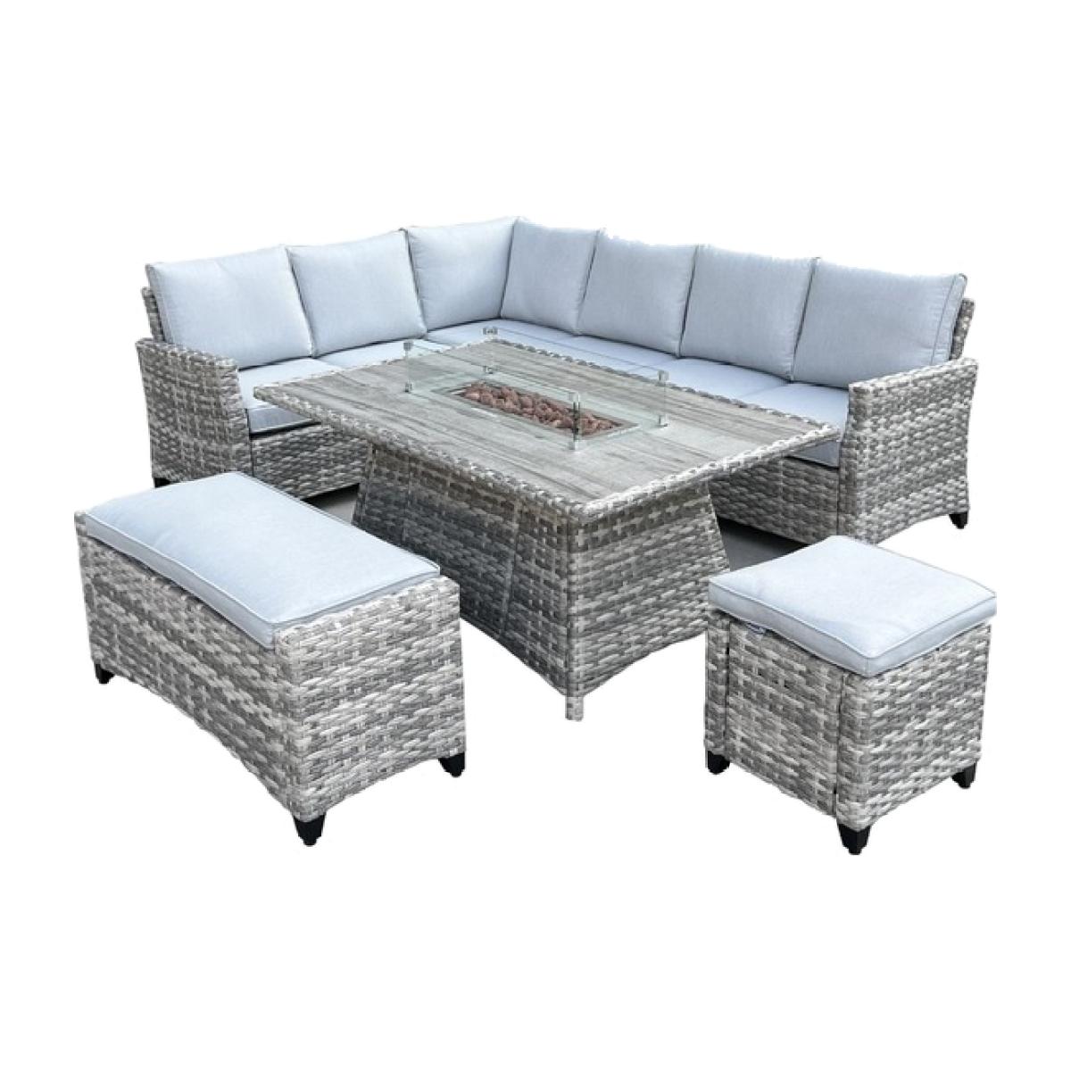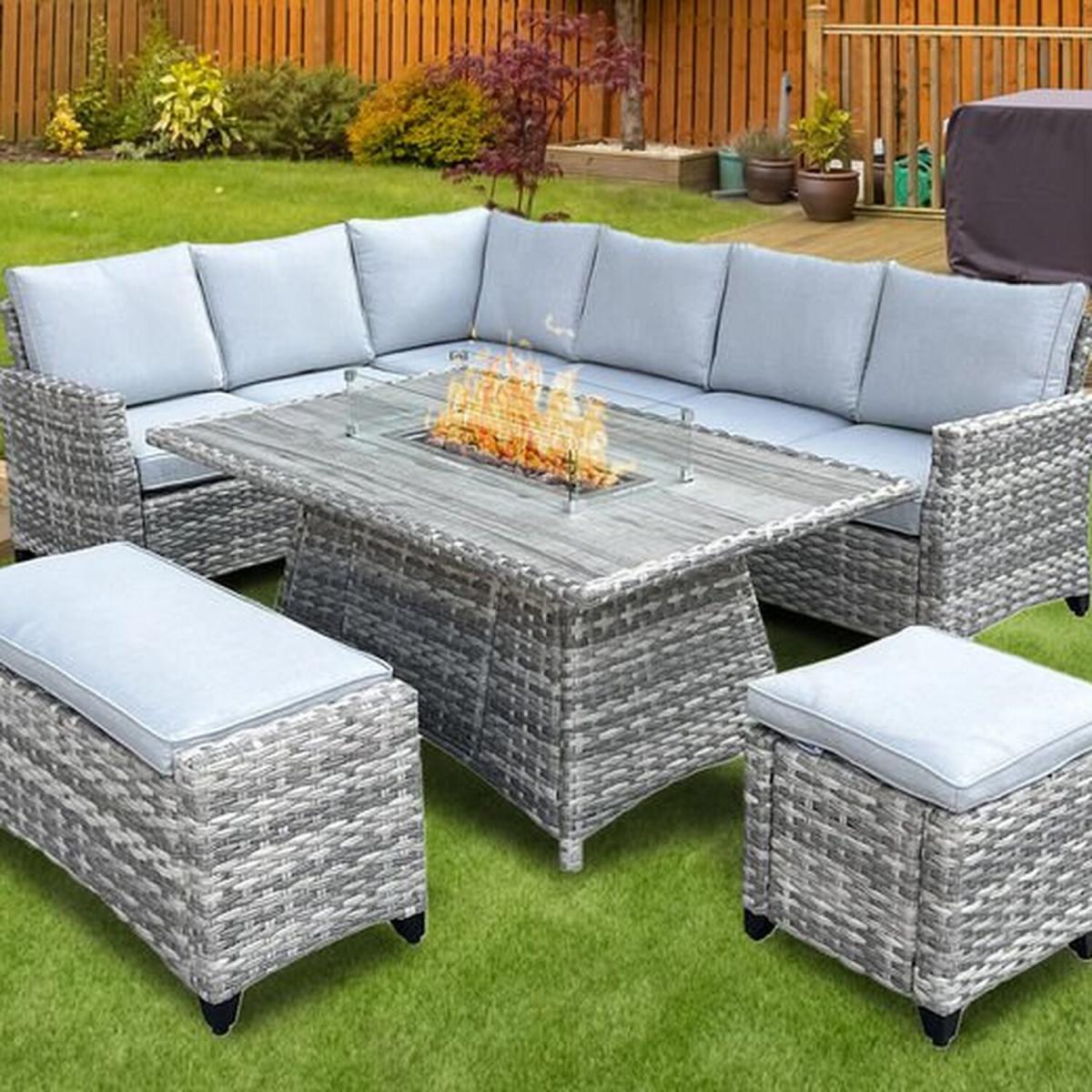 The Maldives Casual Dining Rattan Corner Sofa Set with Gas Firepit Table from Furnish Your Garden is a versatile choice that can be used for many occasions. Keep you and your guests warm all evening long with the Maldives Casual Dining Rattan Corner Sofa Set with Gas Firepit Table from Furnish Your Garden. Includes a left-handed corner sofa piece, a rectangular table with an in-built fire pit and 1 stool, 1 bench and you can seat up to 9 people around this stunning set. The set includes cushions and machine washable cushion covers, providing a comfy place to relax with easy methods to keep the set clean. We recommend when the set is not in use that you store the cushions from the elements, maintaining the longevity and quality of the set. Compatible with patio gas bottles, green bottles filled with propane, the Maldives Casual Dining Rattan Corner Sofa Set with Gas Firepit Table requires a bottle that matches the clip-on regulator that's included. Generally, a 5kg bottle is recommended as it fits inside the table well. All of Furnish Your Garden's firepit systems are CE Certified and manufactured using stainless steel that is both weatherproof and of the highest quality. The Maldives Casual Dining Rattan Corner Sofa Sets offers suitable heat and light for your garden.