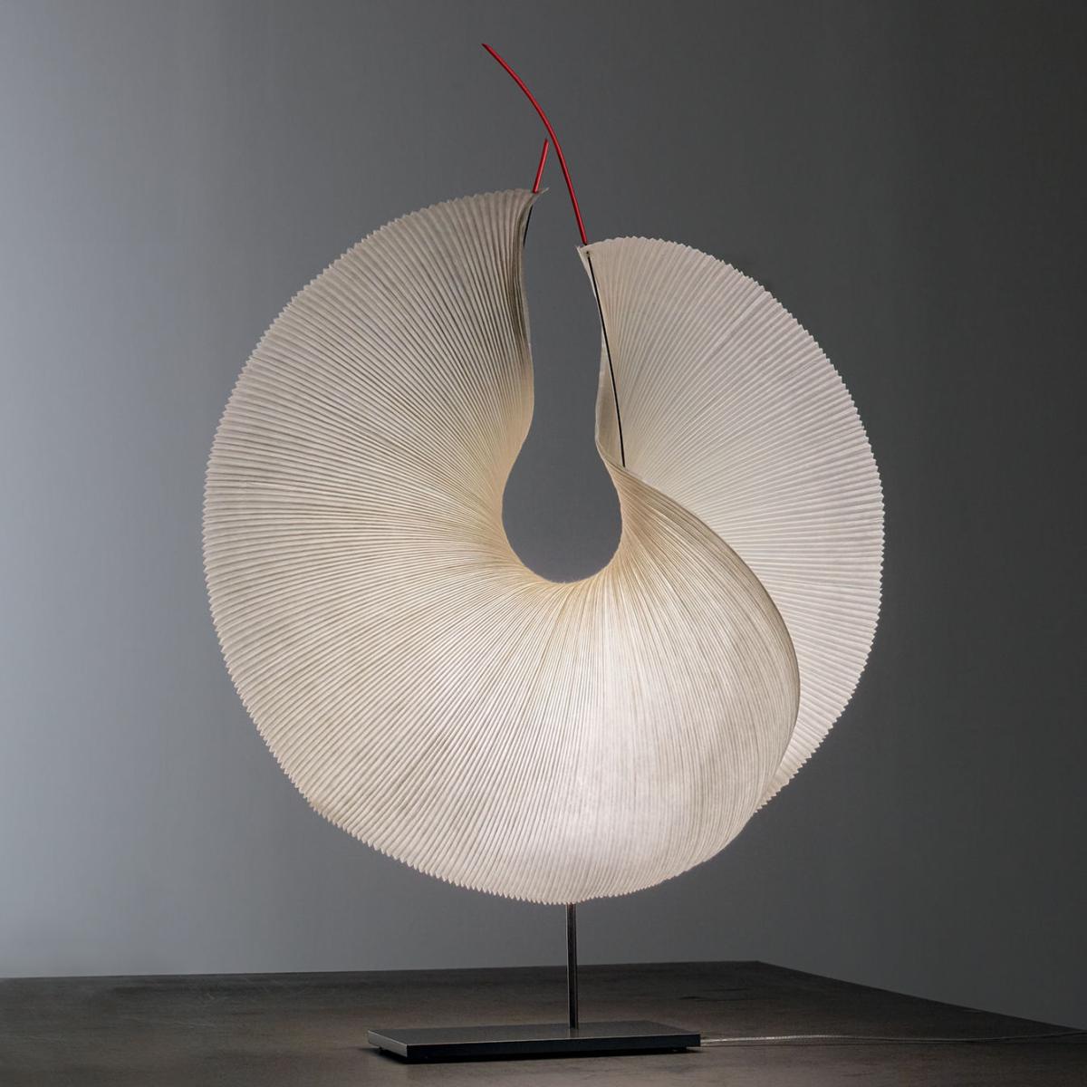 The Ma Mo Nouchies is a gentle and poetic collection of light fixtures developed by designers Ingo Maurer and Dagmar Mombacher. These Japanese paper lamps are born of quality craftsmanship: each piece is unique. The lampshades are folded by hand according to a patented process inspired by traditional Japanese paperwork techniques. The term “Nouchies” is a reference to the master sculptor-designer Isamu Noguchi, who created the famous paper Akari lamps. The Yoruba Rose lamp is an illuminated object you will find spellbinding for both its perfection and elegance. The paper arch is stretched over fine metallic rods almost forming a circle and unfurling upwards. A soft, warm light filters through the paper.