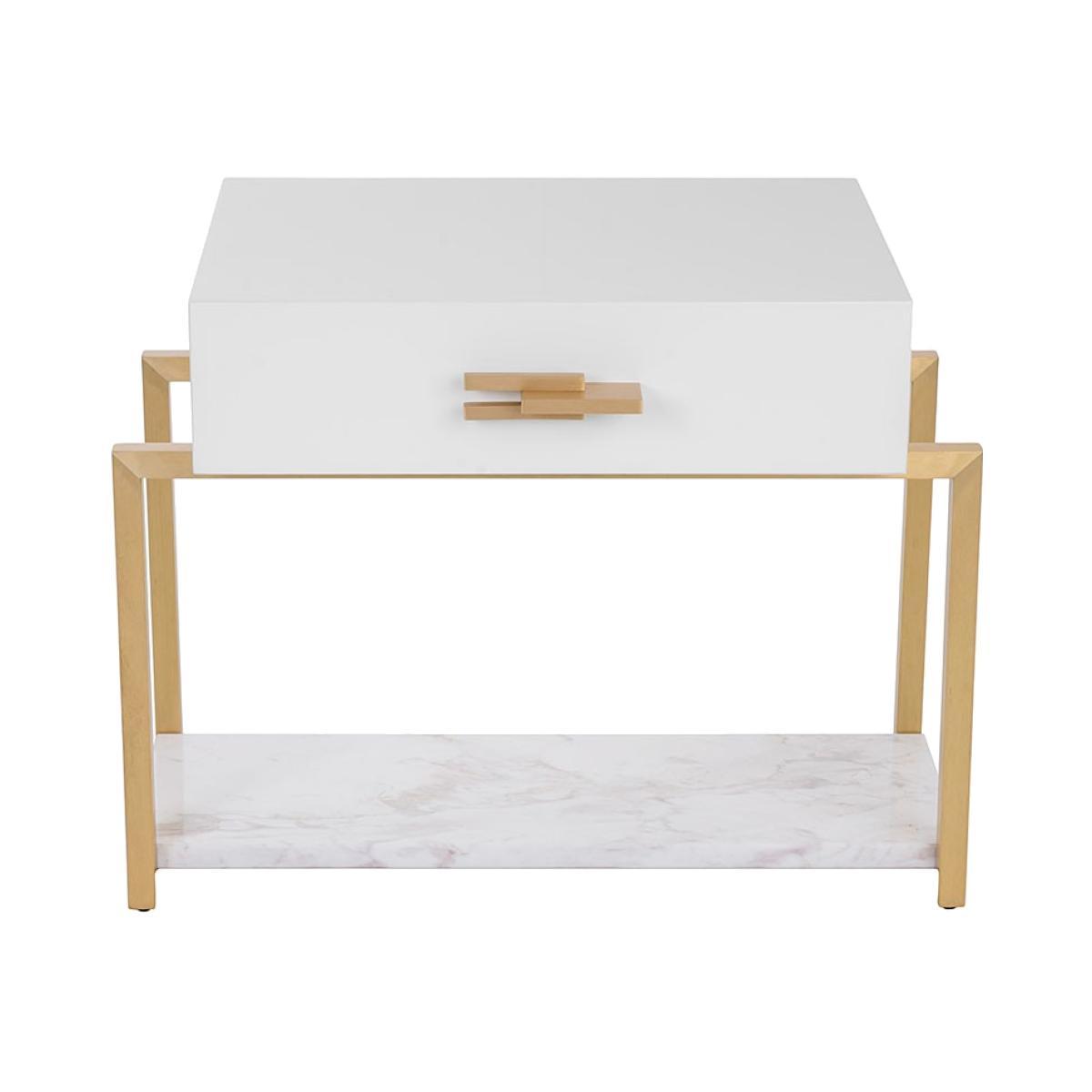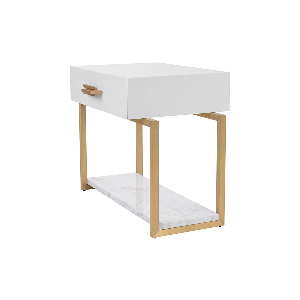 The Naima bedside table here shown in a high gloss lacquer with brushed brass framework and Branco Olimpico marble base. The drawer is lined in suede. Please visit us in store to select from our finish options.