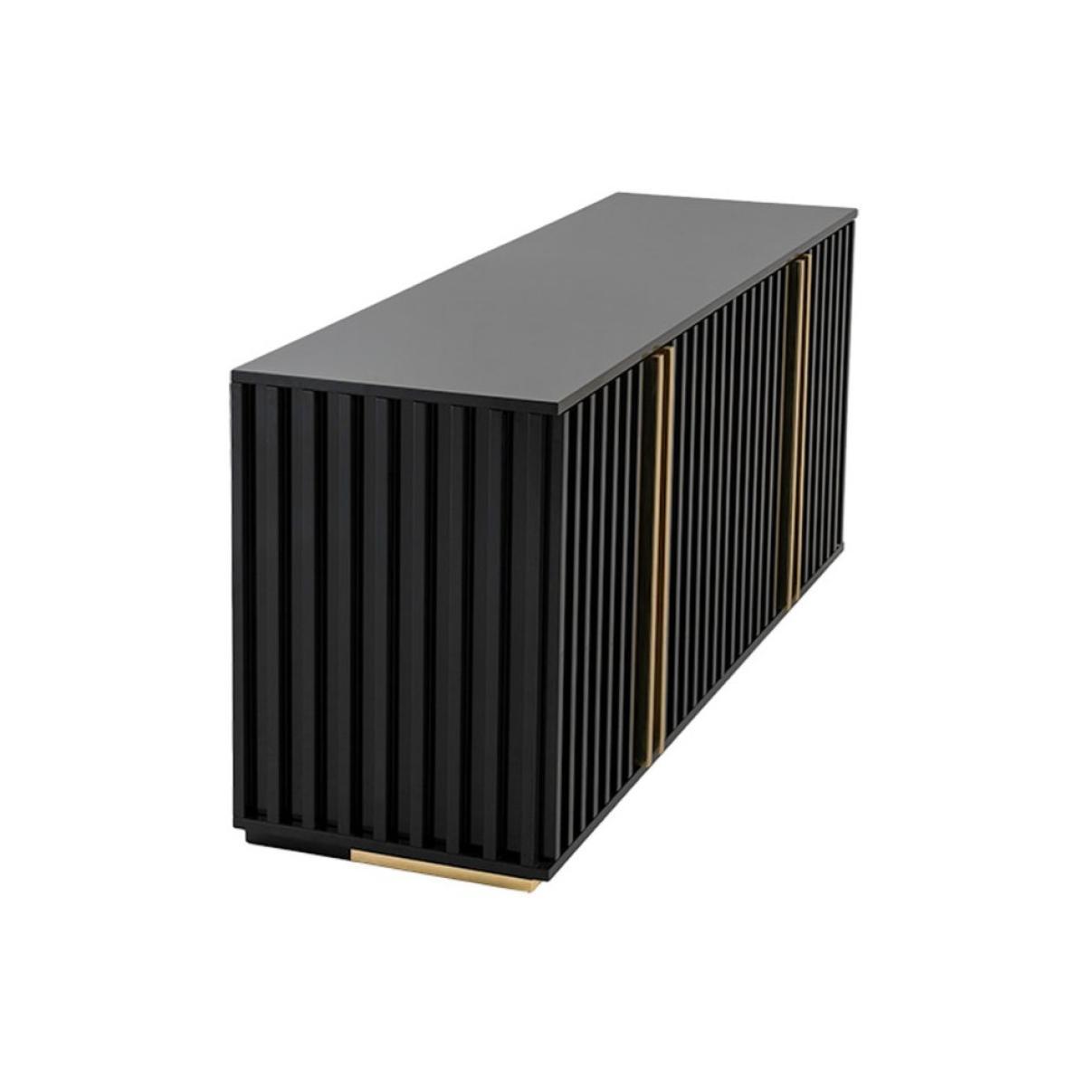 The Passos sideboard in lacquered or wood veneer finish. Brushed brass metal handles and plinth detail with suede lined interior.