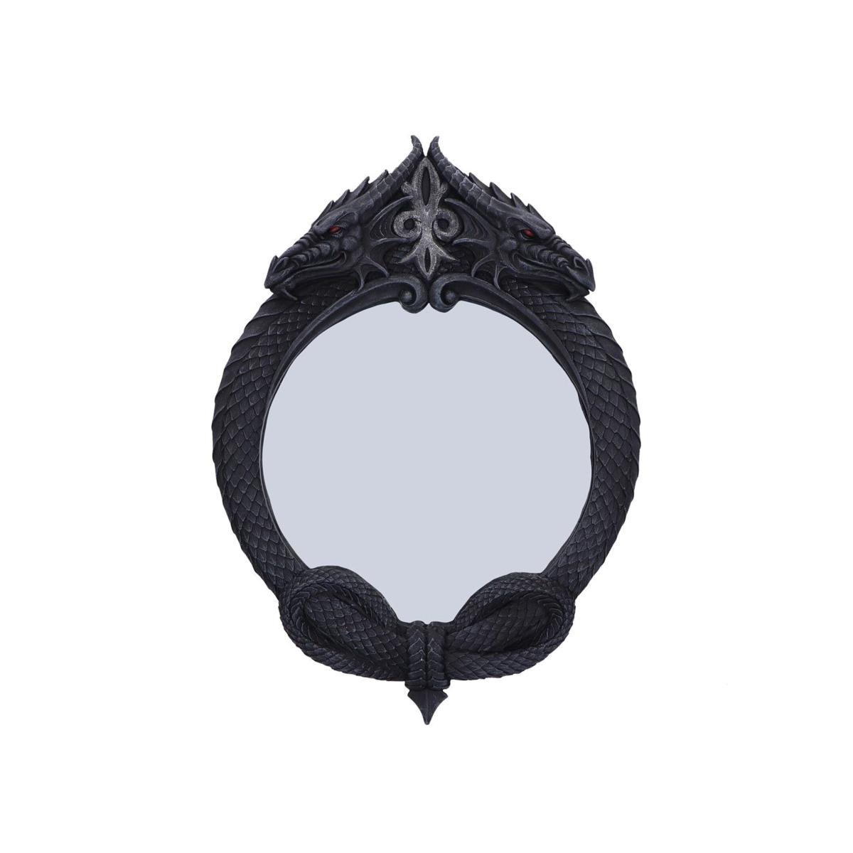 Unveil a touch of eldritch horror with The Reflector, our striking gothic dragon mirror that transforms any space into a realm of dark fantasy. This masterful piece features a central mirror encircled by two intricately sculpted dragons, their scaled bodies entwining as their fierce heads face outward, adding a sinister elegance to your wall. The dragons' tails curl gracefully to form a complete, eye-catching frame. Perfect for lovers of horror and gothic decor. Add a hauntingly beautiful focal point to your collection with this must-have macabre ornament.