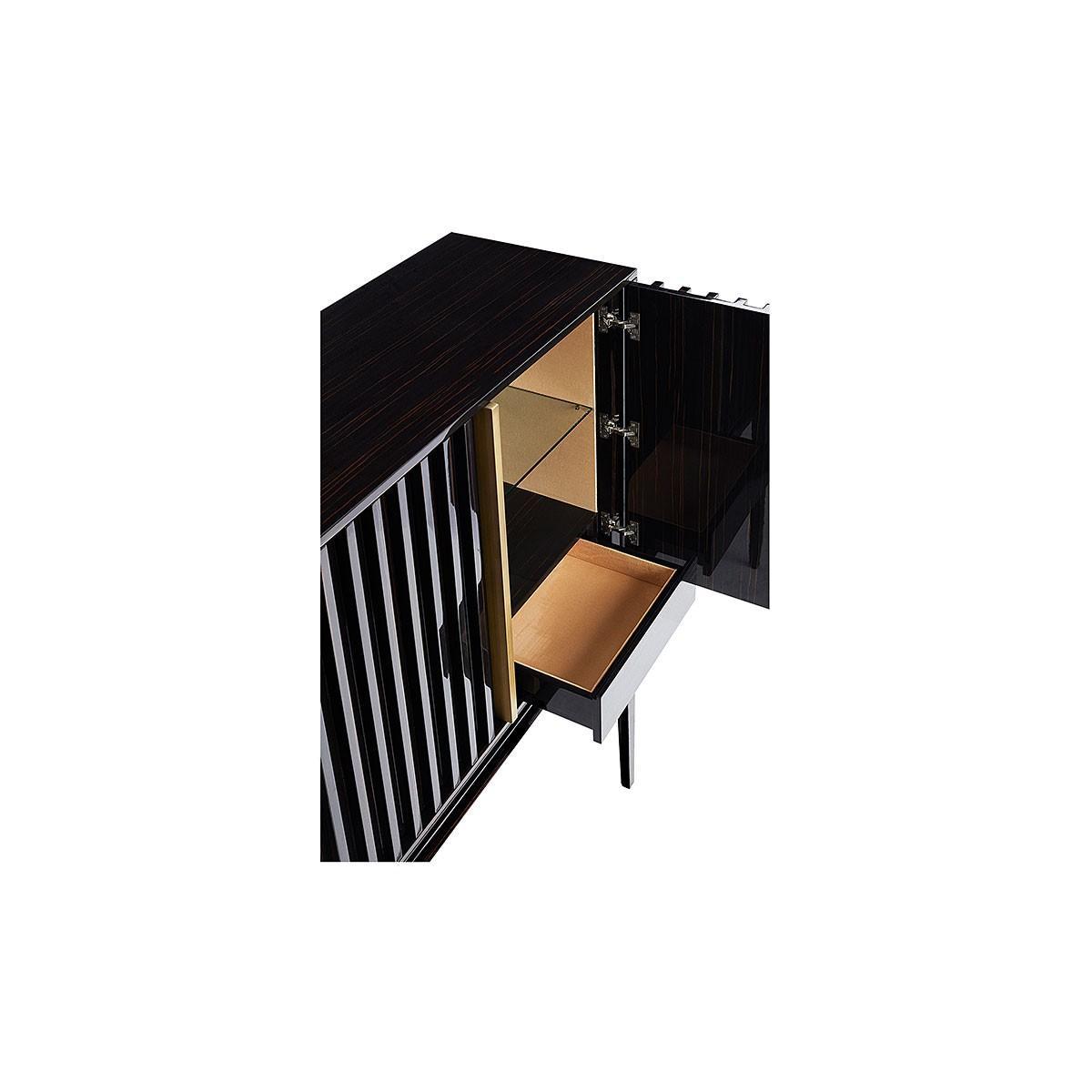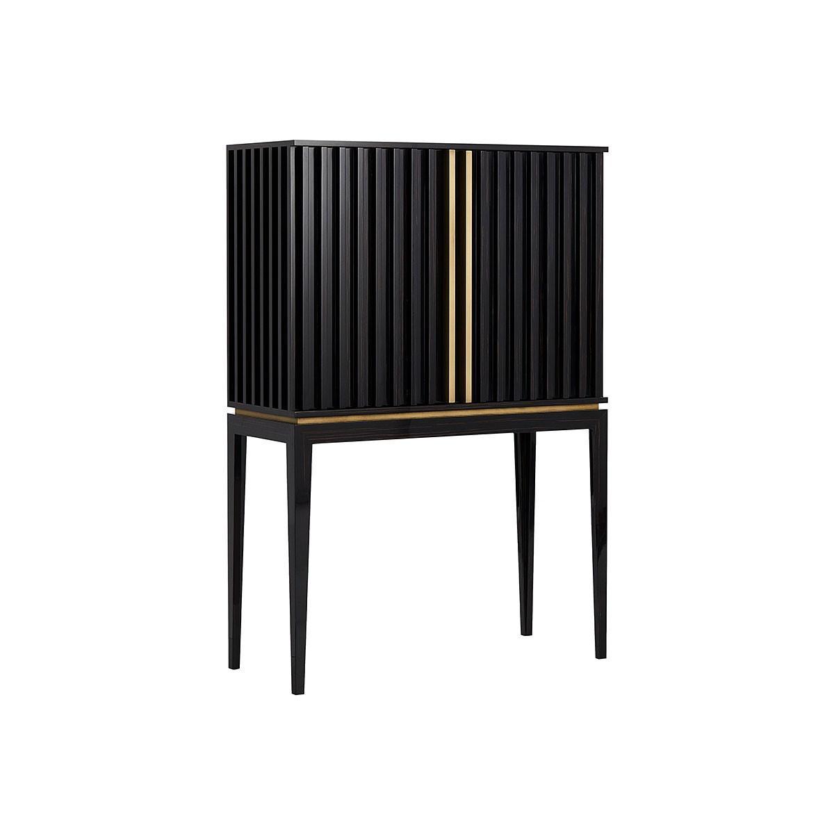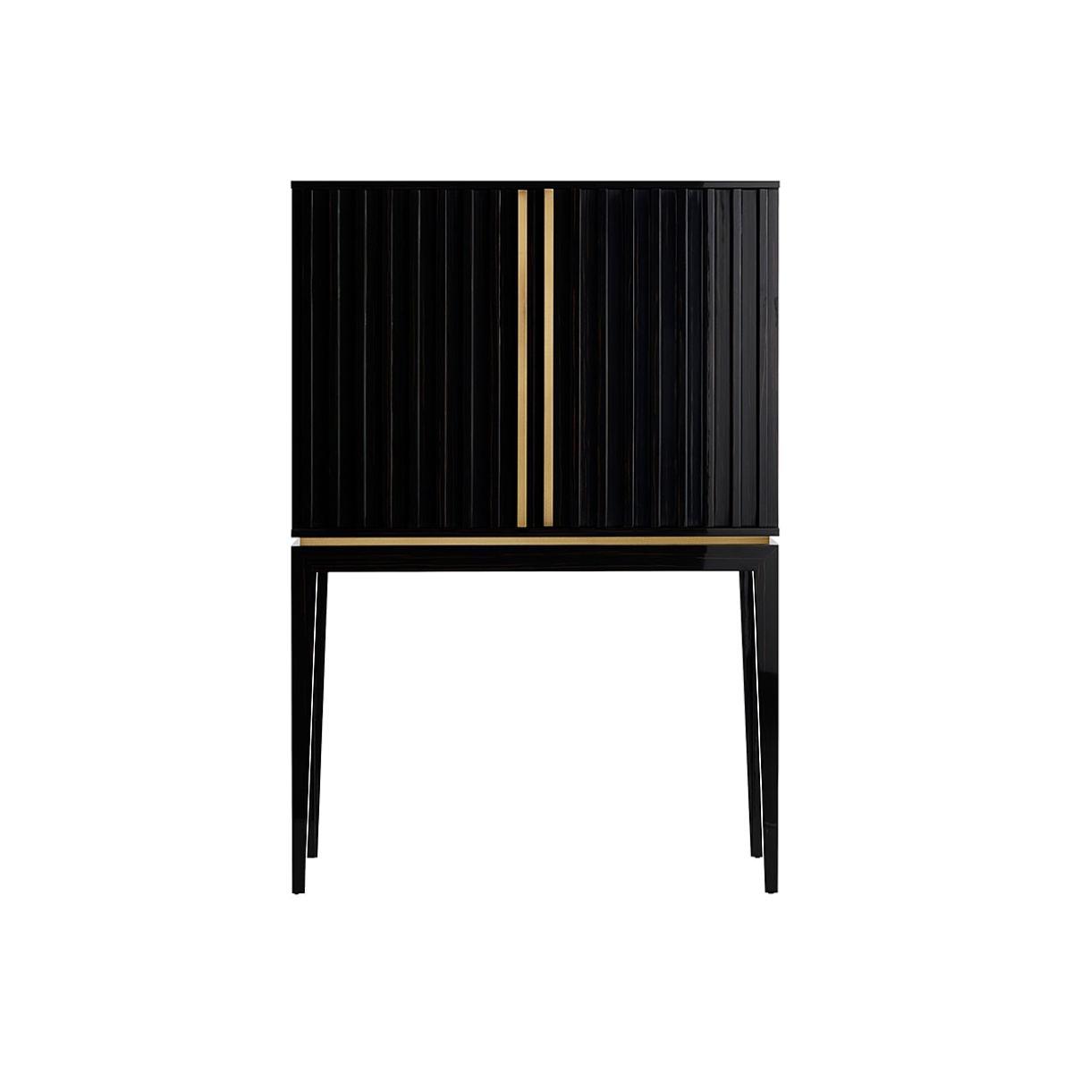 I’m a big fan of this sleek bar cabinet for its blend of subtle texture and metallic detailing - the ribbed doors and brass trim lift a simple black frame without overwhelming a space. It sits neatly on slender legs, making it ideal for contemporary living rooms, city apartments or even a refined home office. Styling-wise, use the top surface for a pair of sculptural decanters and a small stack of coasters, then tuck glassware and a cocktail recipe book behind the doors. Adding a warm LED strip inside will highlight your favourite bottles and keep everything at hand, while a single sculptural vase or low arrangement balances the overall look.