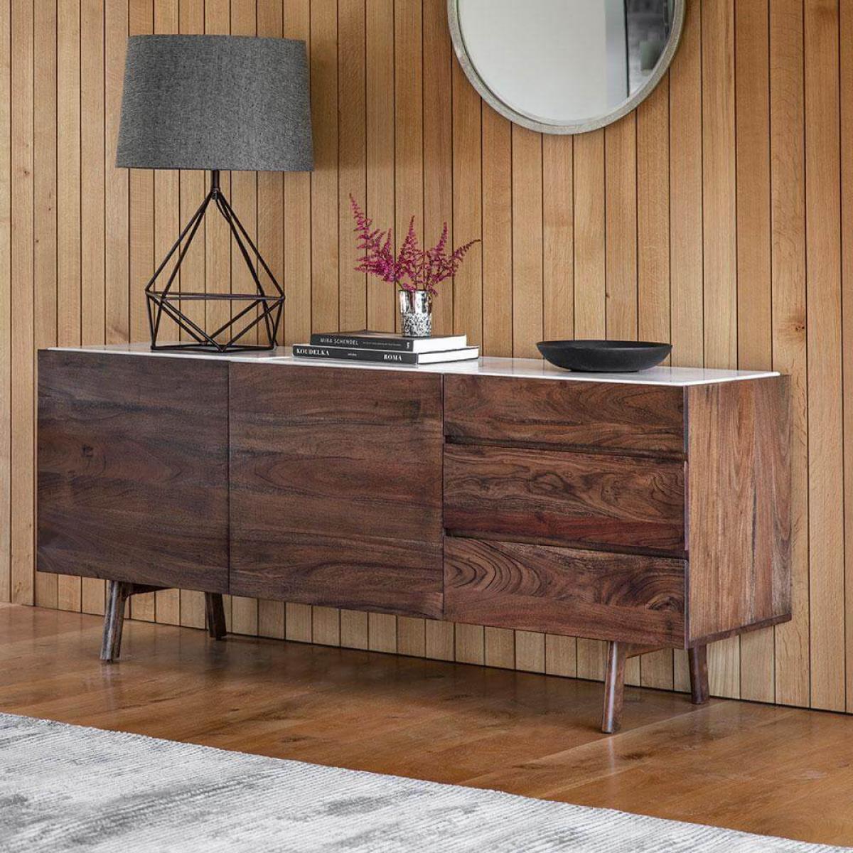The Retro sideboard is an iconic design with an inlaid white marble top and sleek lines – this stunning but practical sideboard has two cupboard doors and three drawers for storage – the stylish under-frame is detachable for ease of delivery. This piece is a modern take on a classic 1970s style sideboard.