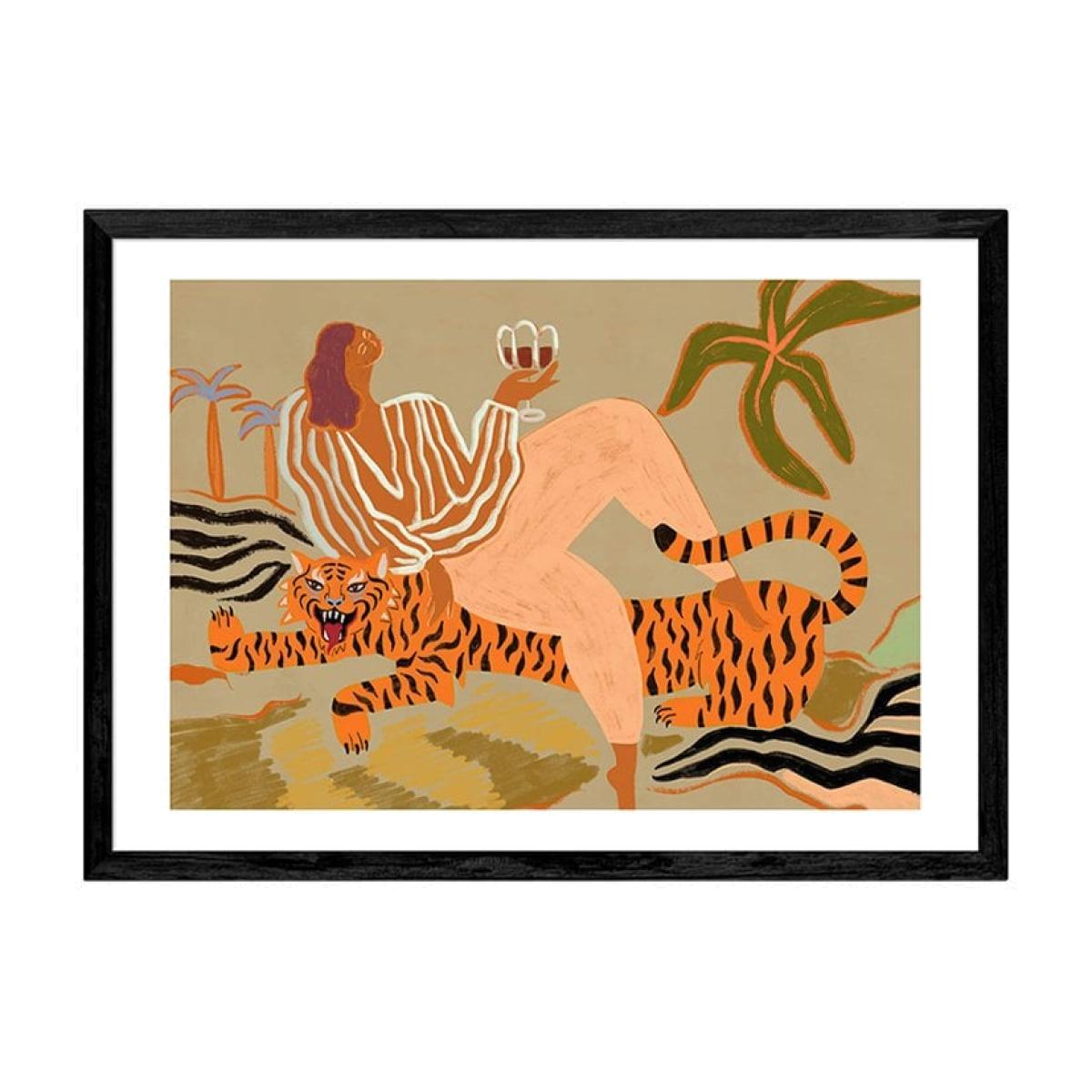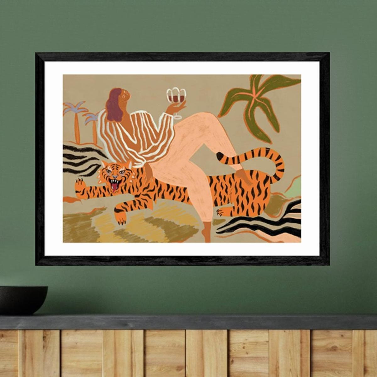 Exotic, warm and vivid, The Roar of the Jungle Graphic Print is inspired by Asian culture with a hint of post-impressionism art. This print brings the aesthetics of the natural world combined with the imagination, using organic abstract shapes and an earthy colour palette. Only giclée printing processes are used for this print resulting in the highest quality museum-level colours and sharpness. Choose between a number of different coloured frames and two sizes for the perfect print for your space.