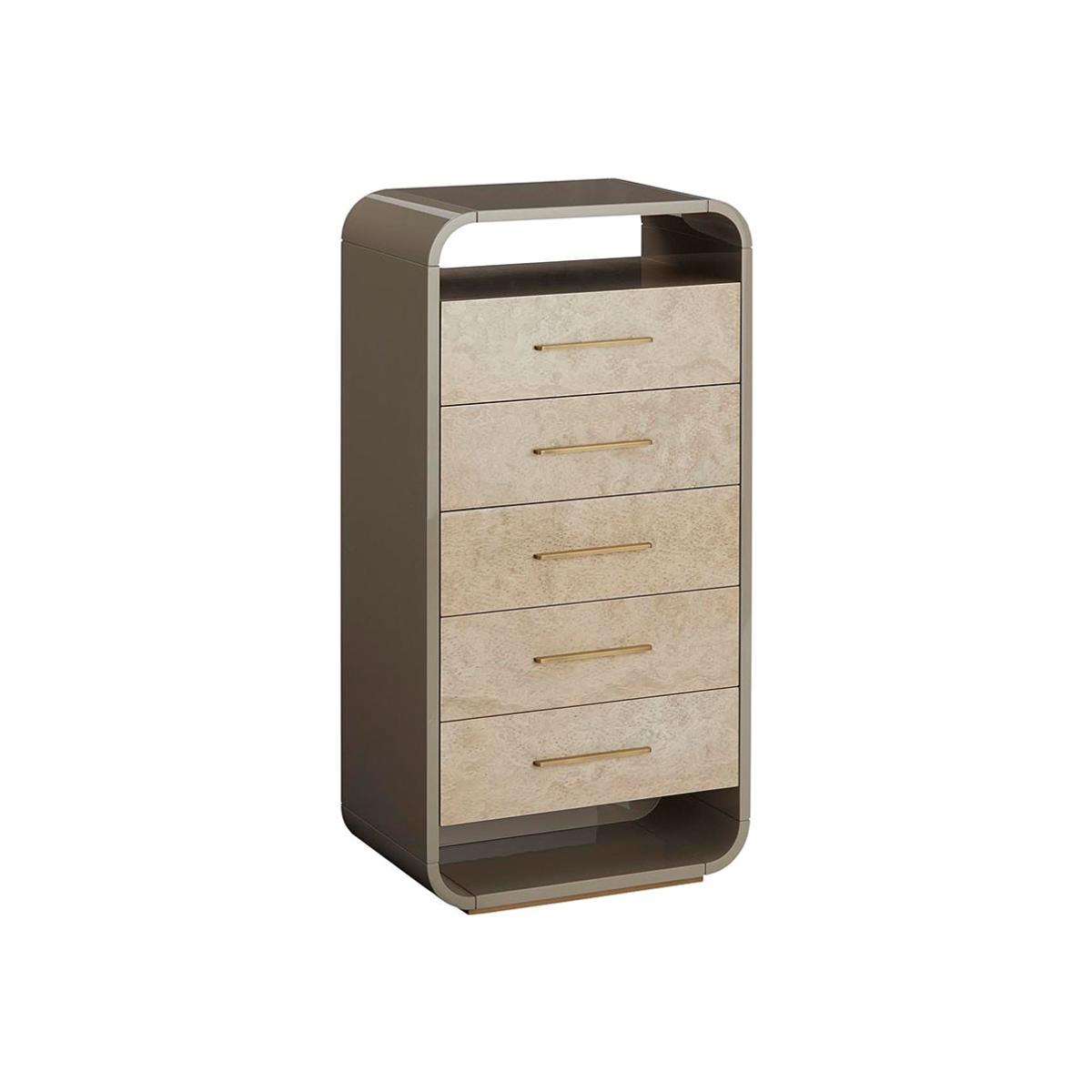 The Simone Tall Boy is here shown in a high gloss lacquered framework with high gloss partridge eye veneer suede lined drawers with antique brass handles. A variety of finish options are available.