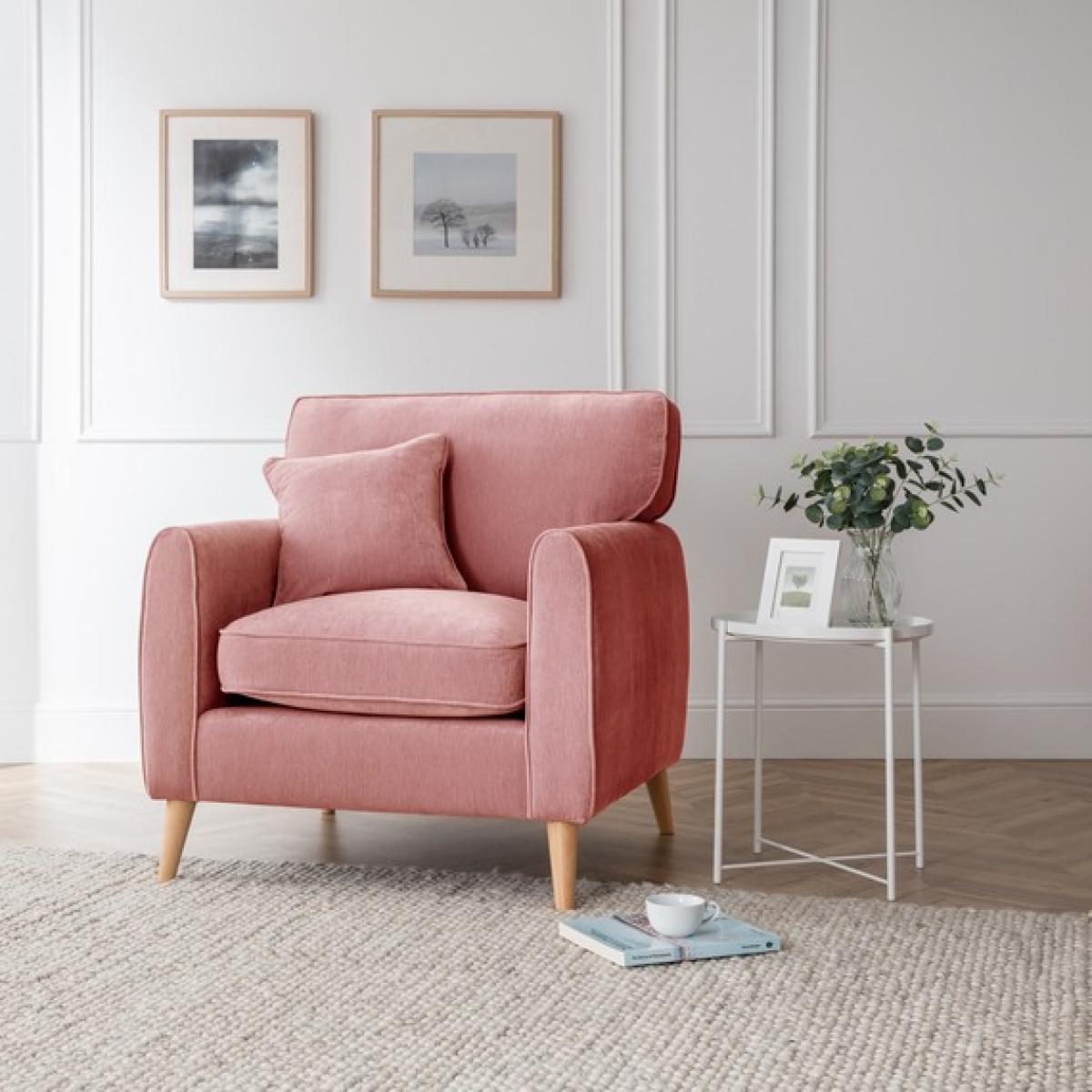 I love this armchair's cosy yet contemporary vibe-its plum colour adds a rich pop of colour that works beautifully in both modern and traditional interiors. It’s versatile enough to sit comfortably in a living room, reading nook, or even a bedroom corner. For styling, team it with textured cushions in contrasting or complementary shades to enhance its visual appeal. Practical tips include pairing it with a small side table, as shown, for convenience, and placing it on a statement rug to anchor the look. Its understated wooden legs give it a light, Scandinavian-inspired aesthetic that keeps the space feeling fresh and inviting.