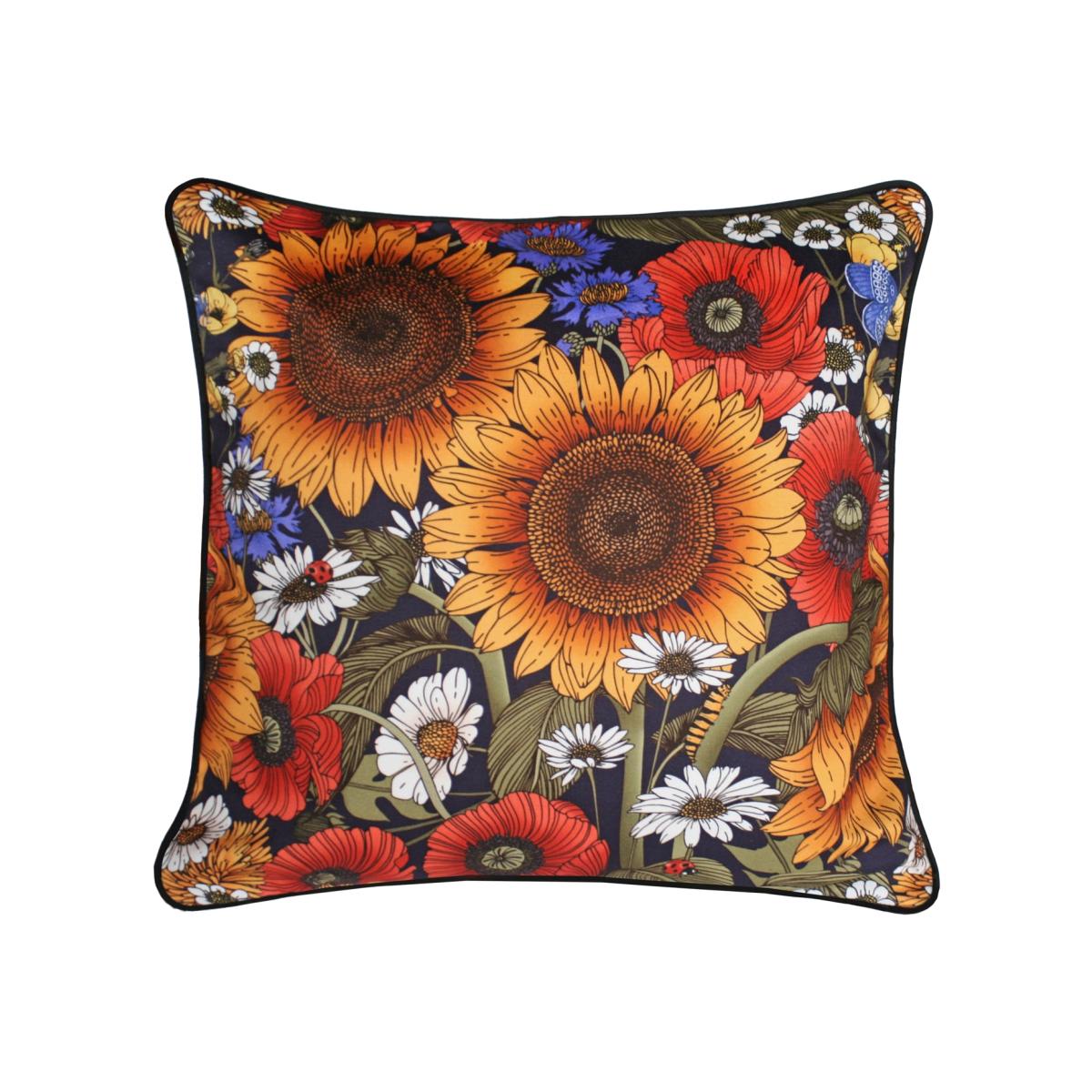 The Sunflower Cushion is one of Emily Carter's hand illustrated designs, and is part of our ever expanding range of homewares. The design features a combination of hand-drawn sunflowers and poppies and the autumnal tones make this cushion an eclectic piece of British craft, specifically designed to brighten up your home. Made in England Printed Cotton Front Plain Black Velvet Back Piped Edges Dry Clean Only
