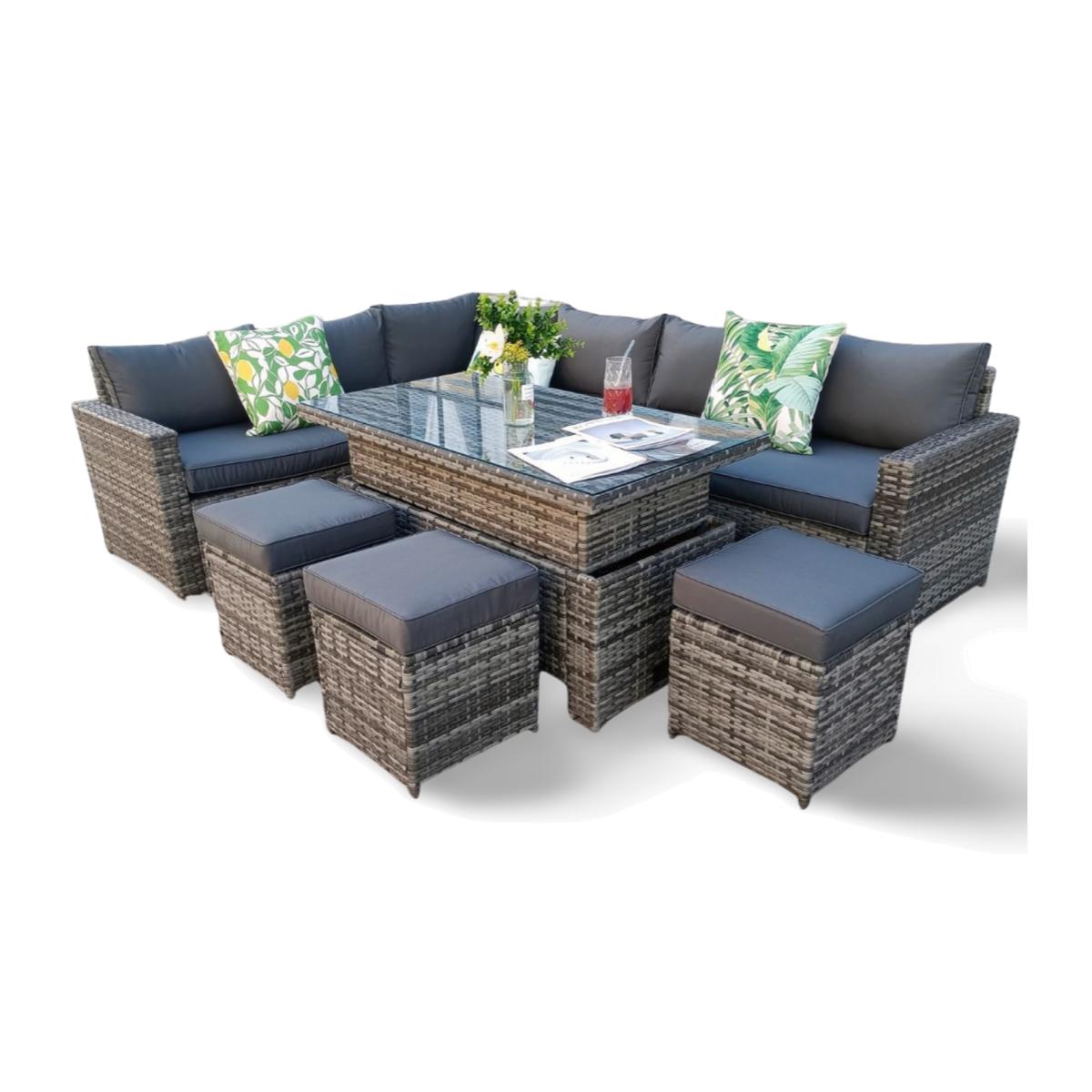 The Tarporley 9-seat corner rattan set from our Cheshire range is perfect for big gatherings. If you have the space available in your garden, you deserve the luxury of this set. This stylish seating area allows all your family and friends to sit together in comfort and style whilst enjoying the outdoors. The Grey rattan is a blend of tones to match any surrounding, this corner sofa set will fit perfectly into any modern or contemporary garden and is easy to maintain. The set includes a 3-seater sofa, 3-sided sofa, glass-topped garden table and three footstools, so there's no excuse not to take the weight off your feet. The deep filled cushions guarantee comfort and full support. A classic choice for outdoor living, this beautiful corner set will look the part in any contemporary or traditional garden. Made from all-weather garden fabric to withstand British weather! Our Rattan is premium PE and the frame is coated to offer longstanding protection against all the elements. Tempered glass table top ensures durability and makes it easy to wipe clean. Weather and water-resistant cushions (Please read care label - bring cushions indoors in harsh weather conditions). This set includes rise and fall table allowing you to setup your set with a coffee table or dining table.