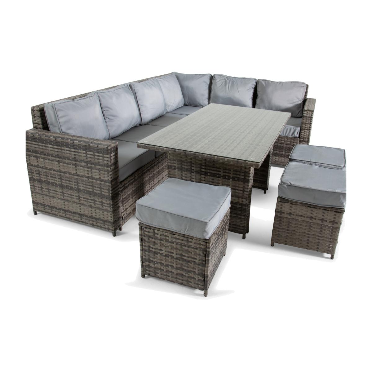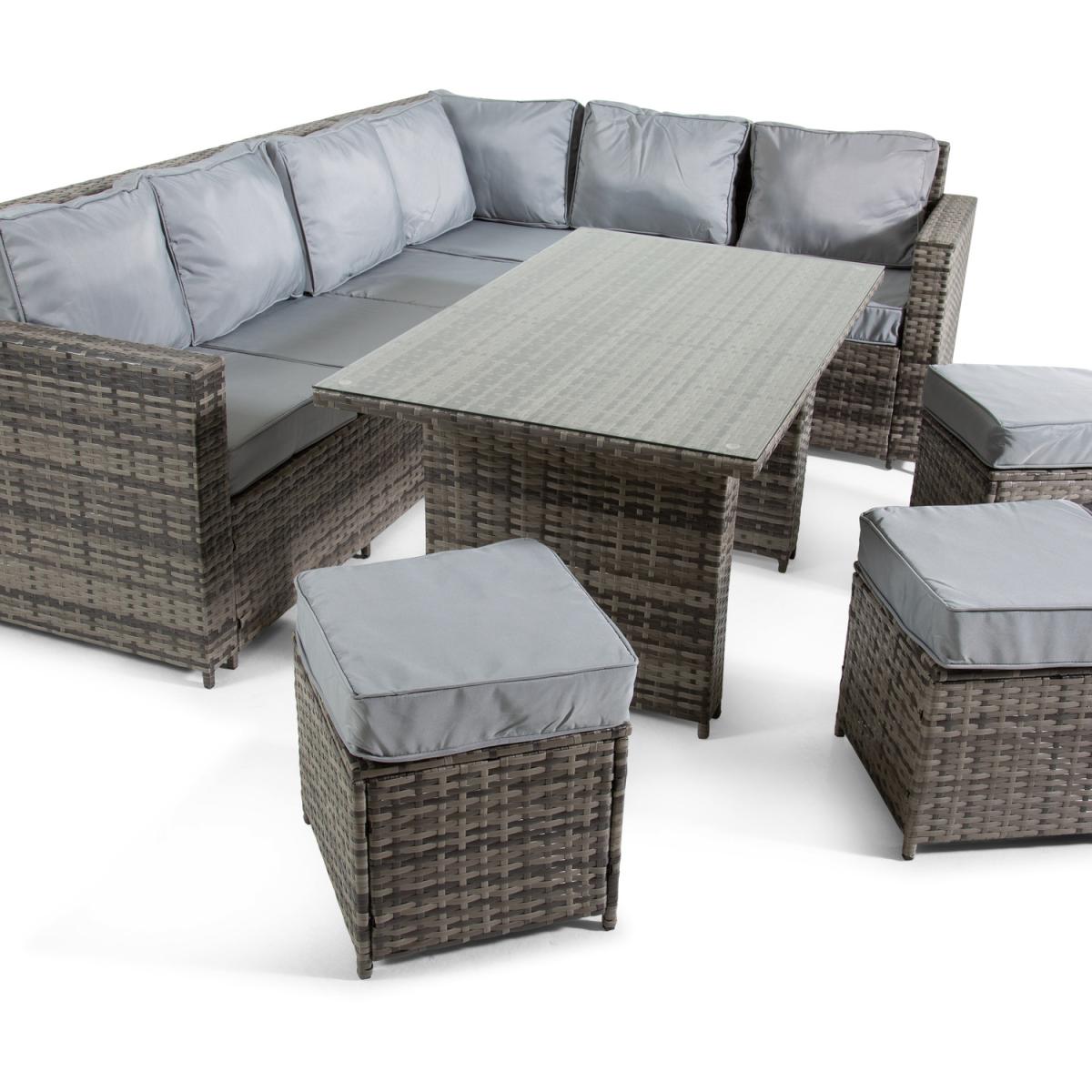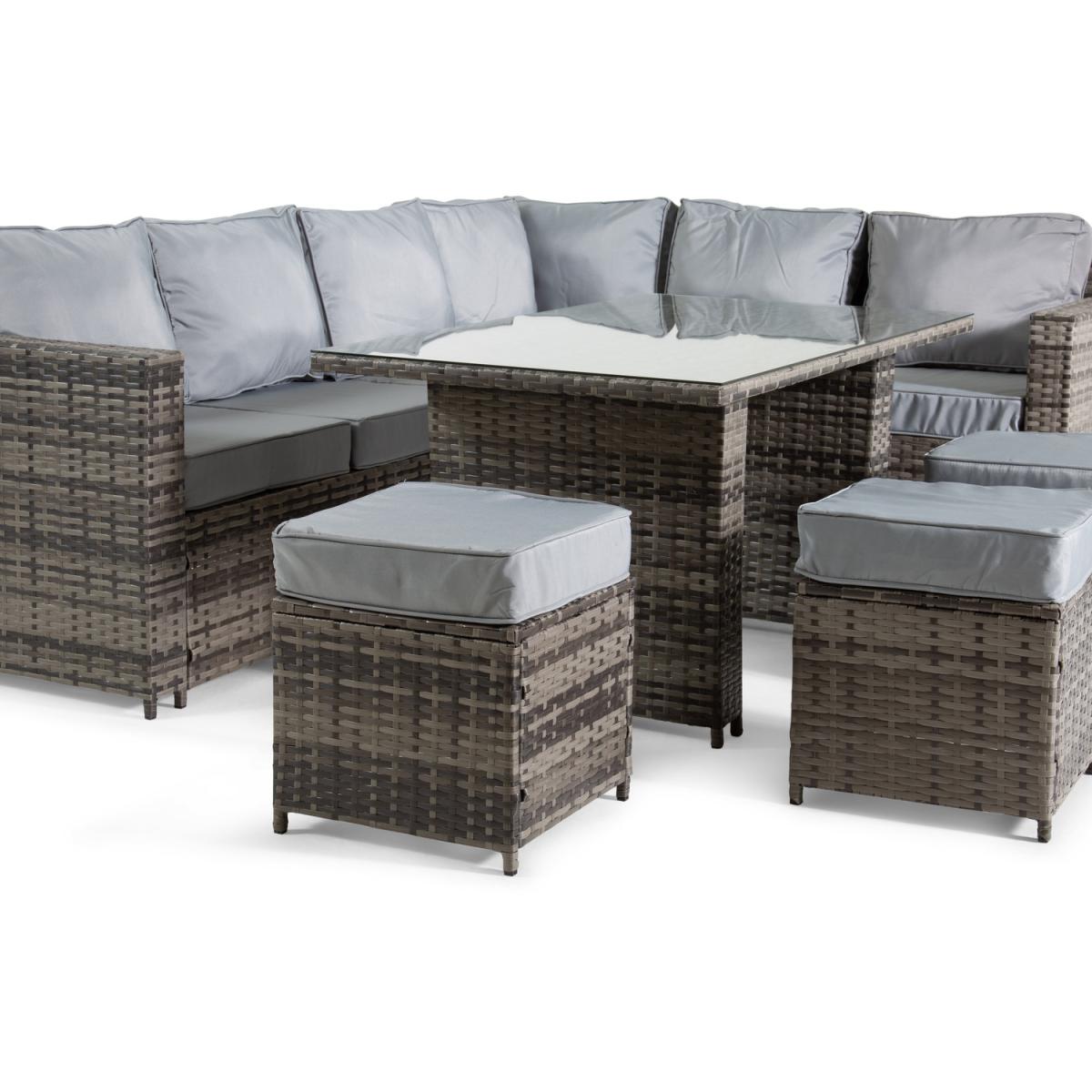 The Tarporley 9-seat corner rattan set from our Cheshire range is perfect for big gatherings. If you have the space available in your garden, you deserve the luxury of this set. This stylish seating area allows all your family and friends to sit together in comfort and style whilst enjoying the outdoors. The Grey rattan is a blend of tones to match any surrounding, this corner sofa set will fit perfectly into any modern or contemporary garden and is easy to maintain. The set includes a 3-seater sofa, 3-sided sofa, glass-topped garden table and three footstools, so there's no excuse not to take the weight off your feet. The deep filled cushions guarantee comfort and full support. A classic choice for outdoor living, this beautiful corner set will look the part in any contemporary or traditional garden. Made from all-weather garden fabric to withstand British weather! Our Rattan is premium PE and the frame is coated to offer longstanding protection against all the elements. Tempered glass table top ensures durability and makes it easy to wipe clean. Weather and water-resistant cushions (Please read care label - bring cushions indoors in harsh weather conditions).