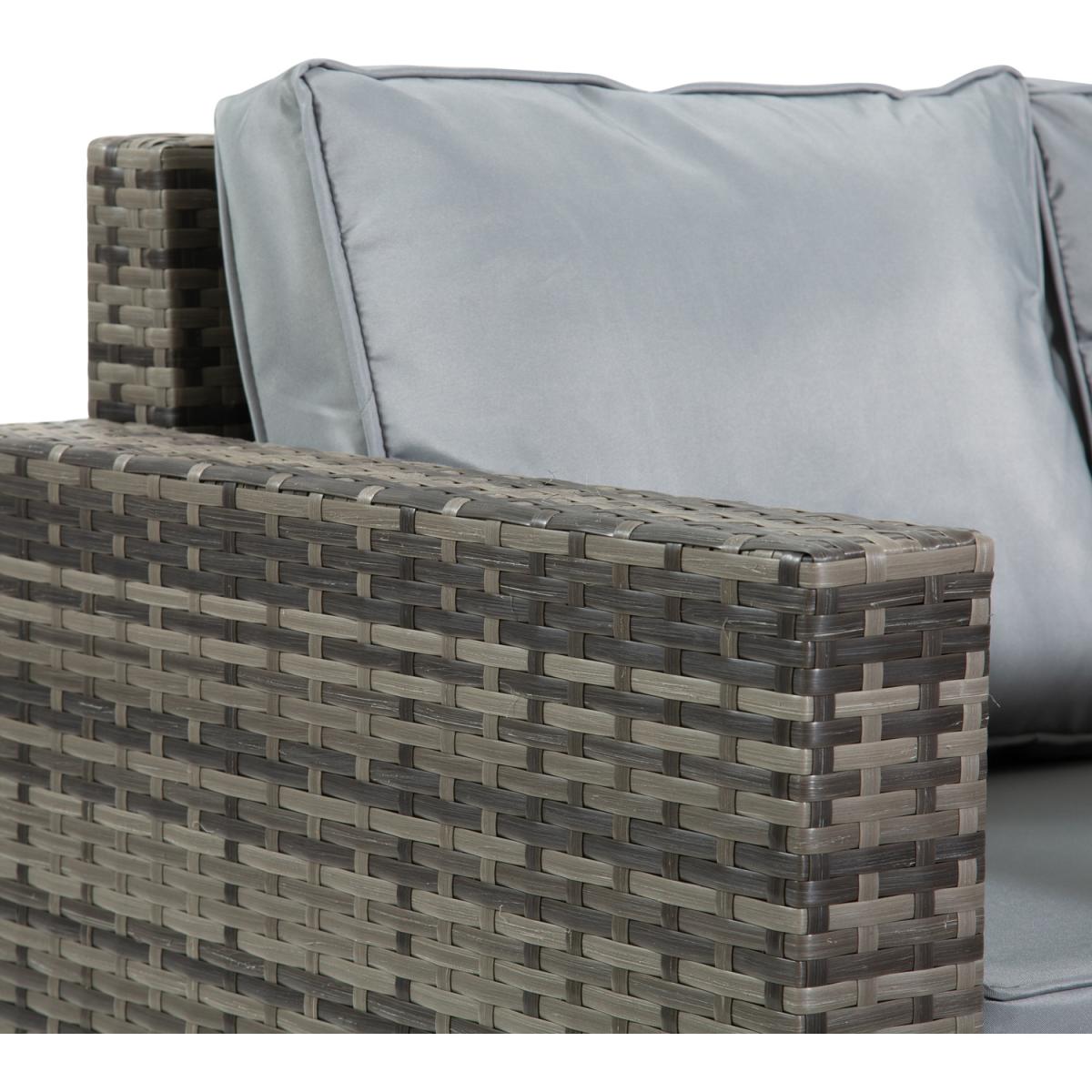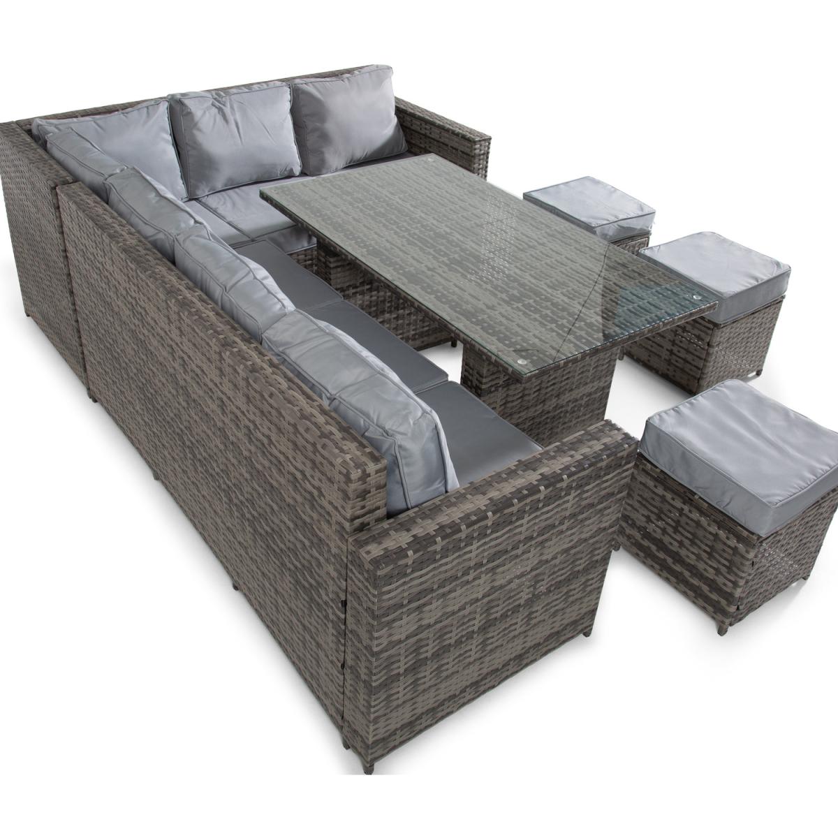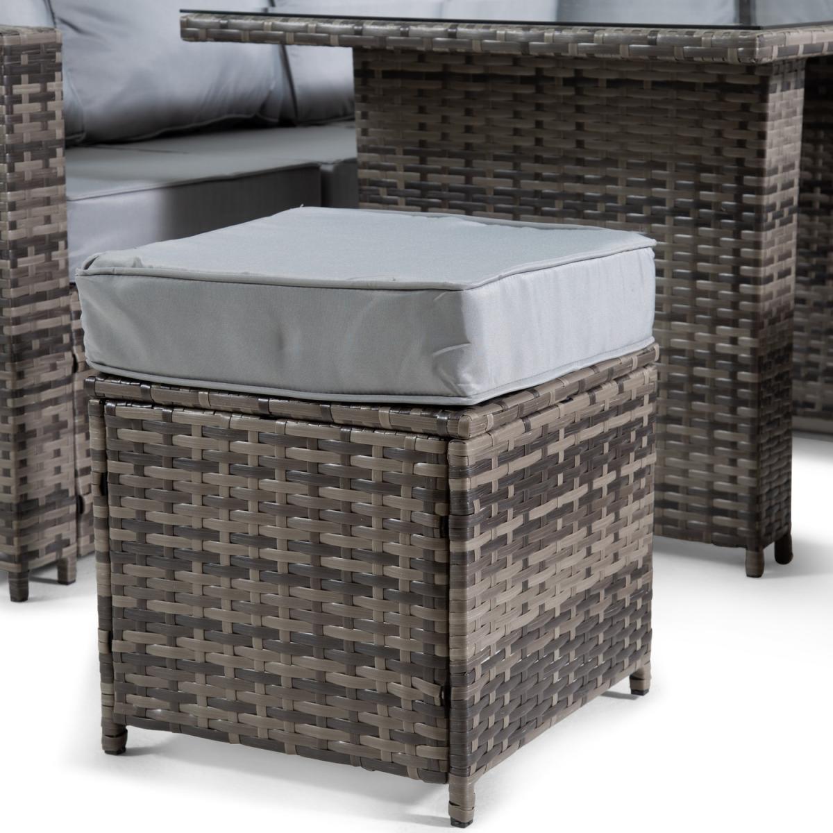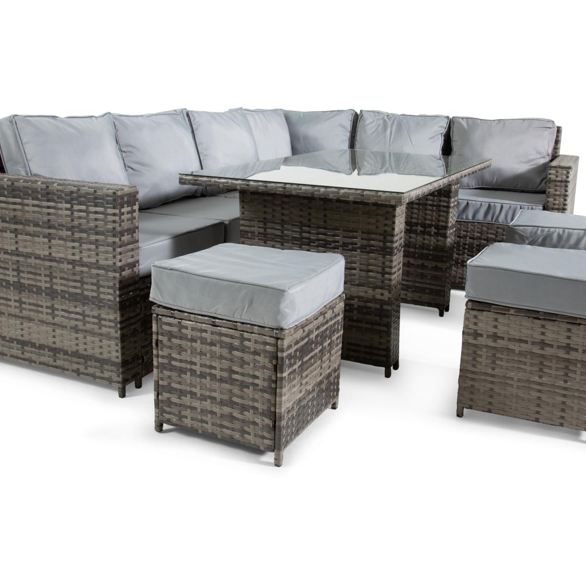 The Tarporley 9-seat corner rattan set from our Cheshire range is perfect for big gatherings. If you have the space available in your garden, you deserve the luxury of this set. This stylish seating area allows all your family and friends to sit together in comfort and style whilst enjoying the outdoors. The Grey rattan is a blend of tones to match any surrounding, this corner sofa set will fit perfectly into any modern or contemporary garden and is easy to maintain. The set includes a 3-seater sofa, 3-sided sofa, glass-topped garden table and three footstools, so there's no excuse not to take the weight off your feet. The deep filled cushions guarantee comfort and full support. A classic choice for outdoor living, this beautiful corner set will look the part in any contemporary or traditional garden. Made from all-weather garden fabric to withstand British weather! Our Rattan is premium PE and the frame is coated to offer longstanding protection against all the elements. Tempered glass table top ensures durability and makes it easy to wipe clean. Weather and water-resistant cushions (Please read care label - bring cushions indoors in harsh weather conditions).