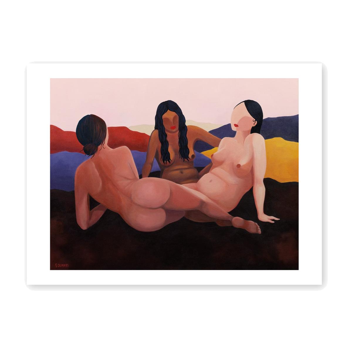 The Three Graces is apart of the Atlas Mountains Sisterhood Series.* The original artwork is an acrylic painting on canvas. Due to popular demand, this piece is now available as a fine art giclée print on heavyweight Hahnemühle Archival paper. Open edition Sold without frame * About the Atlas Mountain Sisterhood painting series, exhibited in London in 2021. In a hectic, absurd and ever more connected/disconnected world, the artist Soumati finds meaning and comfort in Mother Nature: the Higher Source and Divine Feminine, describing freedom as her ultimate muse. The Atlas Mountains Sisterhood series is about the simplicity and power of the ‘being' versus the ‘doing'. Being free to be who we truly are: diverse, bare, shameless, in harmony with each other and with Nature. Giclée fine art print on heavyweight and beautifully textured Hahnemühle Museum Etching (350gsm) / German Etching (310gsm) Sold Unframed. The best care for your print is to frame it and to keep it out of direct sunlight. Printed in London.