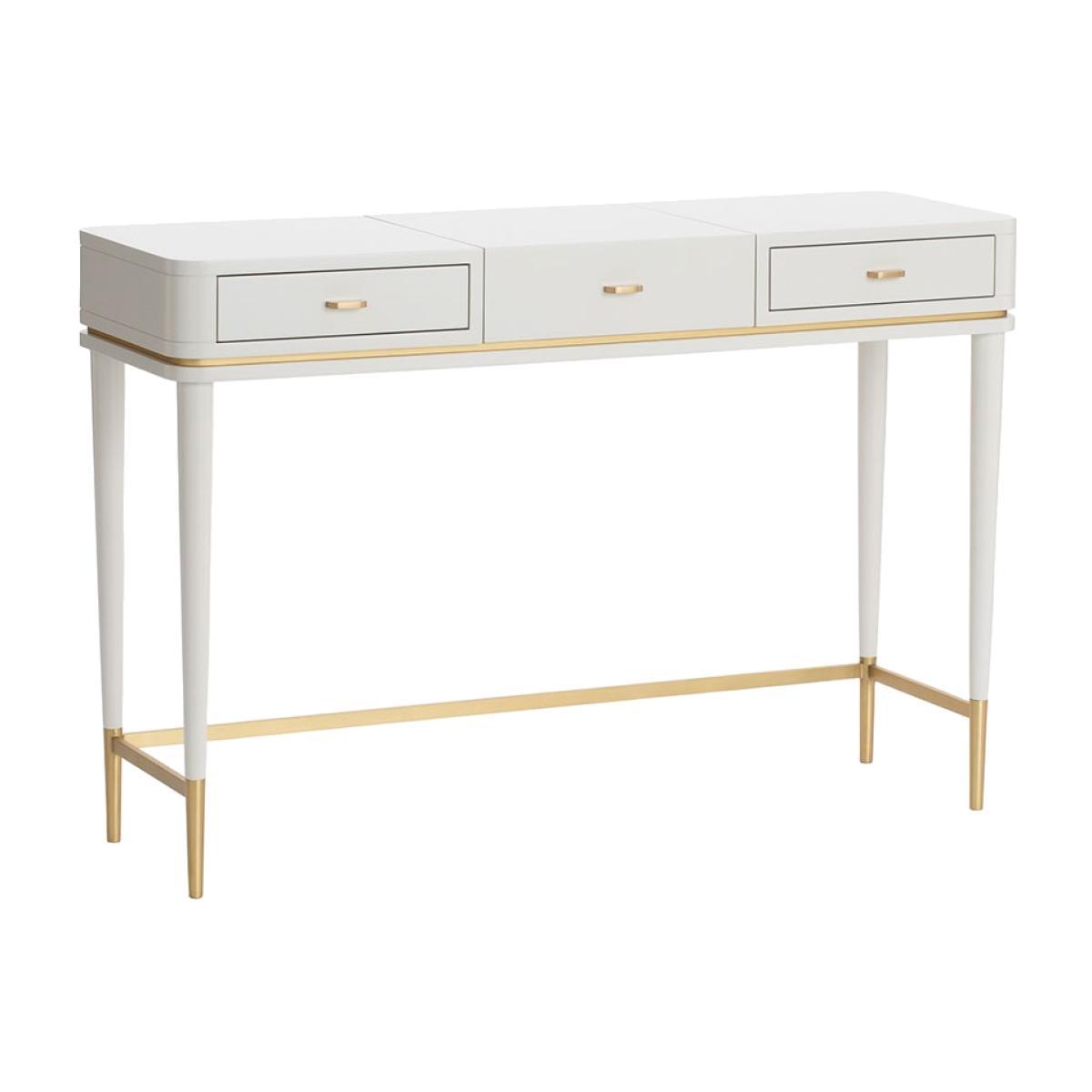 The Tito dressing table comes in a variety of finish options. Here showcased in a matt lacquer with antique brass detailing to the draw handles and stiletto tips. The draws are lined in a faux suede.
