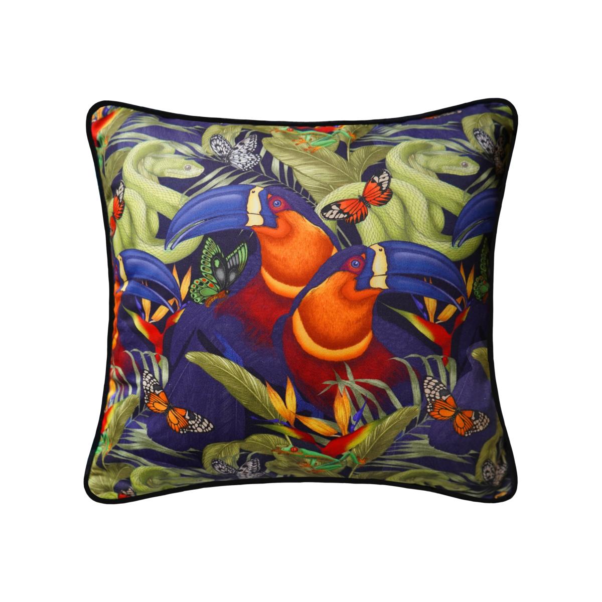 The Tropical Toucan Cushion is one of Emily Carter's hand illustrated designs, and is part of our ever expanding range of homewares. The soft green tones make this cushion an eclectic piece of British craft, specifically designed to brighten up your home. Made in England Printed Cotton Front Plain Black Velvet Back Velvet Piped Edges Dry Clean Only