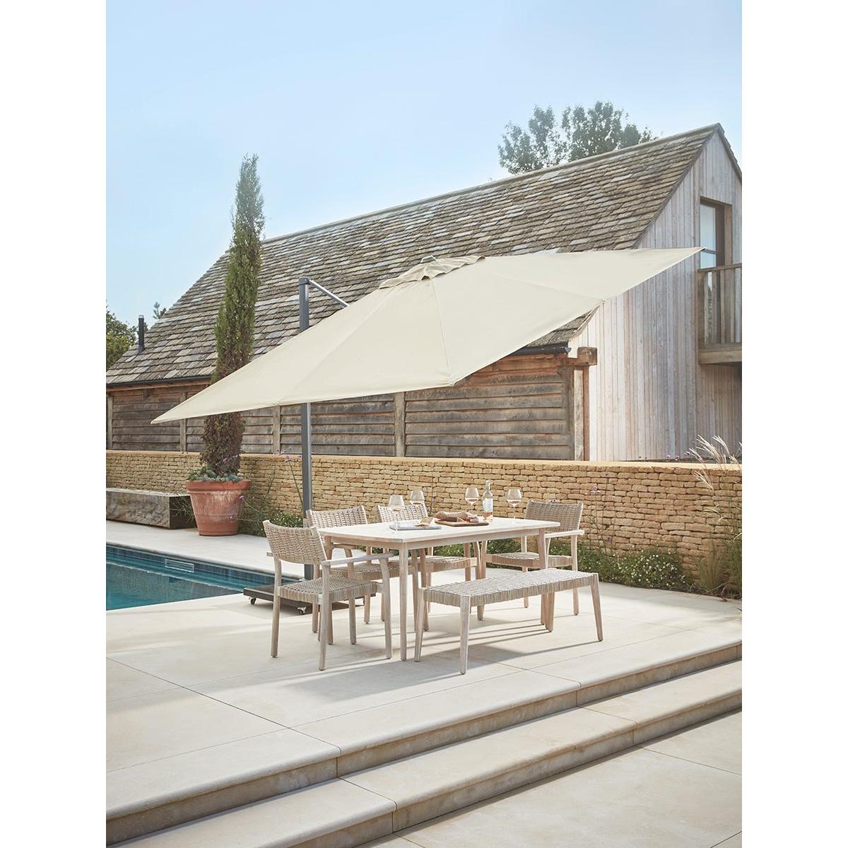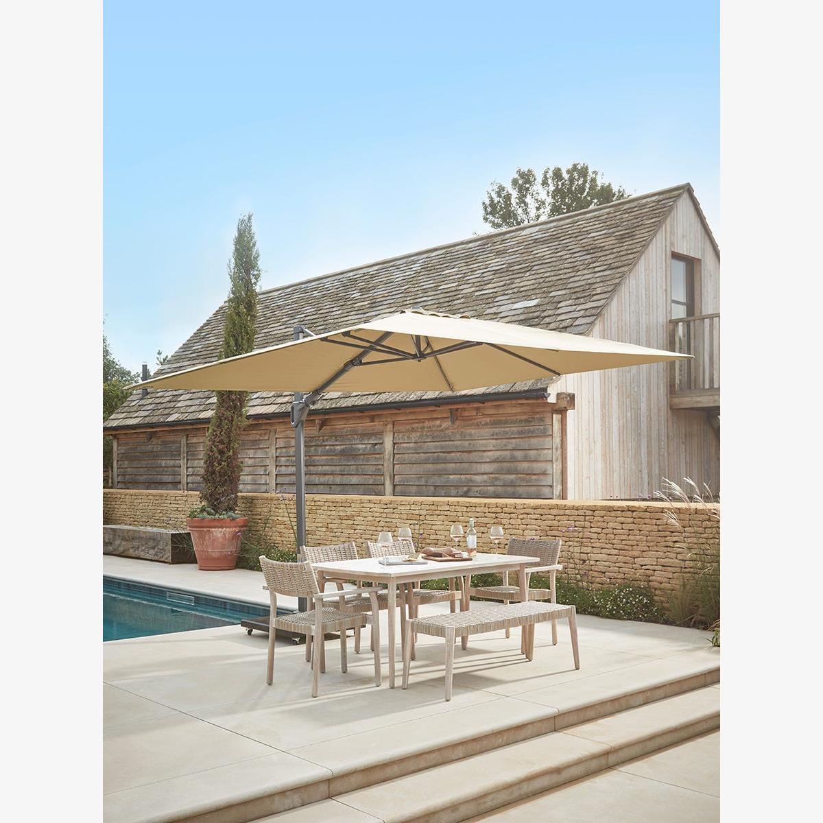 Adjustable in almost every direction, our ultimate cantilever parasol sets really are the créme de la créme of garden umbrellas. The perfect finishing touch for any garden arrangement, this shade will offer shelter from the sun whether you are gathered for lunch outdoors or enjoying an hour or two on your sun loungers. Full of luxury resort styling, these garden parasols have durable powder coated aluminium frames and steel spokes at their heart for maximum stability and full manoeuvrability. There sun shades can be tilted back and forwards as well as side to side and are so easy to twist, tilt, raise and take down. The shade itself is made from a heavy polyester which is water and fade resistant. The parasol comes complete with a sleek parasol base made from black granite with steel lockable castors. As well as the rectangular parasol seen here, you can also choose a square shade and we also stock a light up version.