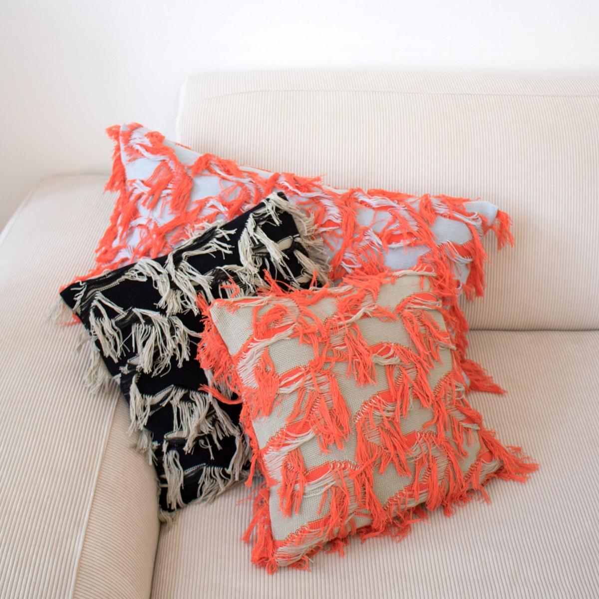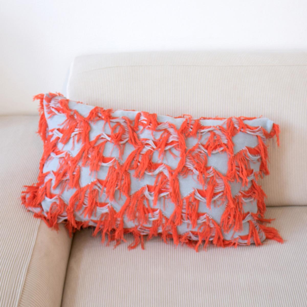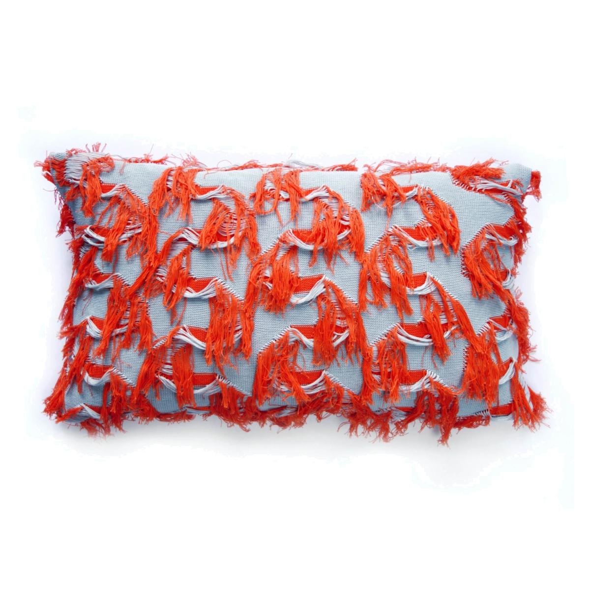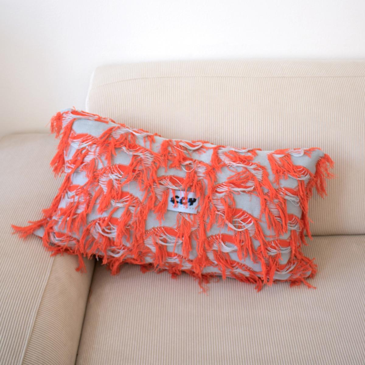 This pillow is made of 100% certified organic cotton from Italy in a special fringe knitting technique that has been developed by CCY currency for this collection. With this funky fringy object you are sure to bring some extra excitement in your living room, either just by itself or mixed and matched with another size or colour. This version has a blueish grey background and coral red fringes. The pillow itself is filled with feathers from geese and ducks, made in Germany under OEKO-TEX® 100 standard. Like this, it is long-lasting and good for the environment of your home (no synthetic fibers or micro-plastics). The pillowcase has a zipper opening so it can be easily taken off the pillow to wash it. The pillowcase is made in Germany, the textile is made in Italy
