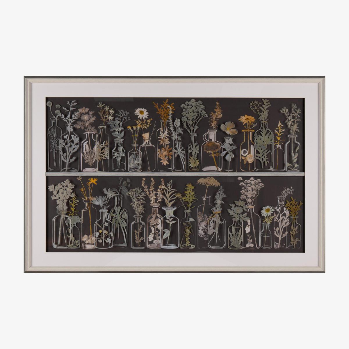 Bring the beauty of nature indoors with The Verdant Collection. This captivating wall art showcases a series of glass bottles, each delicately filled with lush foliage and vibrant flowers. Metallic foil accents subtly highlight the details, adding a touch of elegance and modern charm to the piece.