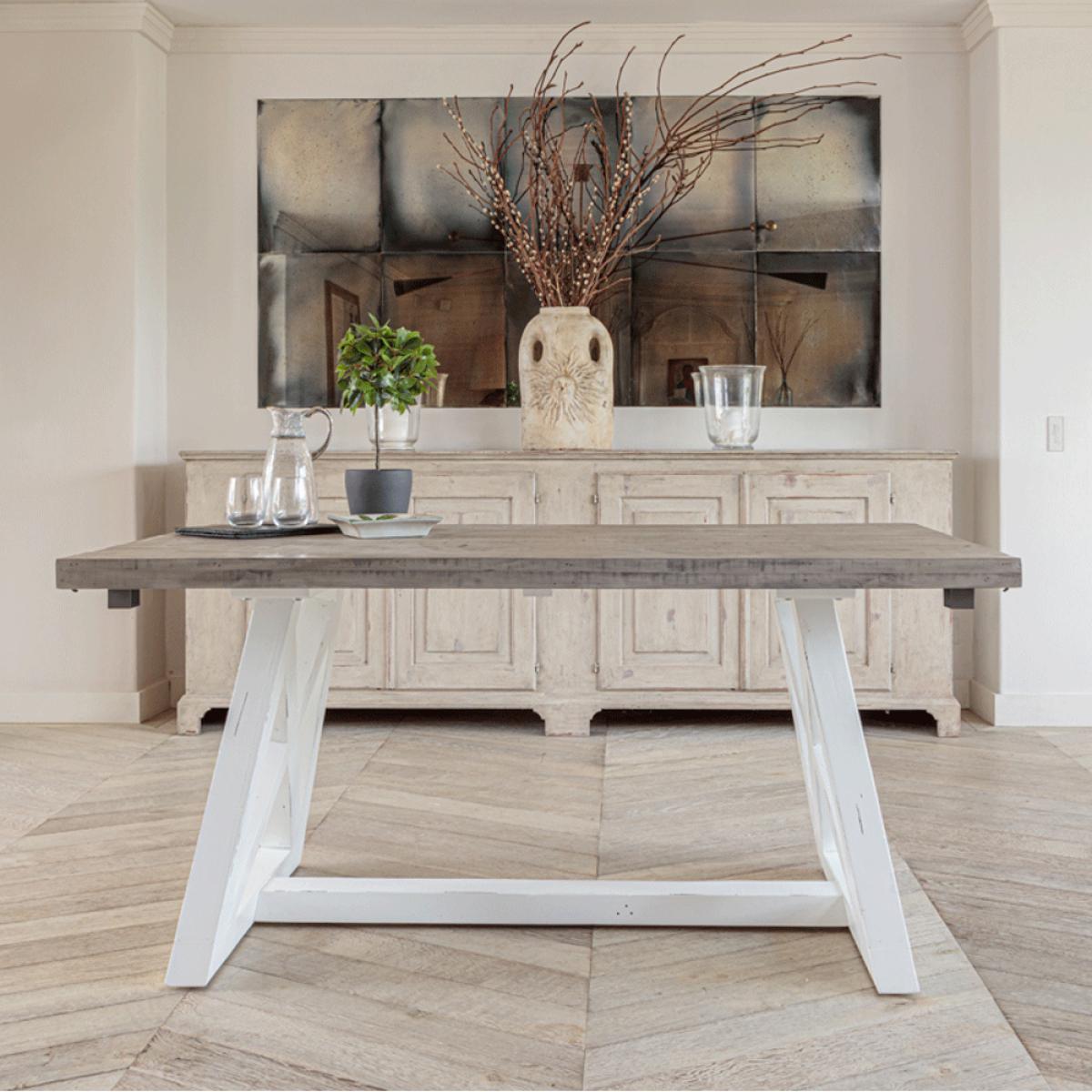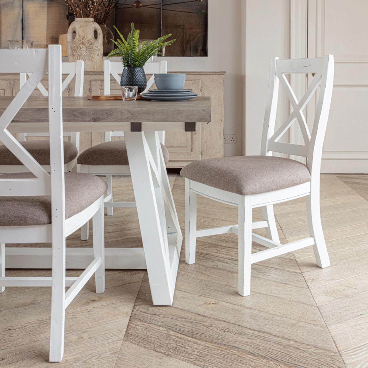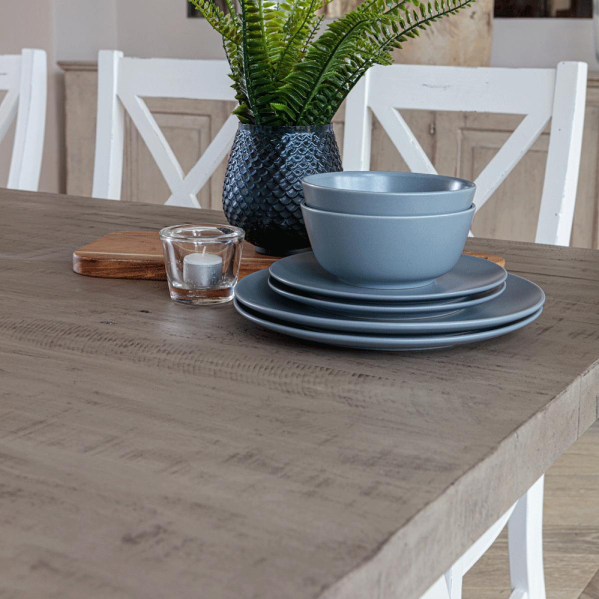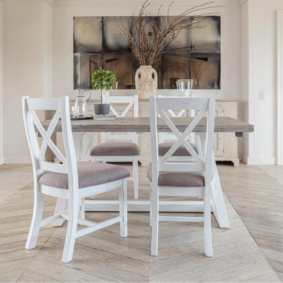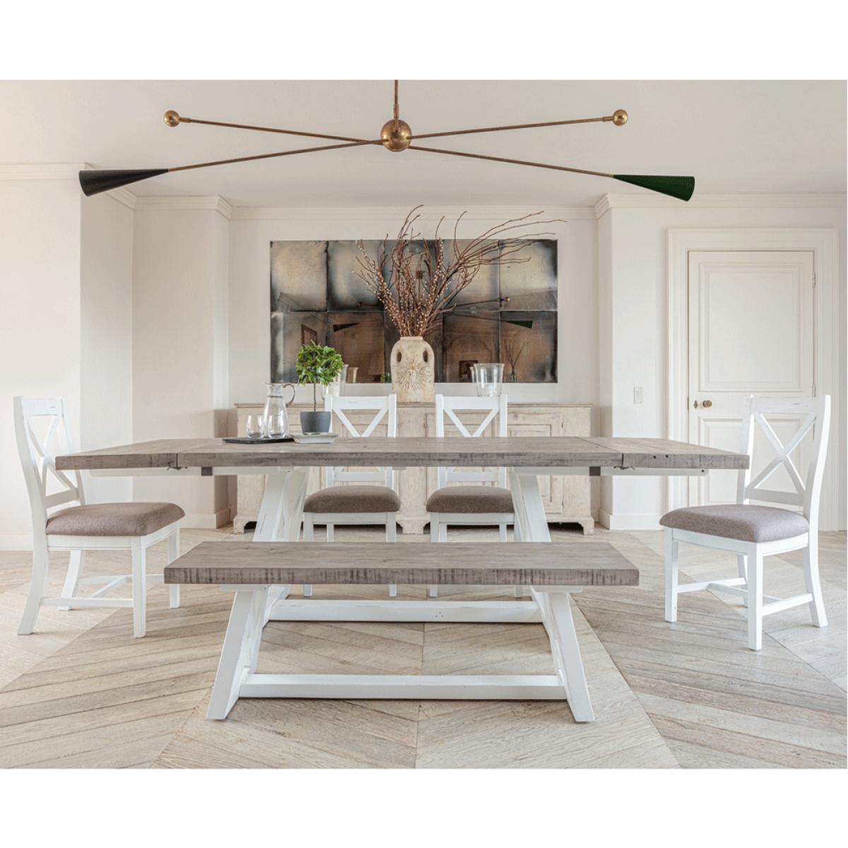 Special Offer – 10% Off When Purchased As A Set!. Elevate your kitchen or diningspace with The White and Grey 1. 6 metre Extending Table Dining Set, whichincludes:. Key features:. Why not check out some of the other products available in. The White and Grey Range. More info. A pure white painted frame coupled with themusty grey of the thick worktop places this dining table as a core favourite of the Inside. Out Living catalogue. The entire rustic dining set, inclusive of chairs and bench, are constructed from thick and sturdy reclaimed pine. The unmistakable cross construction of the table base means this pine table set radiates rural charm. Indeed. There are even areas on the wood itself that have been purposely distressed and worn away, adding to the pleasingshabbychicaesthetic. The White and Grey dining bench nicely complements the table with a length of 1. 4metres, easily able to seat two, or even three at a push. It would also look lovely stood alone in a hallway or porch, to provide extra surface area for ornaments and ad hocseating as required. The White and Grey dining chairs provide wide reaching and plump padded seats made of a grey-taupe colour, thick weave fabric that’s UKFR fire proof approved. The same cross construction seen on the table is also fours on the backs of the chairs, which rise pleasingly and provide high reaching back support. Add the extension leaf to the table, which handily slots into the end with 2 jousts and easy fastenings, to seat up to8 people!.