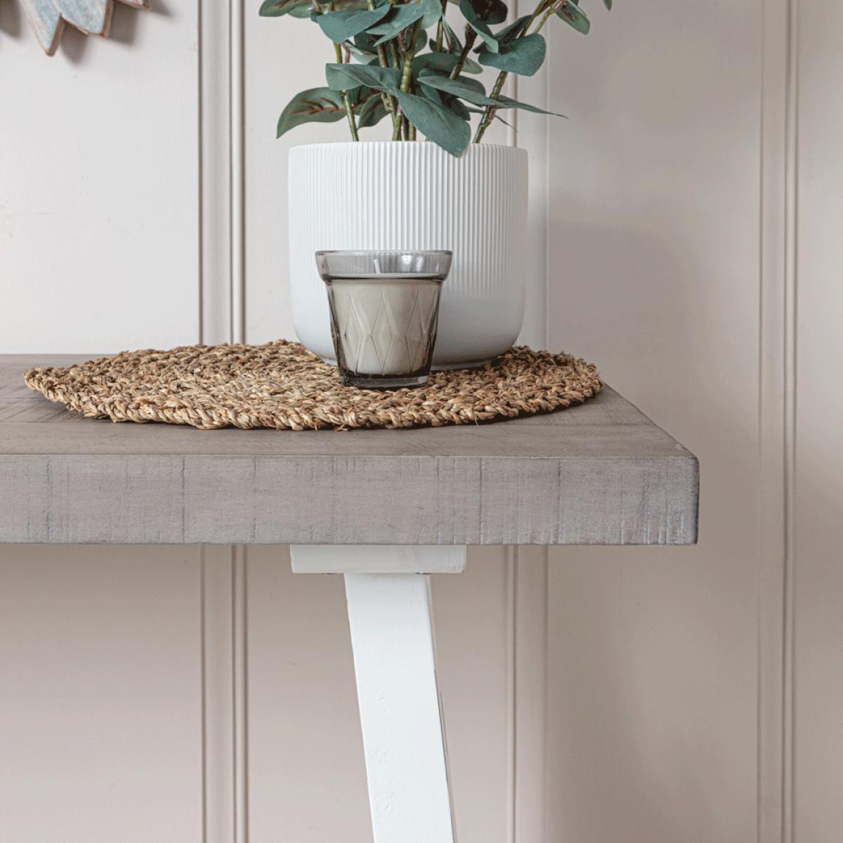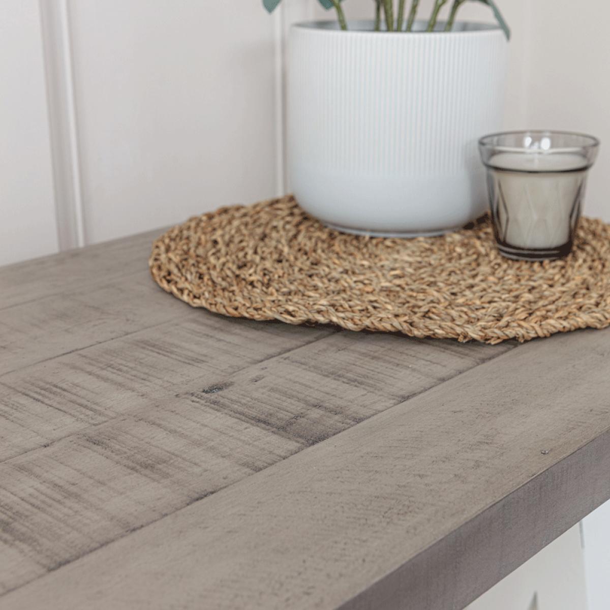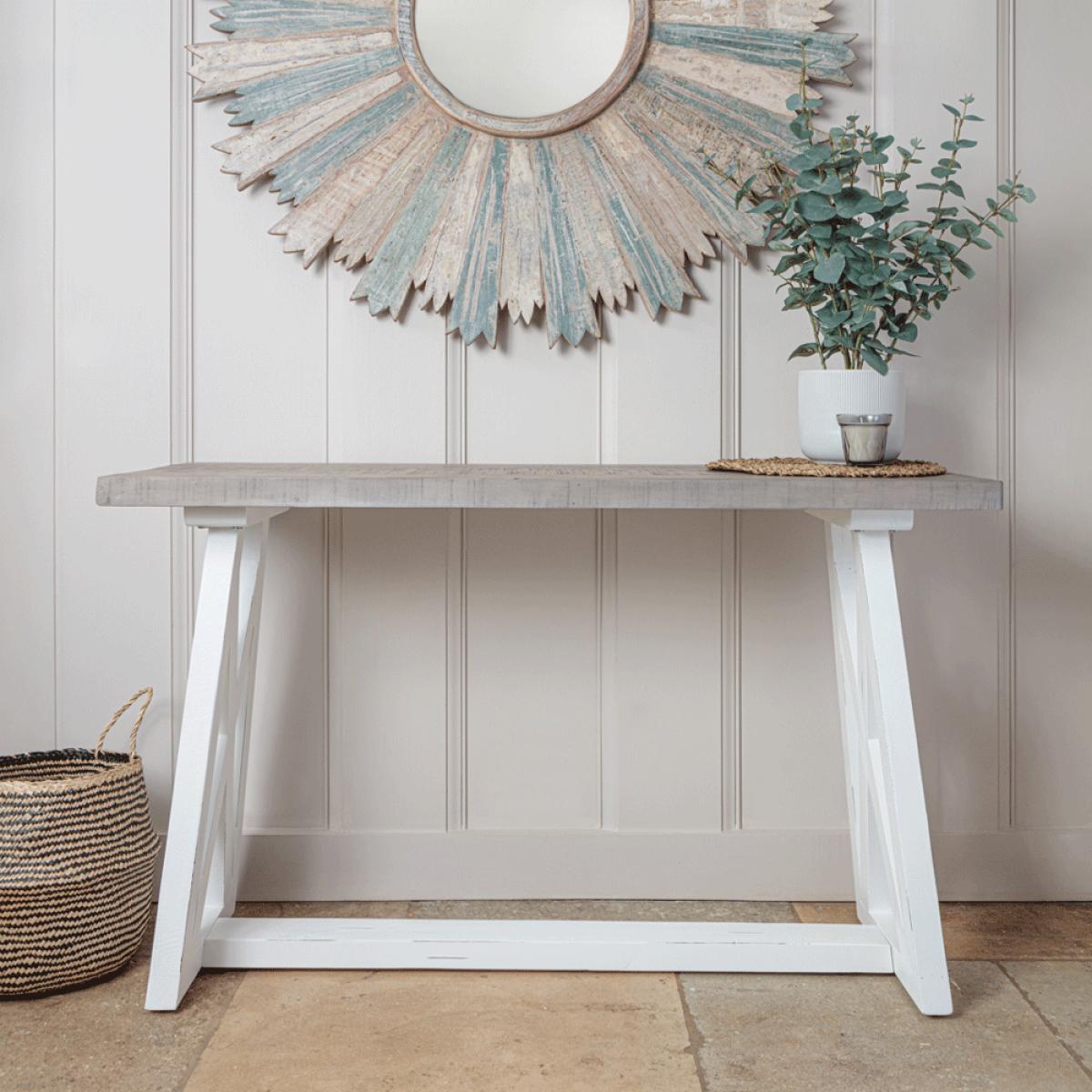 This White and Grey Console Table is a special addition to any indoor space. The bright true-white of this chunky frame brings a light and airy aesthetic into the home but with plenty of rustic magnetism to boot. It is a stylish console table made entirely of reclaimed pine. The thick-set frame has a traditional cross design on both supporting ends with a central floor hugging bar increasing its stability. A grey distressed tabletop contrasts the bright white frame, also pleasingly thick in design. The work surface, as well as the frame, displays small purposely worn areas adding to the rural charm of this pine console table. Standing at 76cm tall this table exhibits a favourable height for displaying ornaments, framed pictures, potted plants or simply placing a bowl for keys and trinkets. Why not check out some of the other products available in. The White and Grey Range.