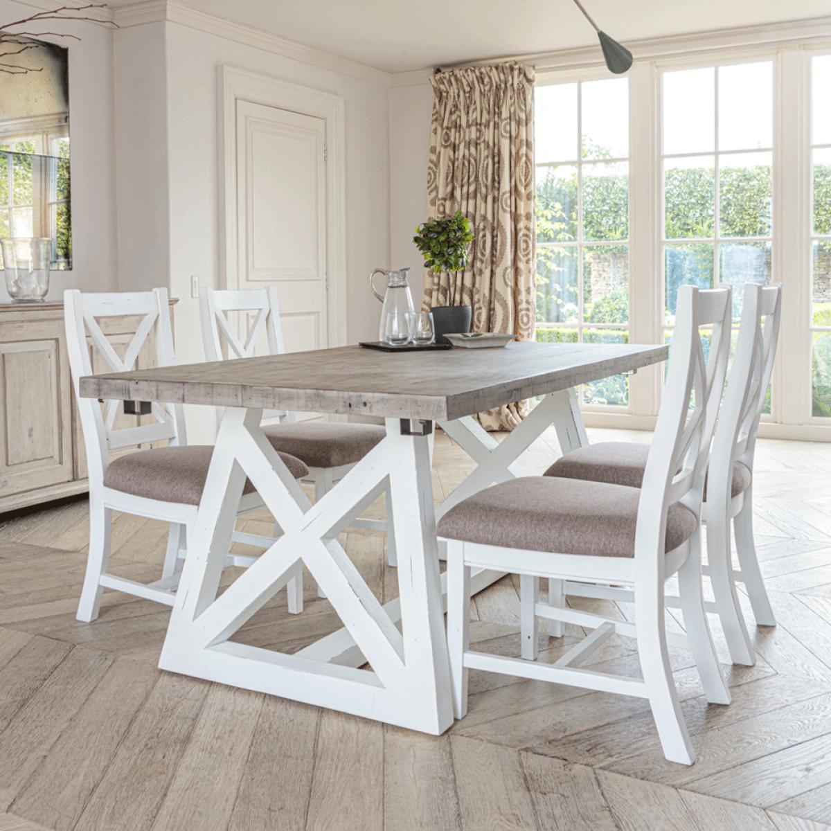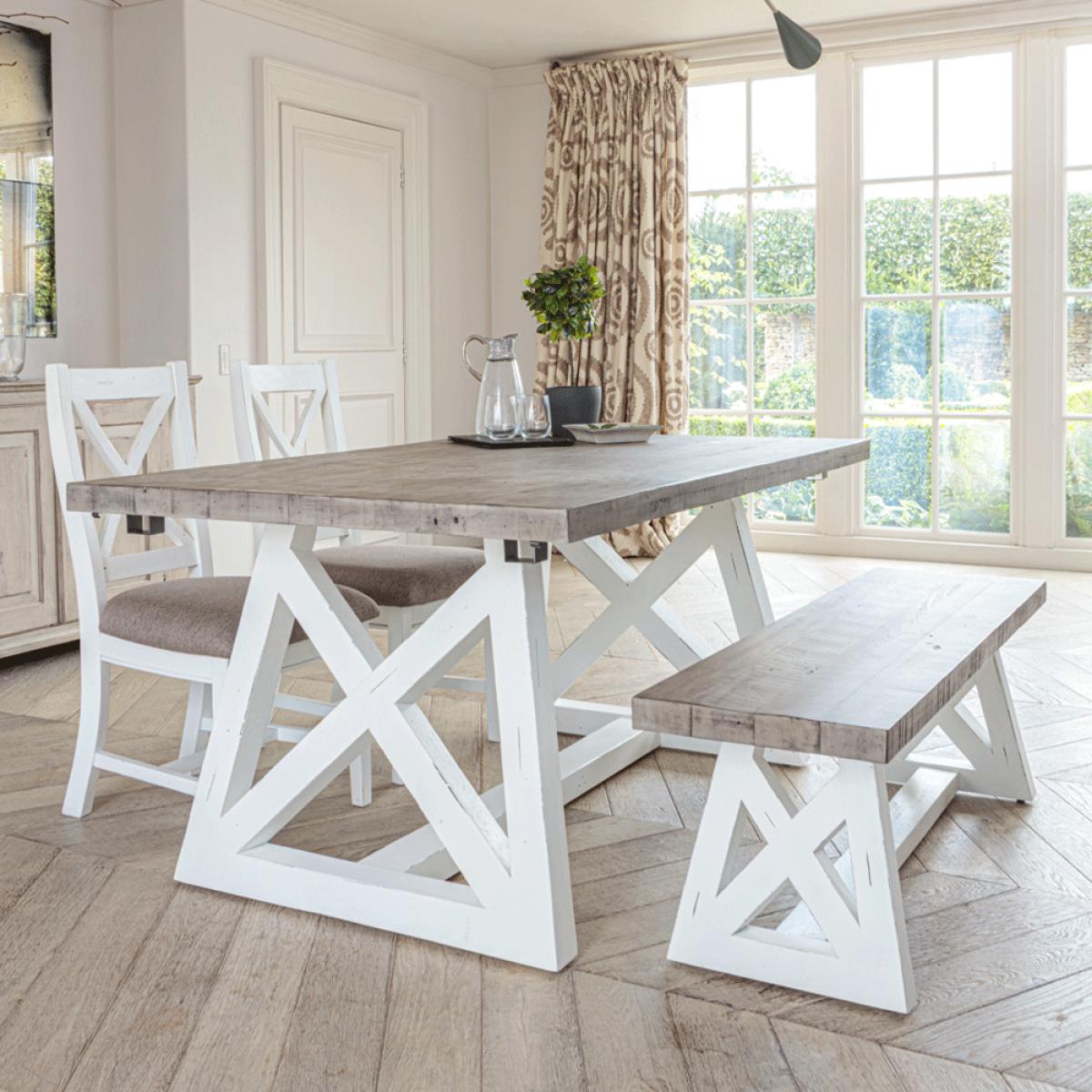 Introduce instant rural charm into your home with The White and Grey Extending Dining Table 1. 6 metre. Key features. More info:. The White and Grey Pine Extending Dining Table 1. 6 metre will fill your home with a rustic charm. This thick set table is sure to survive the rigours of the day to day and will look all the better in years to come. The shabby chic aesthetic means there are pre worn areas that add to the irresistible country appeal of this popular dining table. This 1. 6m pine table is constructed entirely from reclaimed pine, the grey woodwork top is a substantial surface that has lovingly gone through a process of grey colour washing, adding to the weathered appeal. This rustic dining table is able to extend to 2 metres with the addition of one. Extension leaf, sold separately. , an attachment which handily slots sturdily into the end of the table with fixed jousts, rather than pulling from the middle section. This also means, with two leaves, that both ends pleasingly extend for those busy hosting occasions, easily seating 8. Even able to seat 10 people (with both attachments inserted). Extension leaves are to be purchased separately,. This considerable table boasts a true-white cross structure frame that is even chunkier than the tabletop. Purposely worn and distressed areas serve to add to the rustic charm and in no way effect the integrity of this large dining table. The grey tabletop fittingly accents the bright white of the table frame making it the perfect surface to serve breakfast, lunch and dinner upon. Best paired with the White and Grey dining chair or the White and Grey bench. Discount available if purchased as part of a dining set. To view. Why not check out some of the other products available in. The White and Grey Range.