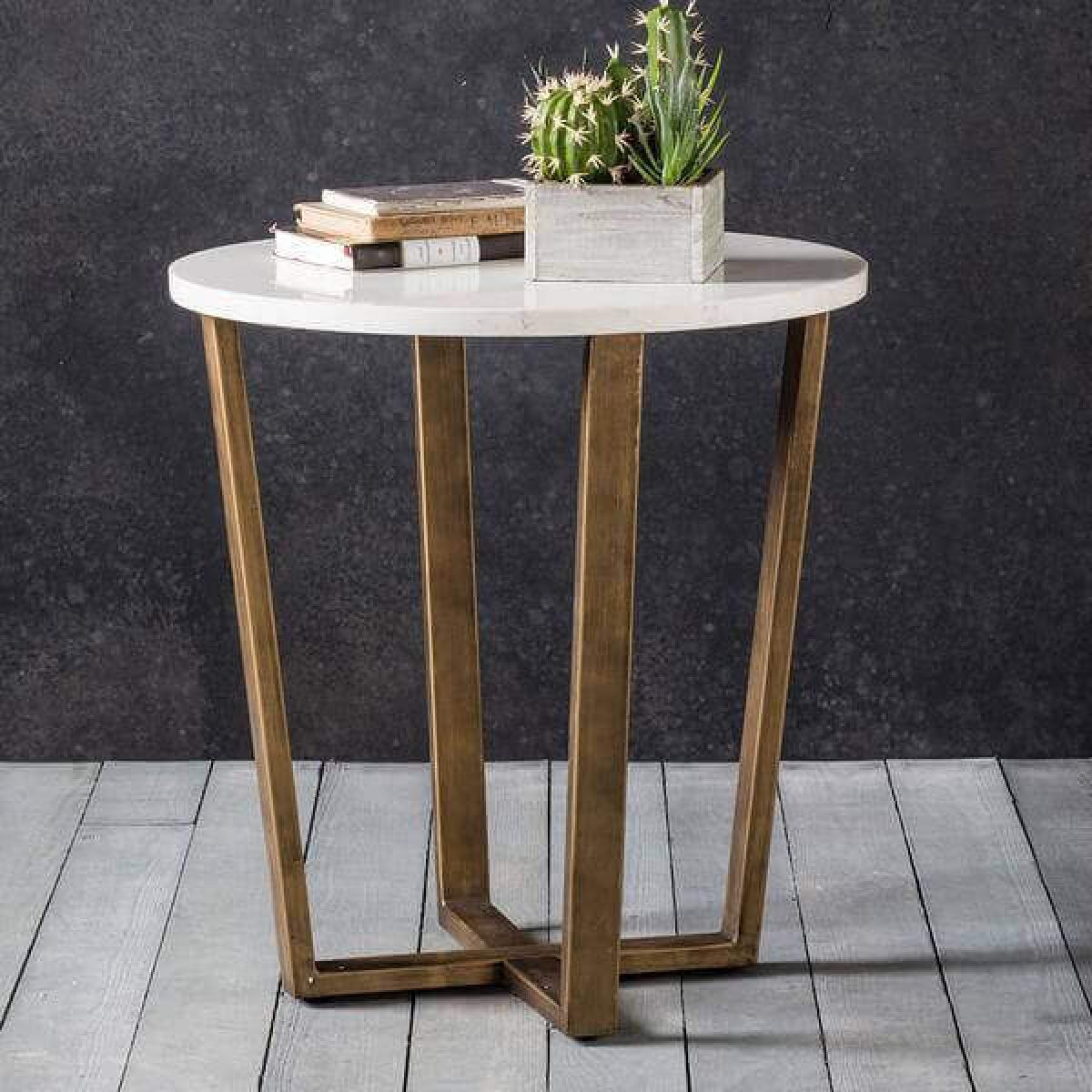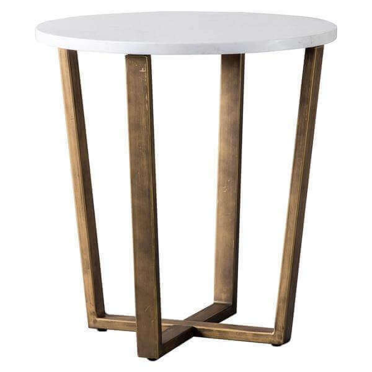 The White Marble Side Tablehas a beautiful white marble top with grey vein detailing and a brushed bronze metal frame.