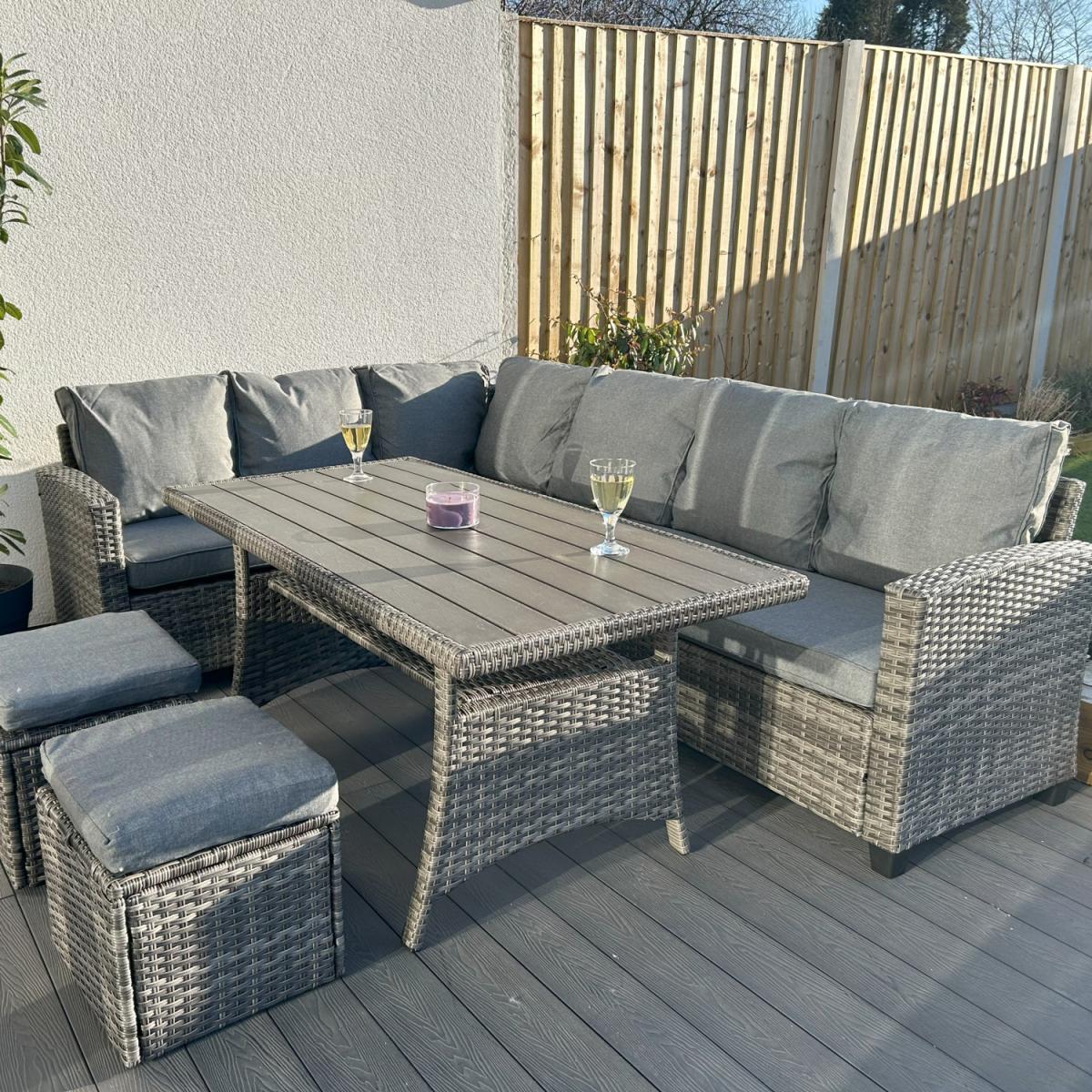 Introducing the York Rattan eight seat corner dining set in a stylish shade of grey. Elevate your outdoor living space with this exquisite rattan dining set that seamlessly blends comfort, durability, and timeless elegance. Crafted with care, this corner rattan set effortlessly accommodates up to eight guests, making it perfect for entertaining family and friends. The thick cushions provide exceptional comfort, allowing you to unwind and enjoy memorable moments. Designed for all seasons, this set is waterproof and UV resistant, ensuring its longevity and vibrancy even under the harshest weather conditions. Relax knowing that your investment is protected for years to come. The stunning image showcases the sleek lines and modern design of the York Rattan set. The mixed grey colour adds a touch of sophistication to any outdoor space while effortlessly complementing various decor styles. Whether you're hosting a summer soiree or enjoying a quiet dinner alfresco, the York Rattan eight seat corner dining set elevates your outdoor dining experience to new heights. Create lasting memories in style with this exceptional piece of furniture. Upgrade your outdoor living space with the York Rattan eight seat corner dining set in grey today. Experience luxury, comfort, and beauty like never before.