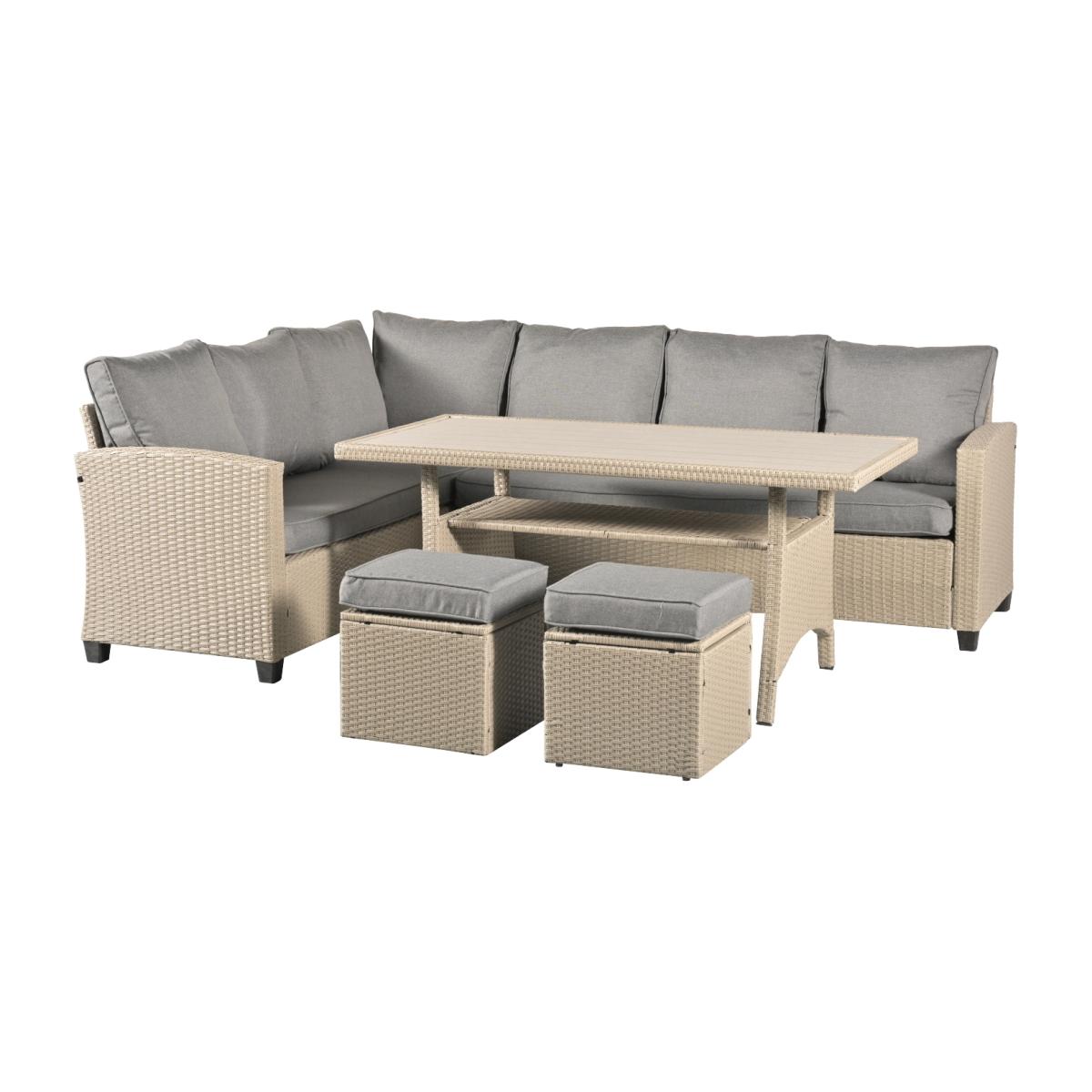 Introducing the York Rattan eight seat corner dining set in a stylish shade of grey. Elevate your outdoor living space with this exquisite rattan dining set that seamlessly blends comfort, durability, and timeless elegance. Crafted with care, this corner rattan set effortlessly accommodates up to eight guests, making it perfect for entertaining family and friends. The thick cushions provide exceptional comfort, allowing you to unwind and enjoy memorable moments. Designed for all seasons, this set is waterproof and UV resistant, ensuring its longevity and vibrancy even under the harshest weather conditions. Relax knowing that your investment is protected for years to come. The stunning image showcases the sleek lines and modern design of the York Rattan set. The mixed grey colour adds a touch of sophistication to any outdoor space while effortlessly complementing various decor styles. Whether you're hosting a summer soiree or enjoying a quiet dinner alfresco, the York Rattan eight seat corner dining set elevates your outdoor dining experience to new heights. Create lasting memories in style with this exceptional piece of furniture. Upgrade your outdoor living space with the York Rattan eight seat corner dining set in grey today. Experience luxury, comfort, and beauty like never before.