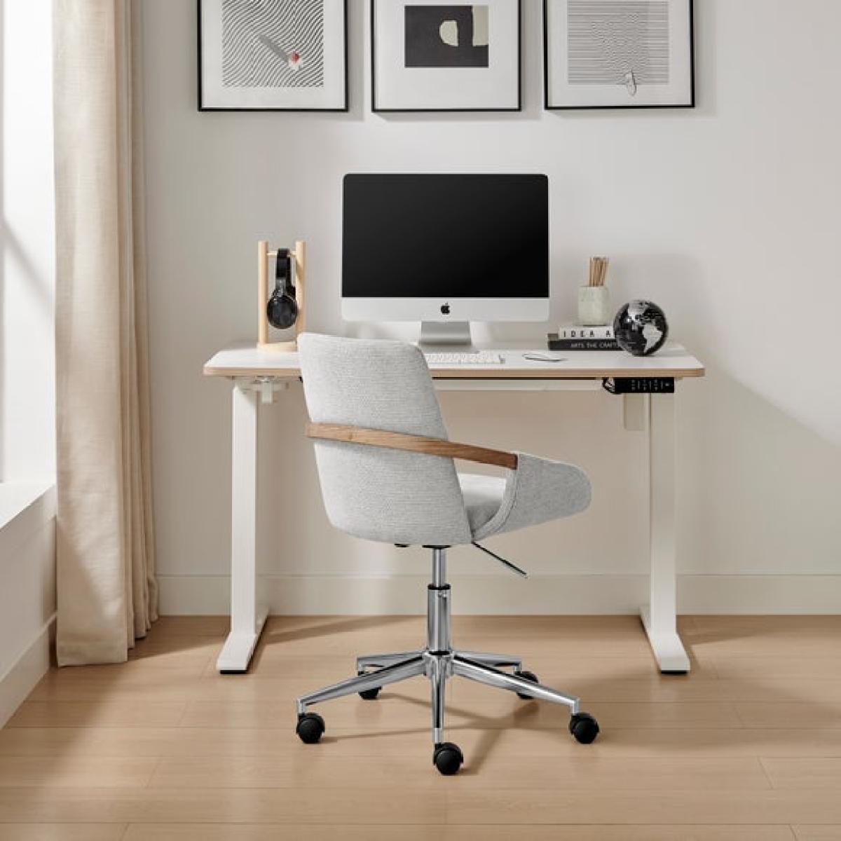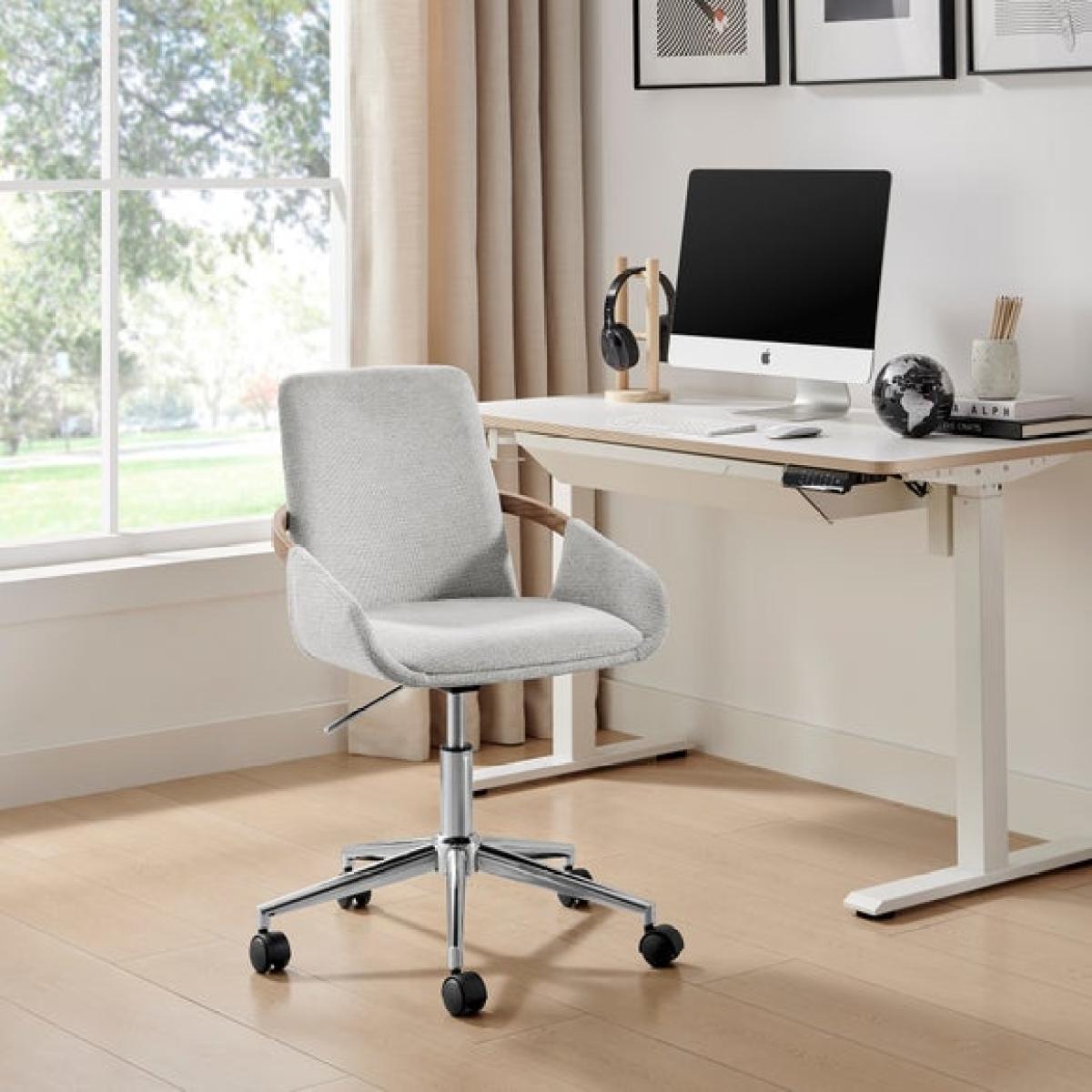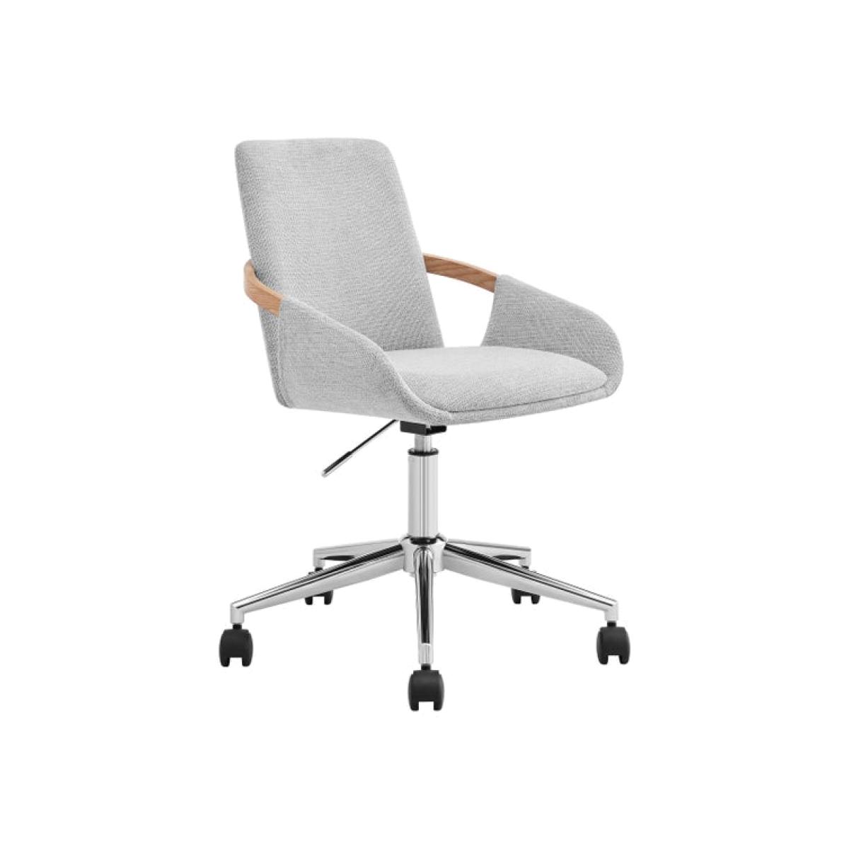 I love this office chair for its clean, contemporary design and neutral colour palette, making it versatile for a range of interiors from minimalist to Scandinavian-inspired spaces. Its soft grey fabric adds a touch of comfort and warmth, while the wooden side handles bring a subtle natural detail that works beautifully in both modern and more eclectic setups. Practical styling tips include pairing it with a sleek desk and a cosy desk accessories for a streamlined workspace, or placing it alongside a textured rug and houseplants to soften a more industrial or modern environment. Its adjustable height and swivel base ensure functionality without compromising style, making it an easy addition to any home office.