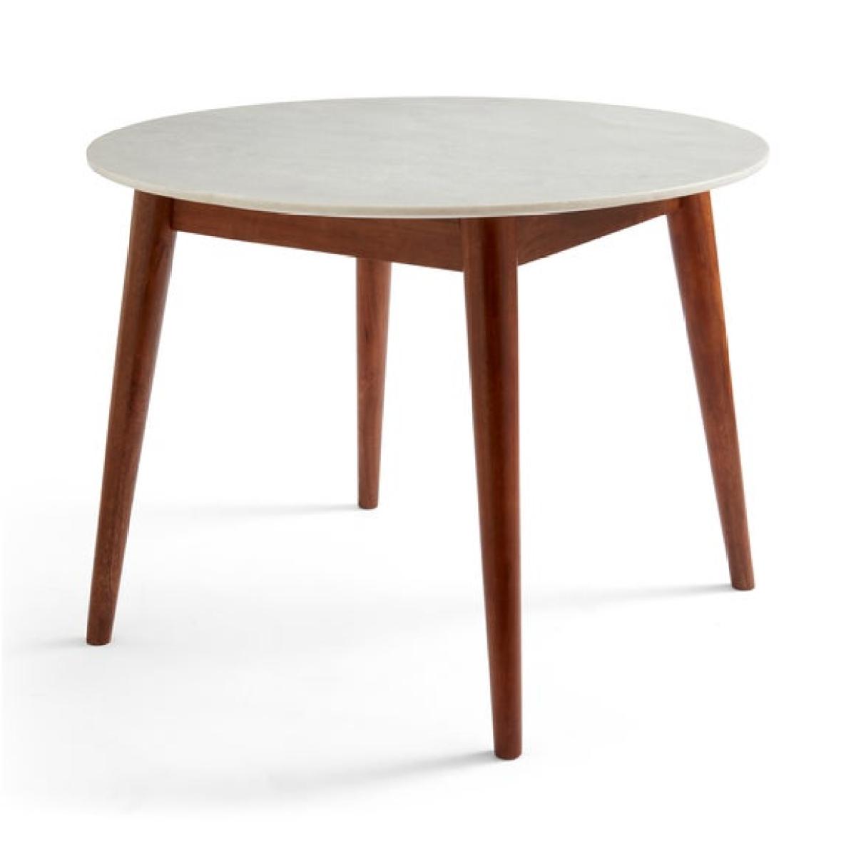 * Modern dining table * Real marble table top * High quality mango wood legs The Thea dining table brings a touch of luxury to compact spaces. Its beautifully crafted marble tabletop offers a refined, polished surface that elevates any dining area, while the round shape encourages intimate, sociable dining. Supported by sturdy, dark-stained legs, the table balances elegance with everyday practicality.