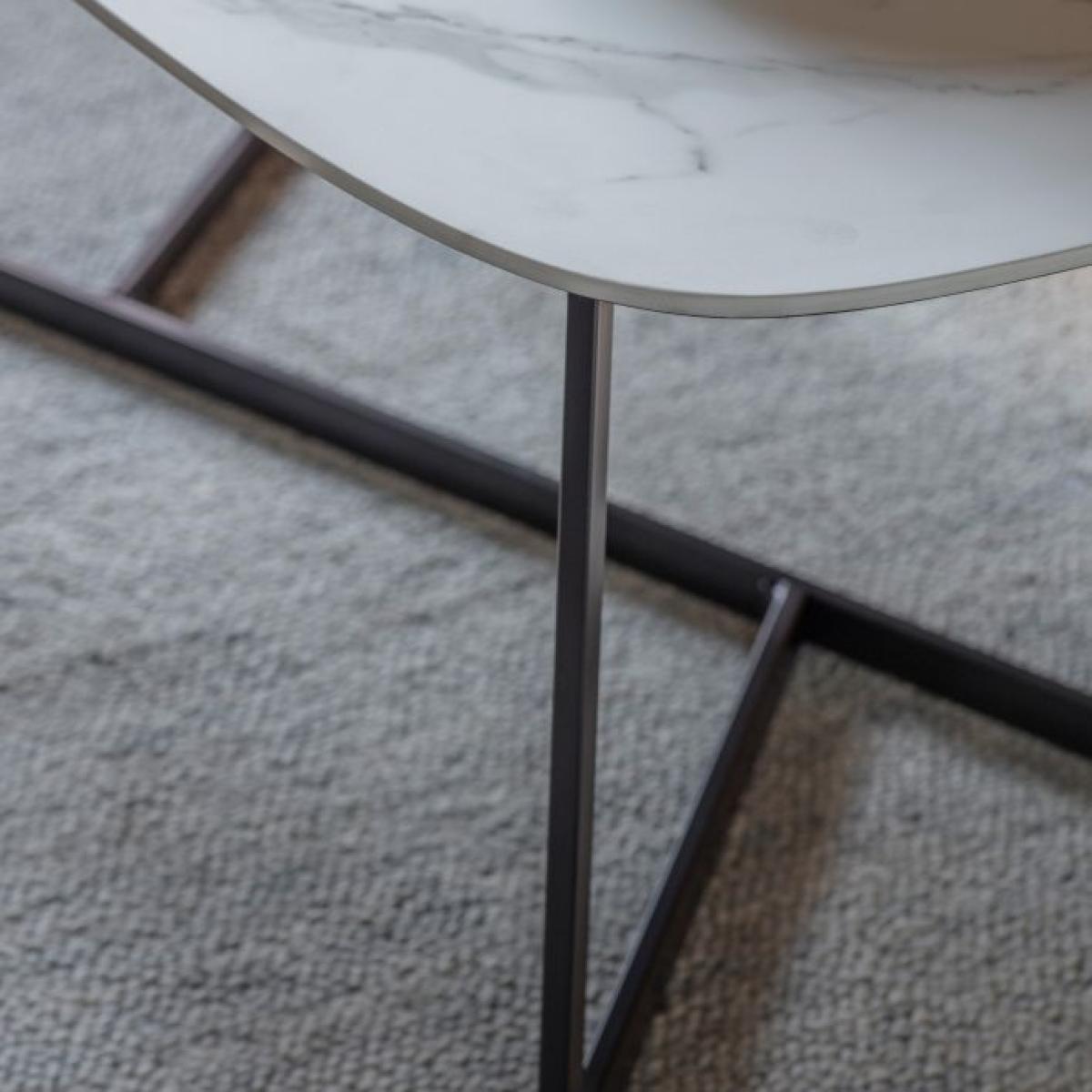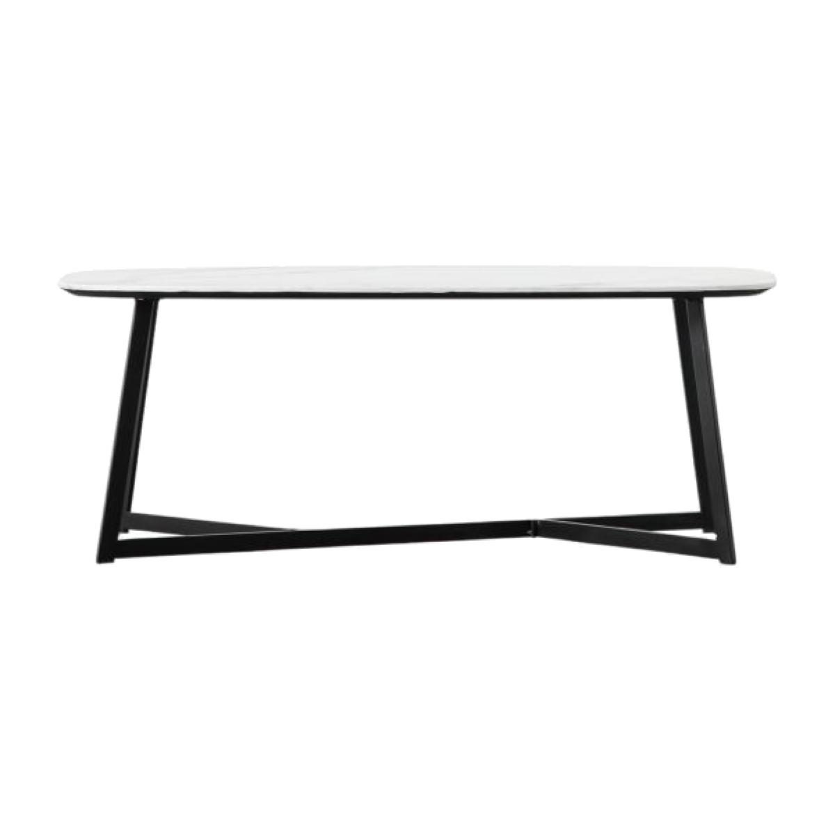 Offering a modern twist to a mid-century look, this lovely coffee table combines faux white marble with a black metal base with an unusual stepped cross design. The collection is part of our Packed-Flat Design Project, offering easy delivery to any room in any property, whilst reducing the packaging needed. Easy assembly is required, but all the tools needed are supplied. Material:Faux Marble. Colour/Finish: White. Table Shape: Oval.