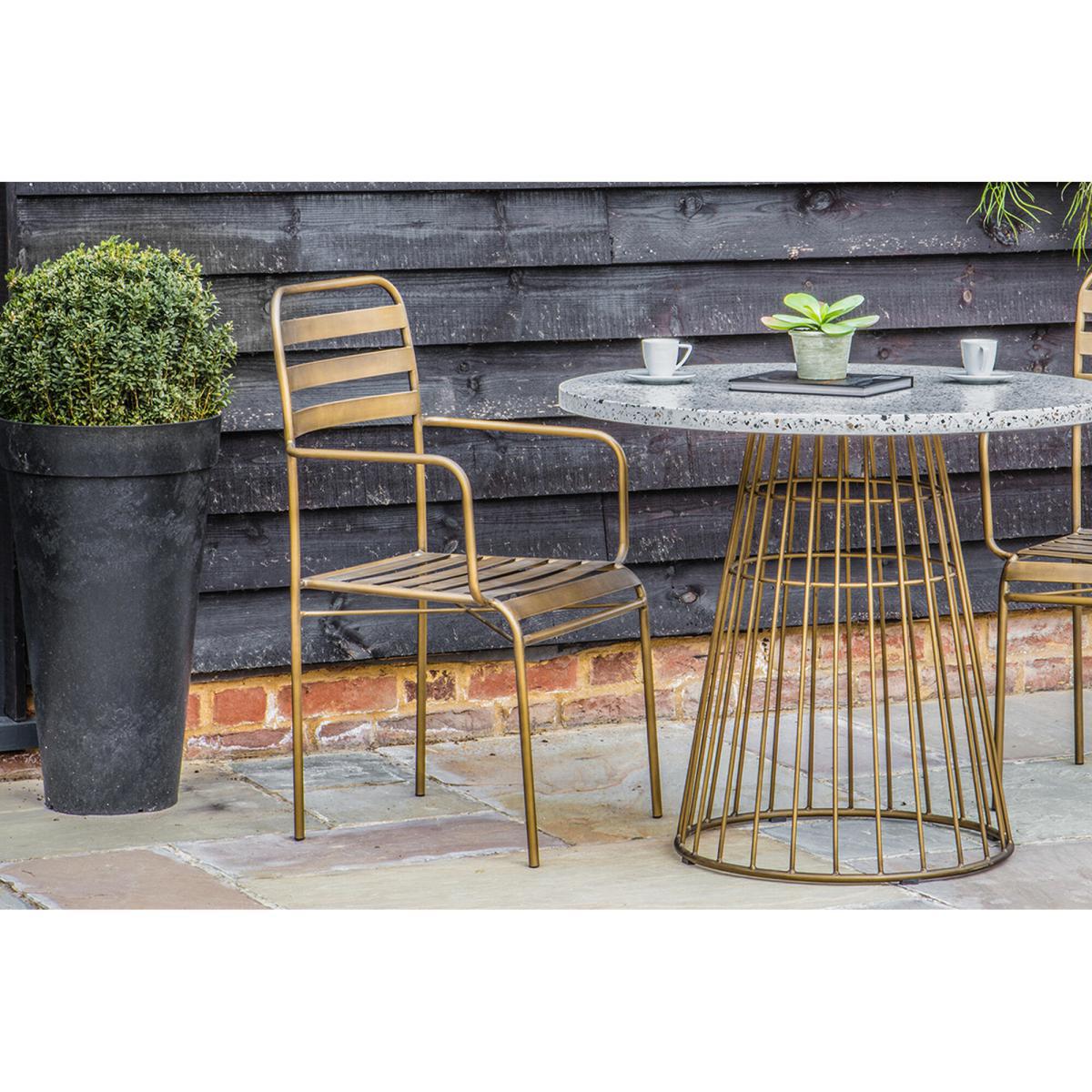 Transform your everyday dinners into an exceptional dining experience with the Thelma bistro armchair. This robust dining armchair, which is suitable for both outdoor and indoor use, has a slim metal frame with arms and a Vintage Bronze finish. The Thelma is perfect for giving your dining room a dramatic look or for enjoying al fresco dining in style - pair with our Louise dining table for a fiercely stylish, glamorous duo that will steal the show.