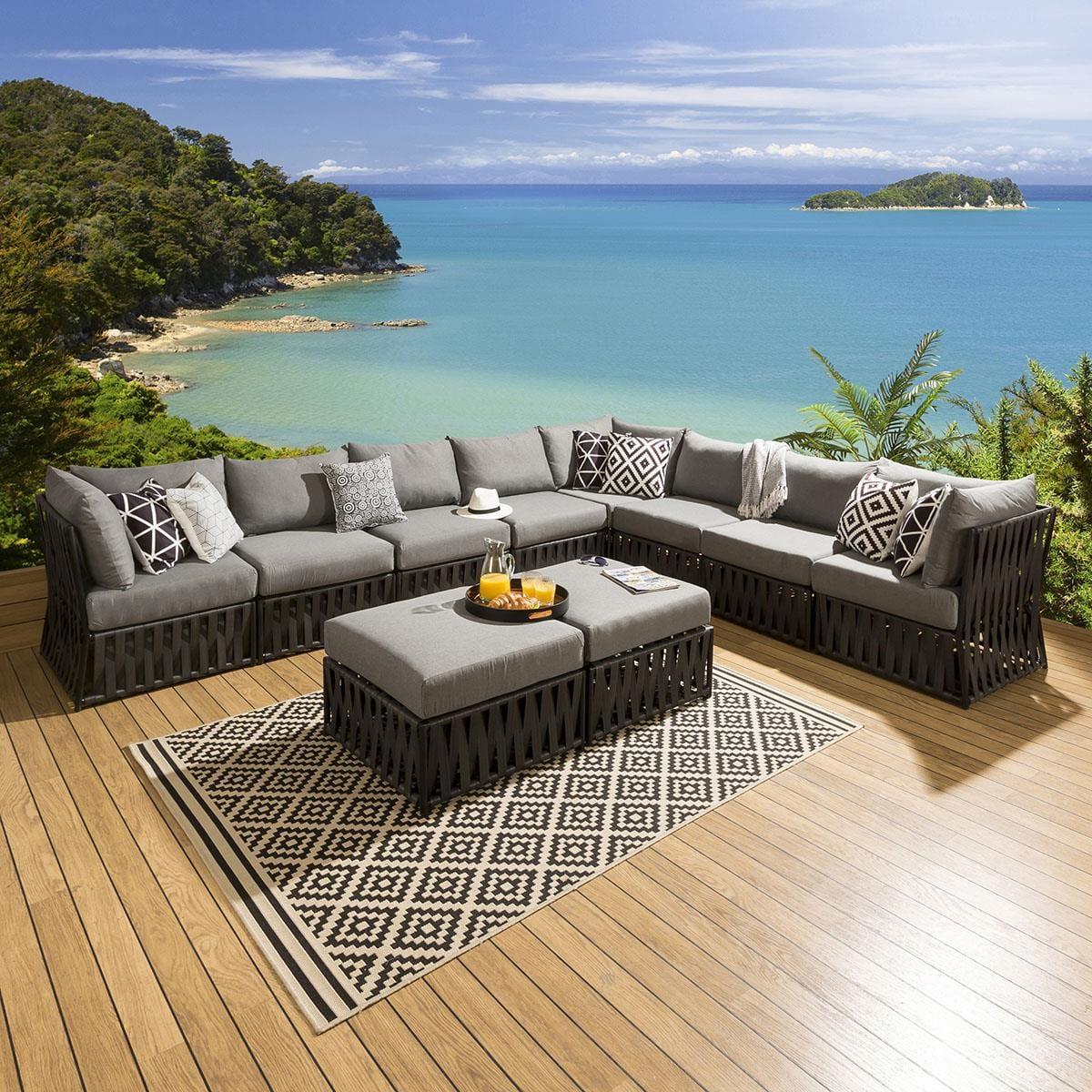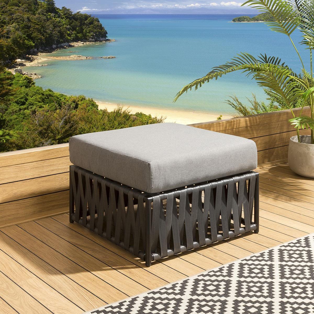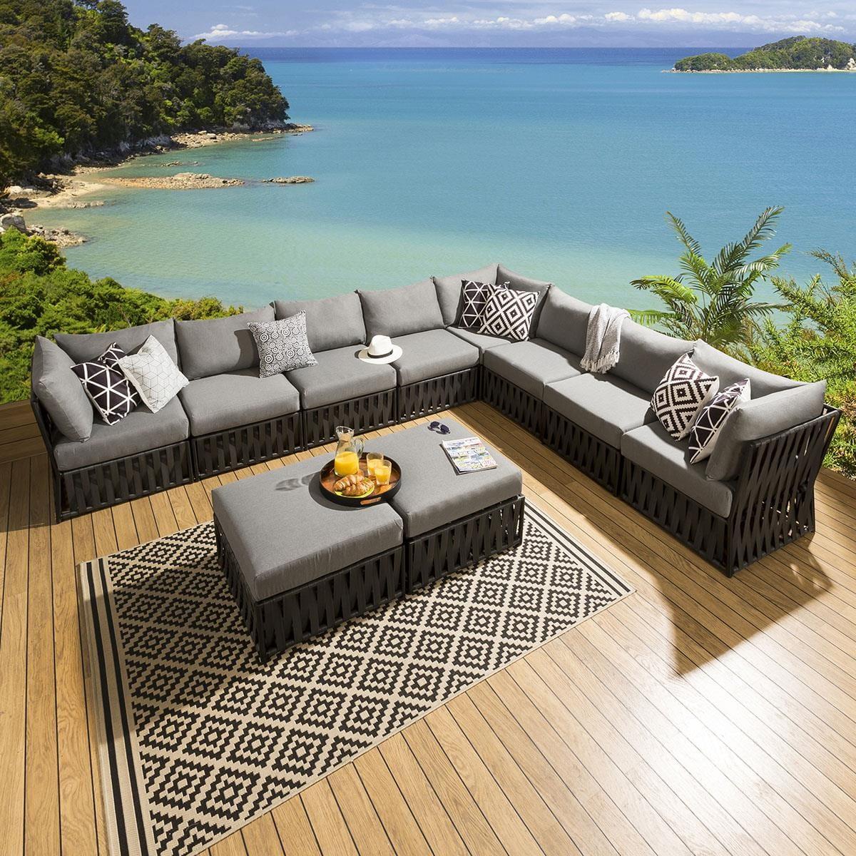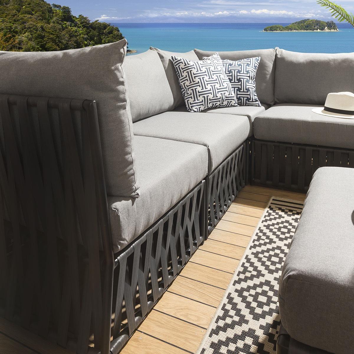 The Theo modular L10 garden sofa set in brushed black rattan with medium grey cushions by Quatropi is the 10 piece set from the Theo modular garden sofa range. The set consists of 5 middle and 3 corner modules, plus 2 footstools, creating a luxury, enclosed garden corner sofa set. The coffee table also comes with a detachable cushion so it can be used as a footstool, or connected to the sofa as a chaise-end. All sections come with their own free winter cover. The set is made from high-grade aluminium which makes it very strong and designed in a way to make it as light and simple as possible. The frame is sturdy and has an intricate rattan weave that blends traditional with contemporary. It offers an unexpected alliance between the design minimalism of its metallic structure and the artisanal warmth of its hand-woven rattan. The weather resistant cushioning is created with high-density foam for long-lasting support which provides ultimate comfort for those long summer dinner parties. The cushions are upholstered in a gorgeous medium grey outdoor fabric - part of the unique designer range of garden patio furniture exclusive to Quatropi. Ongoing maintenance of the sofa is easy, the frame and cushions can easily be cleaned with warm soapy water. The cushions are also detachable for when they are not in use. Relax in style with this expertly crafted rattan garden furniture and entertain guests in your garden for hours on end. Sit back and relax on Quatropi premium outdoor furniture, sipping summery cocktails and watch the world go by. Are you looking to spruce up your garden? Light but hard-wearing, poly-rattan is a great way to add some practical style. Whether it's perking up a patio or decking, rattan garden furniture will add some serious quality to your outdoor seating area. Our rattan dining sets are perfect for both gardens and patios, with a range of styles and sizes, no matter how big or small your outdoor space is, we've got a set to match. PU rattan has been developed to look like the genuine item without the weatherproofing issues. It's a great low/no-maintenance option for those who'd like to buy a set and forget about it for the summer season. It's waterproof, UV-resistant and should last considerably longer than its natural counterpart, but it'd still appreciate being covered with a waterproof sheet during colder periods to avoid damaging the material. The Theo range is a modular furniture set. They are unique so that you can expand on your current furniture set to create different arrangements to suit every situation. Whether it be making your furniture set larger, smaller or even if you want to split the sets into smaller chunks and have multiple lounging areas to use, then Quatropi modular garden furniture sets are for you. Explore the entire rattan garden furniture range by Quatropi. Our sets come in a range of colours, select from black, grey or brown rattan garden furniture, where you'll find our premium weave. With lots of styles to choose from, including dining sets, with stunning garden tables and chairs, as well as, modular corner sofas, bistro sets and patio chairs and table sets, with such a huge collection of garden furniture sets available you'll find a set suited to your style. Spread the cost our with interest-free finance options. Minimum spend applies. W360cm D290cm H75cm Fully Modular Sofa Set Rattan Detailing