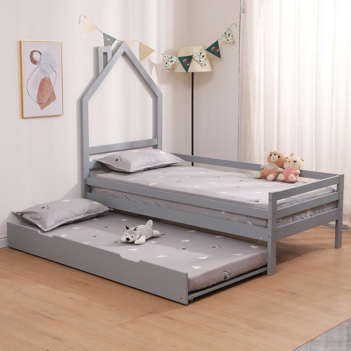 This cute Theo Kids Wooden House Style Bed Frame comes with a handy pull-out Guest Trundle. Featured in our Slumber Worx collection, this sturdy pine bed frame has solid wooden slats and a house-shaped headboard. The houseboard (see what we did there!) even has a little chimney, ideal for customising. Your child will have their own little home to sleep in each night. Hang up a name sign or bunting, or twist fairy lights for some extra magic. As this bed frame sits low to the ground, its perfect for moving your child into their first Big Kids Bed. The perfect option for sleepovers, reading bedtime stories, or for when parents want to sleep close by to their little ones. Available in Grey or White. Includes 2 x Dream Eco 10cm Deep Eco-Friendly Comfort Foam Single Mattresses.