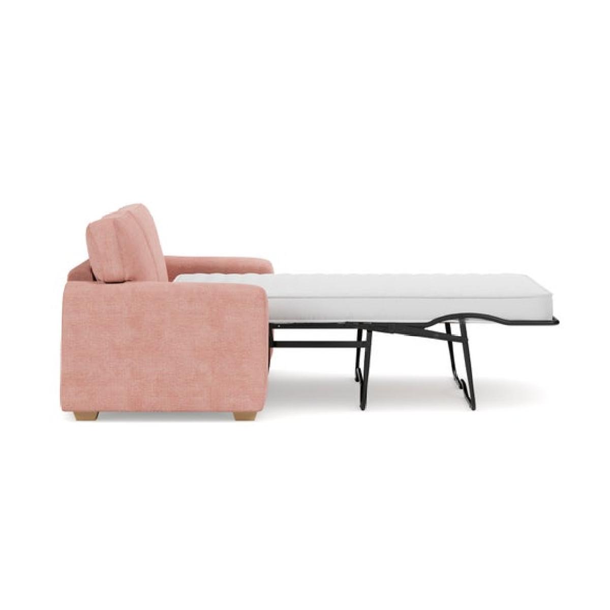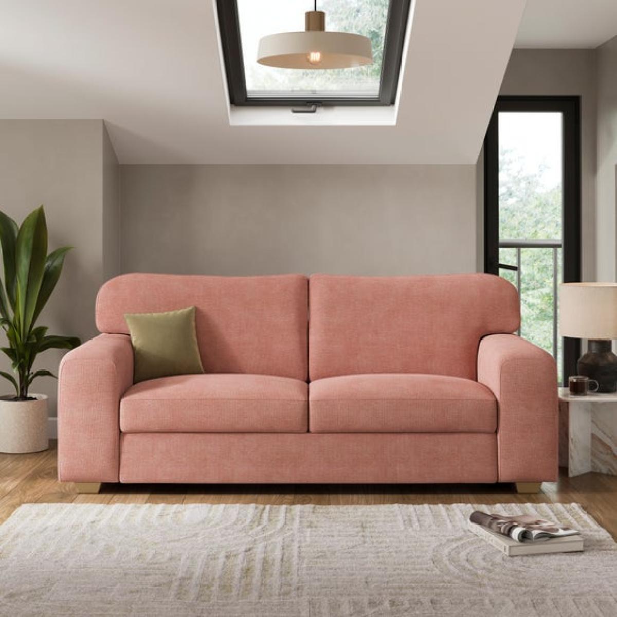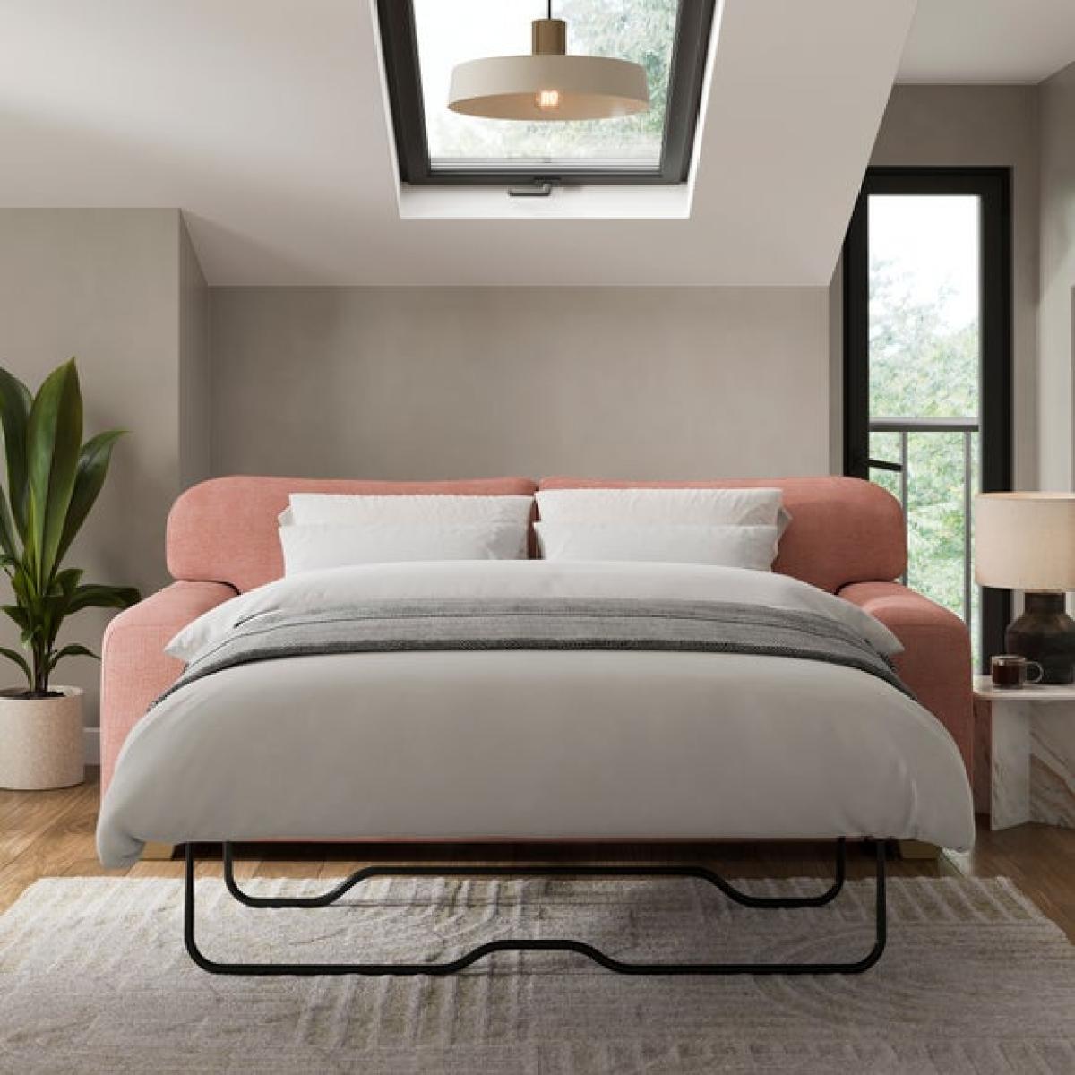 I love this sofa bed for its soft tonal chenille fabric, which adds a cosy, inviting feel to a space. It works particularly well in modern or contemporary interiors, especially when paired with muted colour palettes or natural textures. The pink shade offers a subtle pop of colour without overwhelming the room, making it versatile for various schemes. Practical styling tips include accessorising with a mix of cushions in complementary or contrasting tones, like the olive green one shown, to add visual interest. Its clic-clac mechanism makes it easy to transform into a bed, making it ideal for guest rooms or multifunctional living spaces. To keep the look cohesive, keep surrounding accessories minimal and let the sofa bed be a relaxed, central feature.